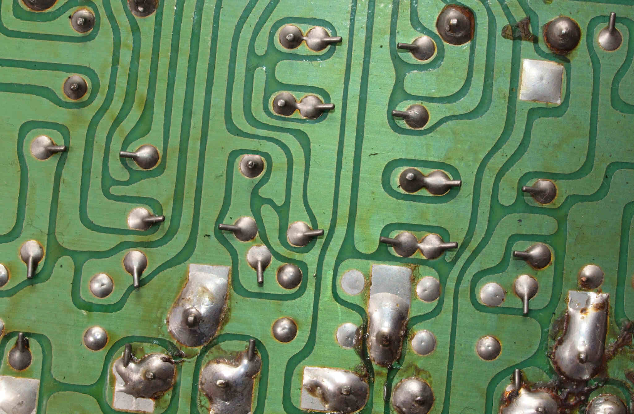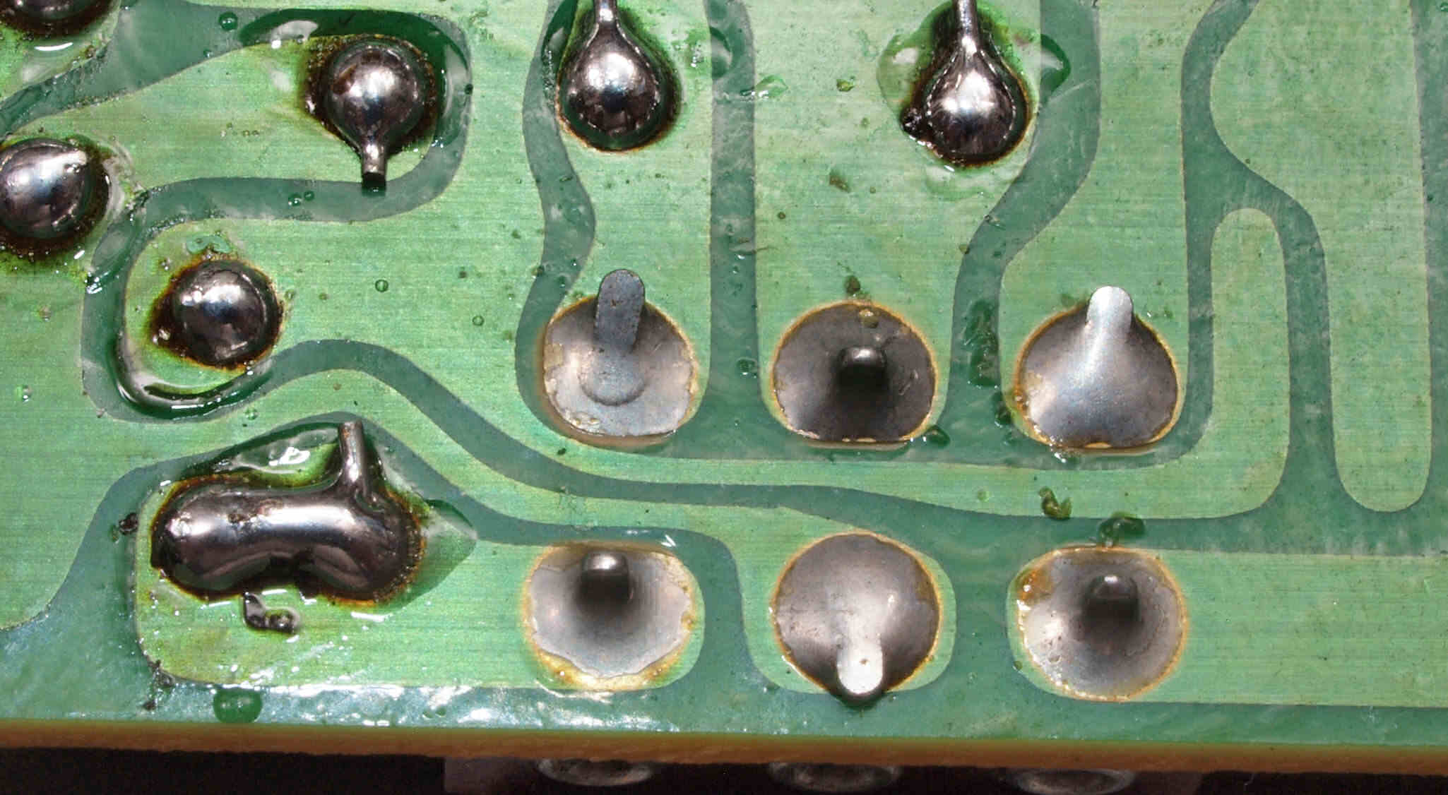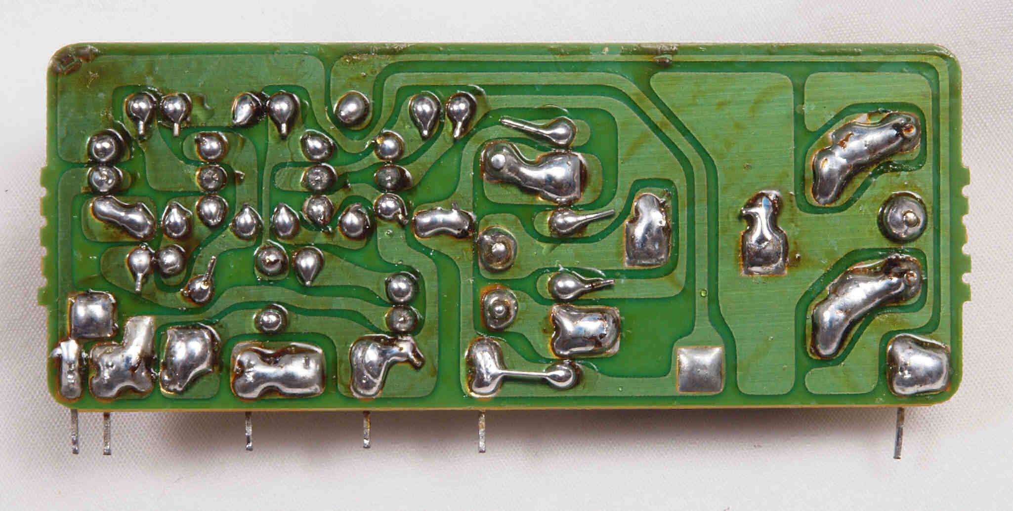 | C132. 修理中 EQ−HEAD-AMP基板裏。 曲げる方向が悪く隣の銅箔に? 他にも沢山あり。 | ||||||||||||||||||||||||||||||||||||||||||||||||||||||||