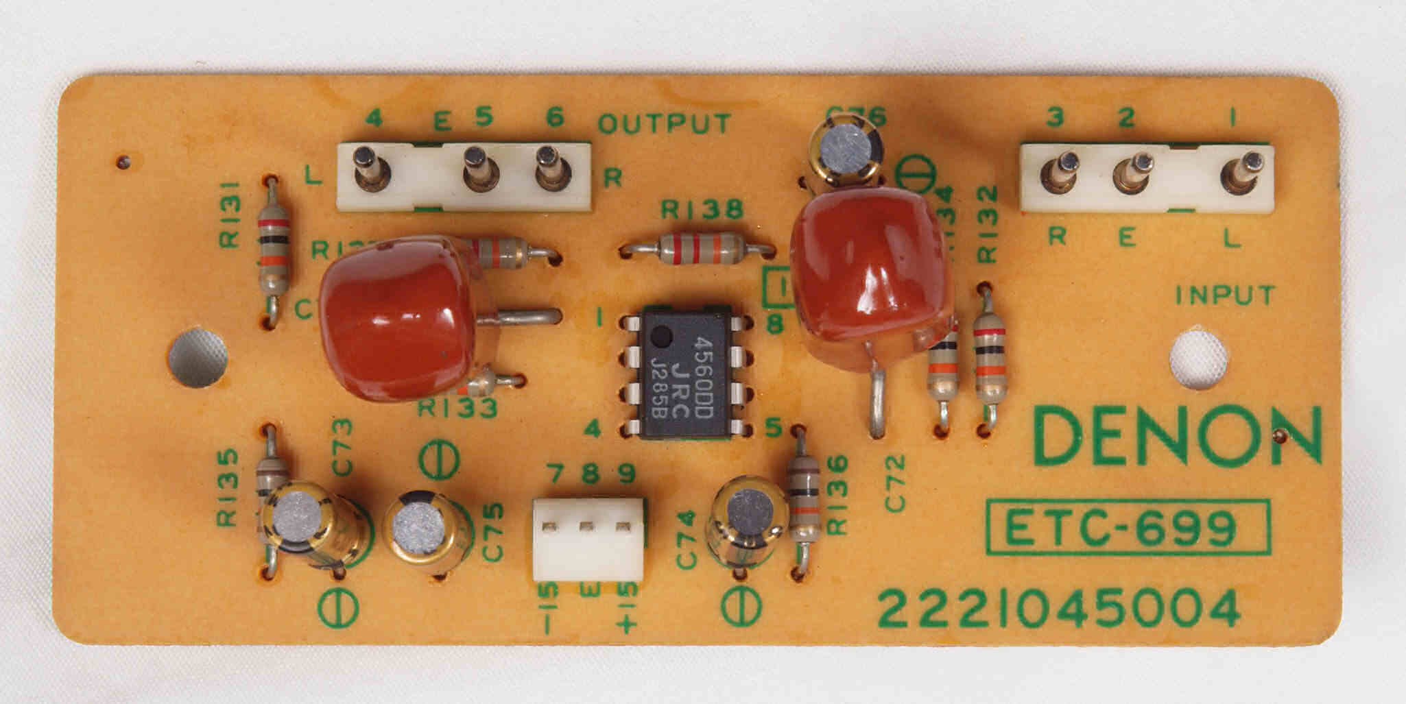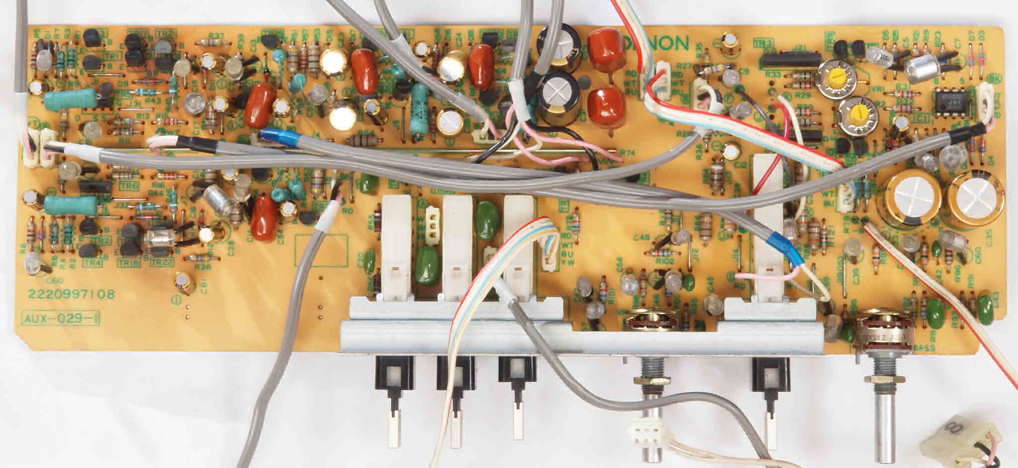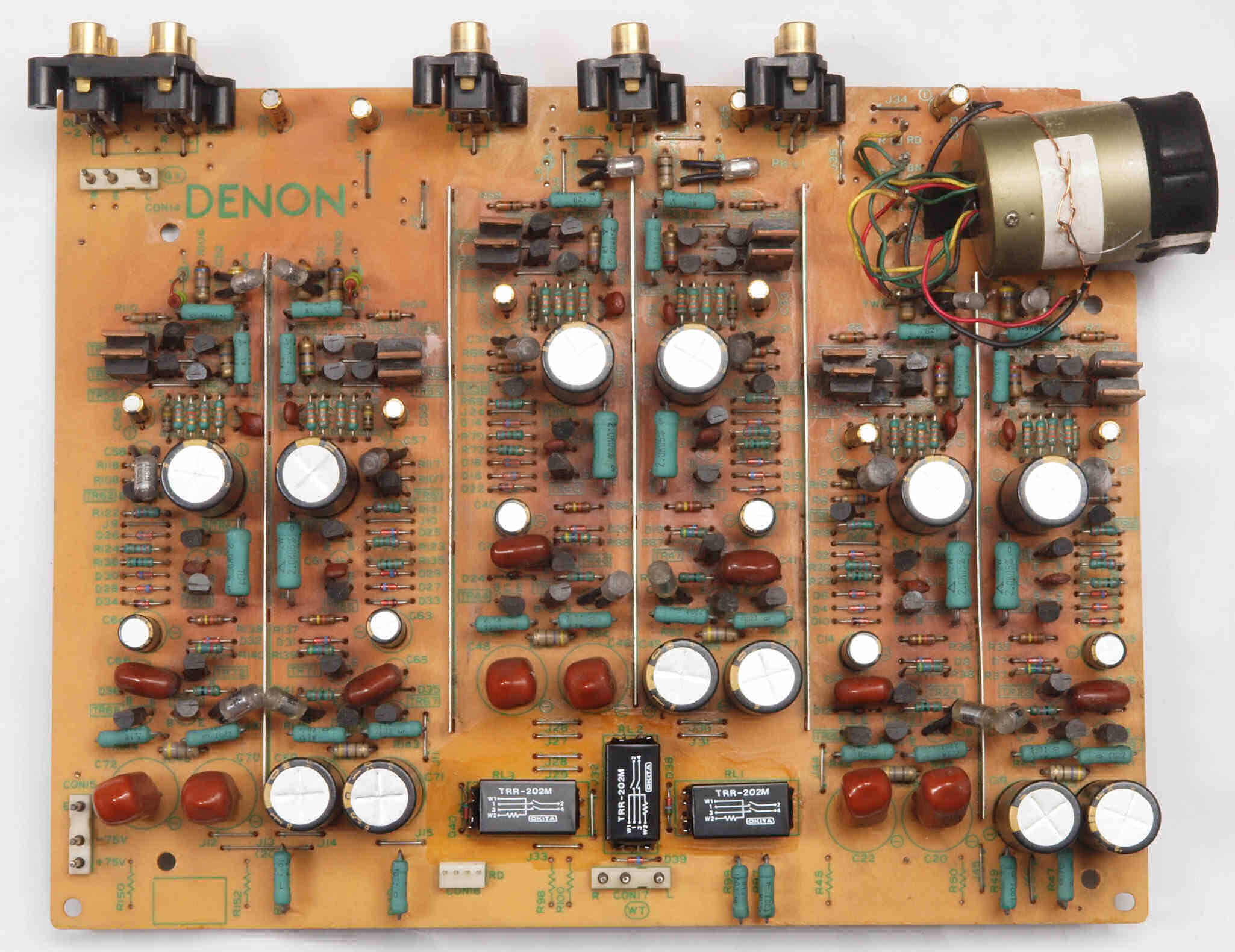 | C11. 修理前 EQ−HEAD-AMP基板。 左=MM、中=MC、右=トランス使用MC。 上右端がMC−トランス。 | ||||||||||||||||||||||||||||||||||||||||||||||||||||||||
