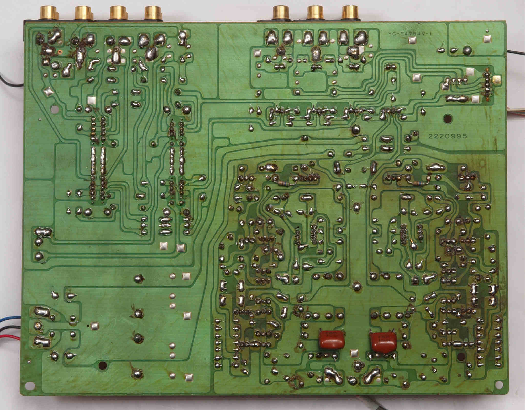 | C231. 修理中 EQ−AMP基板裏。 曲げる方向が悪く隣の銅箔に? 他にも沢山あり。 | ||||||||||||||||||||||||||||||||||||||||||||||||||||||||