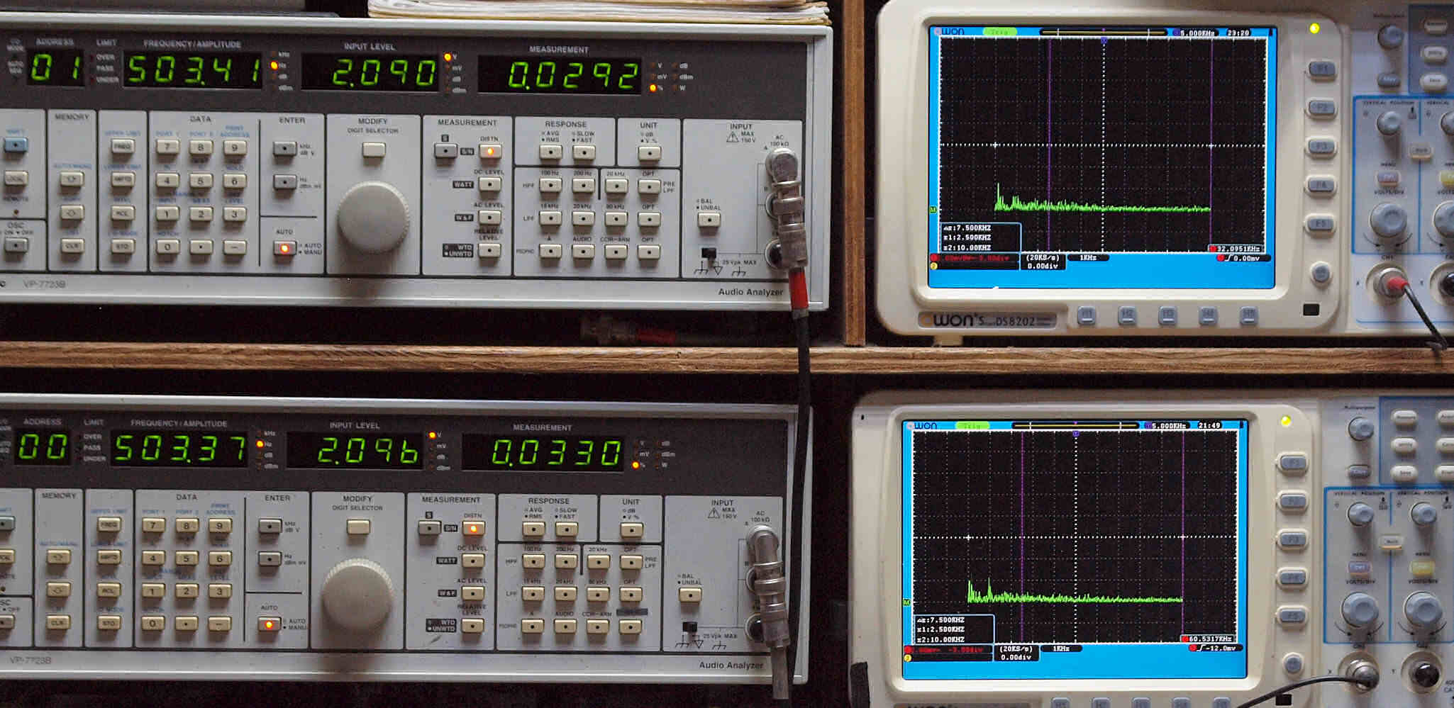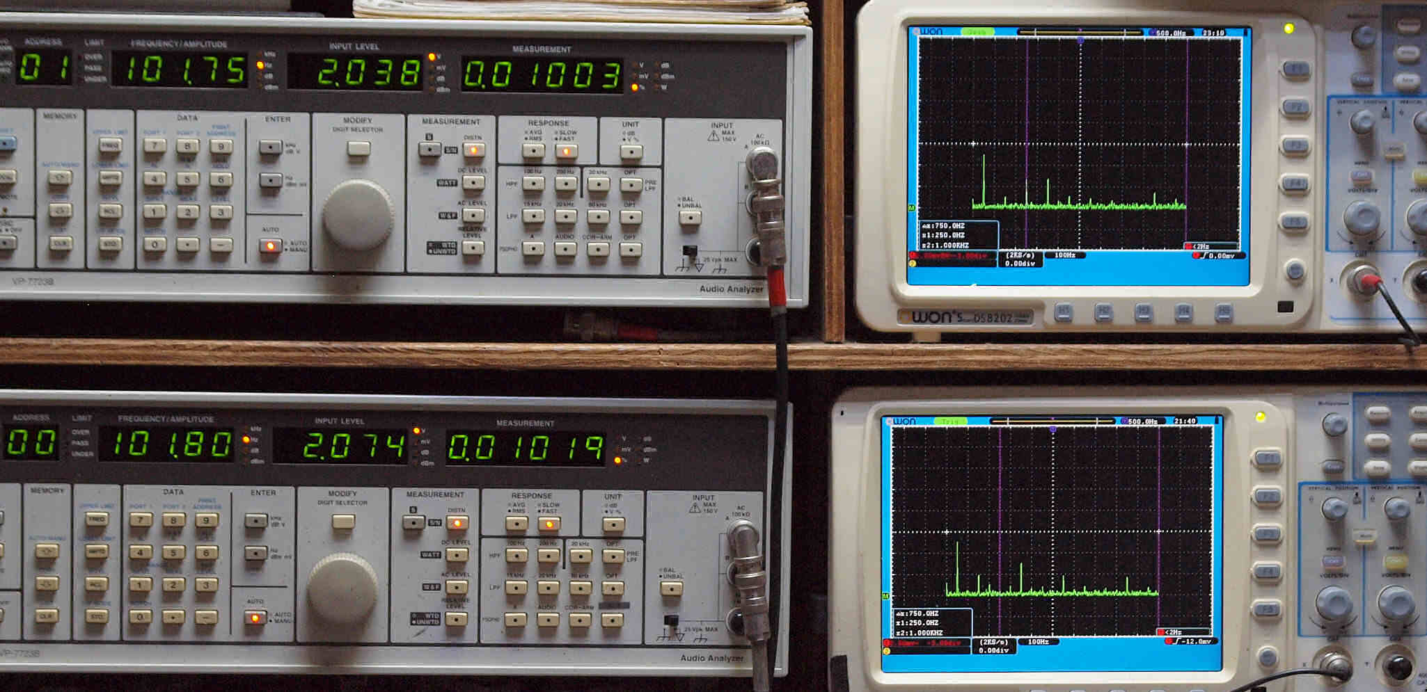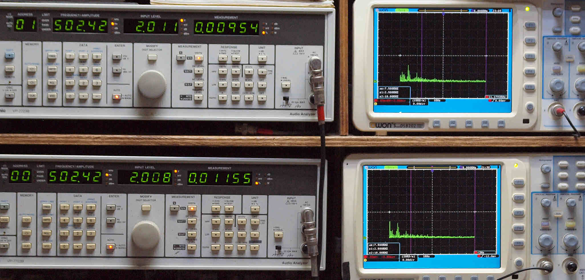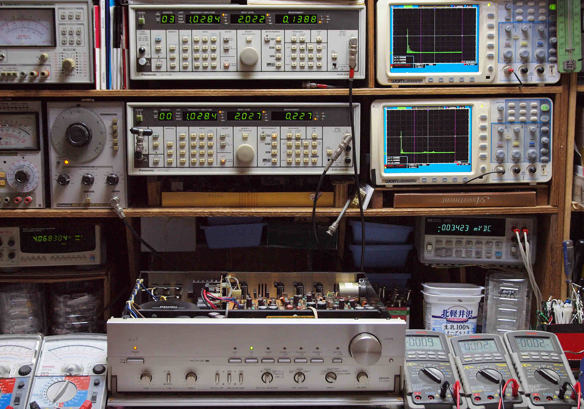 | E. 調整・測定。 画像をクリックすると、大きく(横幅2050ドット)表示されます。 E0. 出力・歪み率測定・調整。 「見方」。 上段中 右側SP出力を「Audio Analyzer Panasonic VP−7723B」により測定。 表示LED、 左端=メモリーNo、 中左=周波数測定、 中右=出力電圧測定、 右端=歪み率測定。 上段右端 VP−7723Bの基本波除去出力を「owon SDS8202(200MHZ)」で「FFT分析」表示。 下段中 左側SP出力を「Audio Analyzer Panasonic VP−7723B」により測定。 表示LED、 左端=メモリーNo、 中左=周波数測定、 中右=出力電圧測定、 右端=歪み率測定。 下段右端 VP−7723Bの基本波除去出力を「owon SDS6062(200MHZ)」で「FFT分析」表示。 下段左端 オーディオ発振器 VP−7201A より50Hz〜100kHzの信号を出し(歪み率=約0.003%)、ATT+分配器を通し、AMPに入力。 よって、ダイアル設定出力レベルより低くなります。測定機器の仕様や整備の様子はこちら、「VP−7723B」「VP−7201A」。 FFT画面の見方はこちら。 |