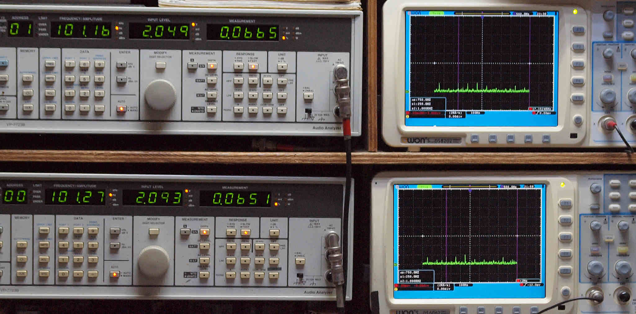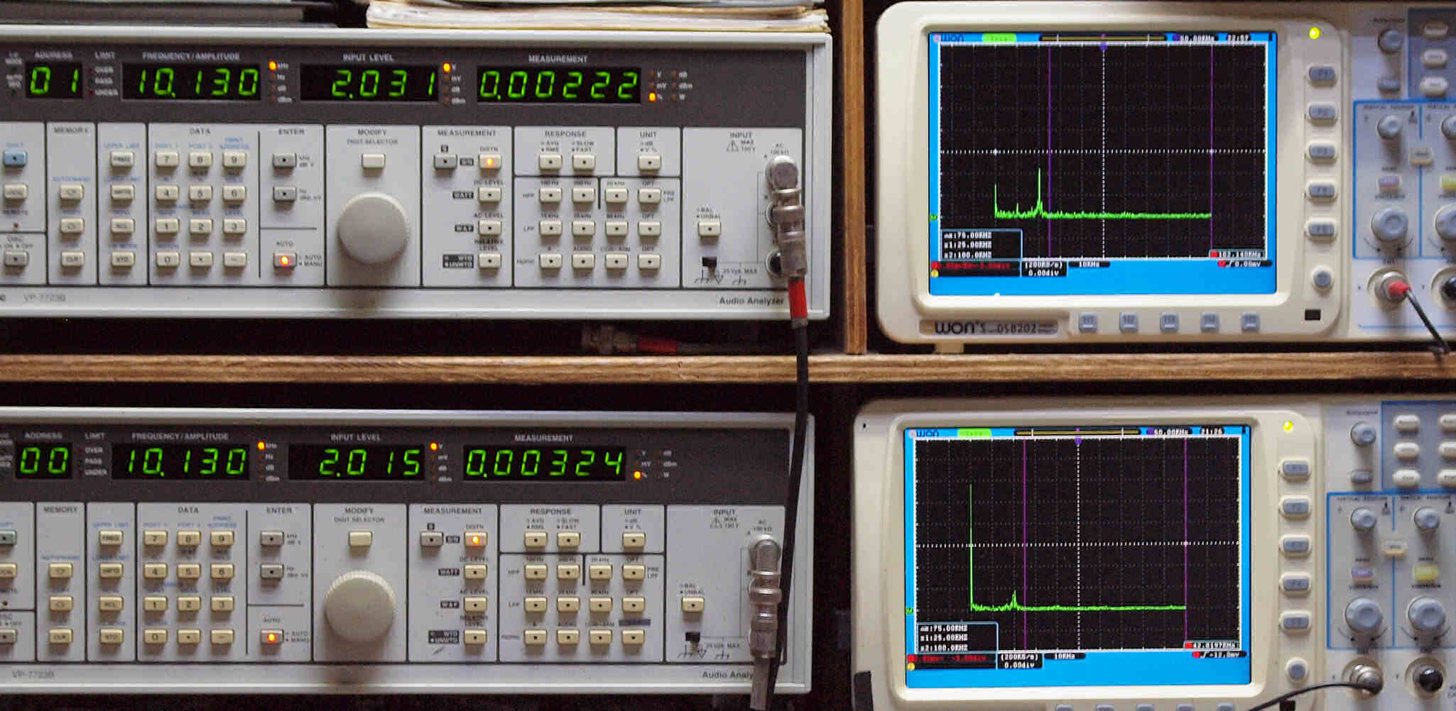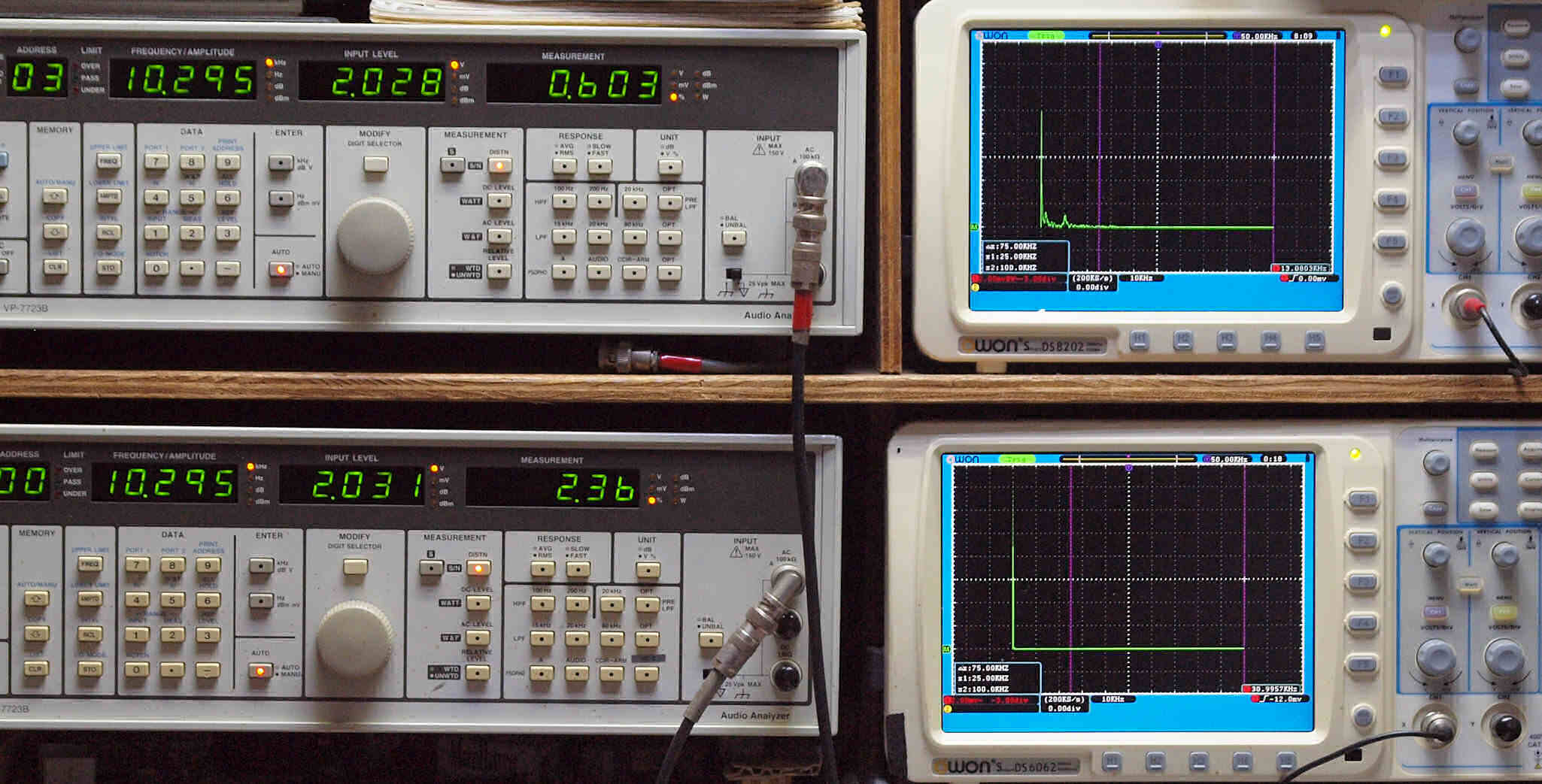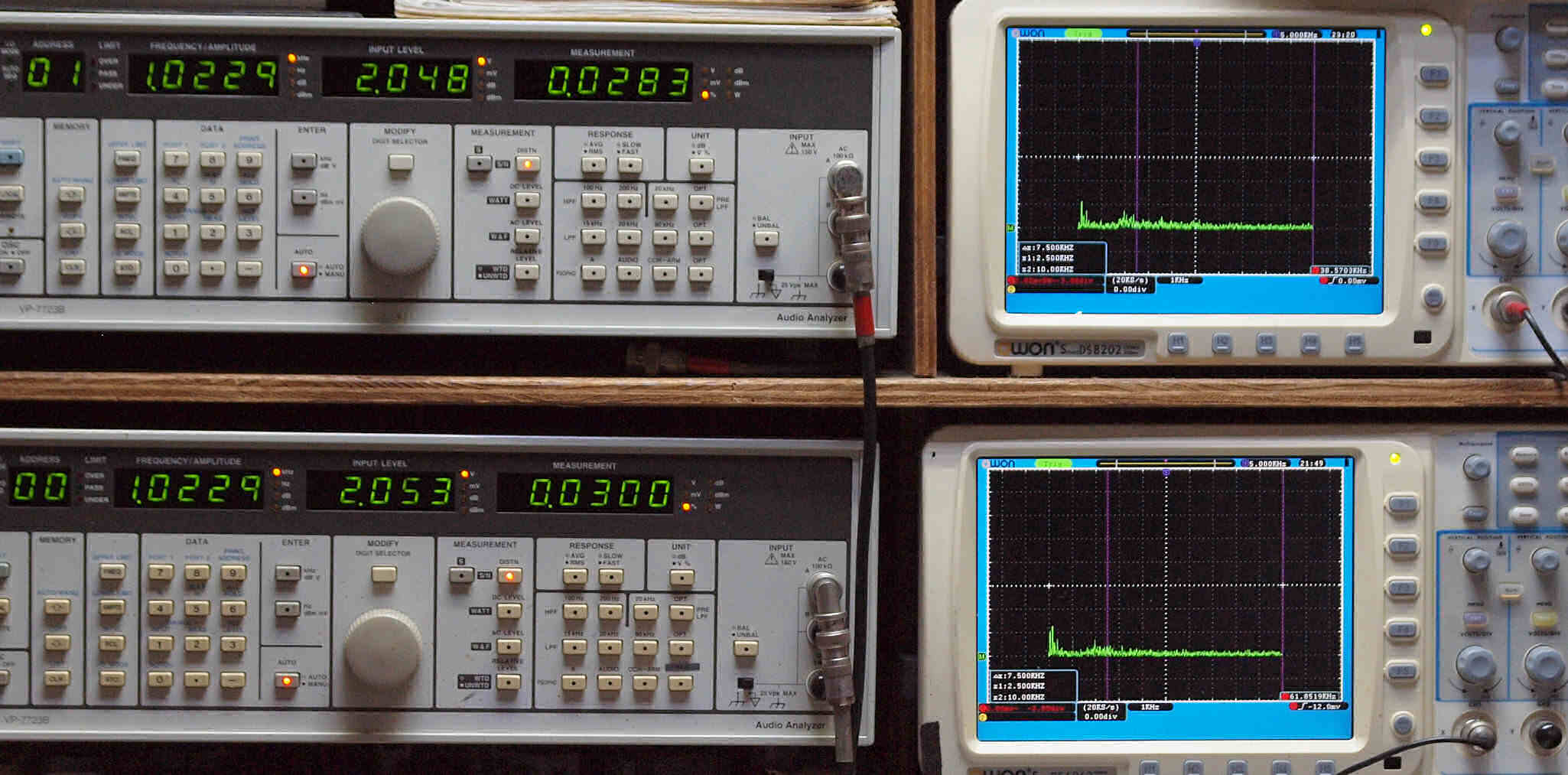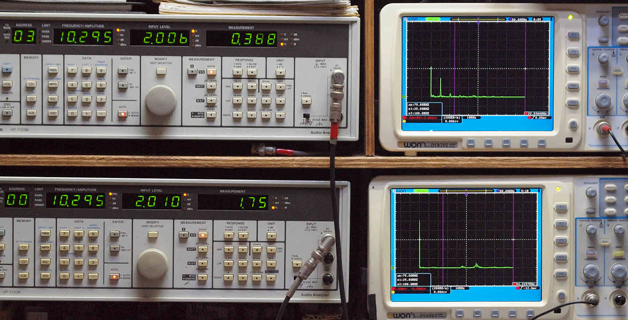 | E. 調整・測定。 画像をクリックすると、大きく(横幅2050ドット)表示されます。 E0. 出力・歪み率測定・調整。 「見方」。 上段中 右側SP出力を「Audio Analyzer Panasonic VP−7723B」により測定。 表示LED、 左端=メモリーNo、 中左=周波数測定、 中右=出力電圧測定、 右端=歪み率測定。 上段右端 VP−7723Bの基本波除去出力を「owon SDS8202(200MHZ)」で「FFT分析」表示。 下段中 左側SP出力を「Audio Analyzer Panasonic VP−7723B」により測定。 表示LED、 左端=メモリーNo、 中左=周波数測定、 中右=出力電圧測定、 右端=歪み率測定。 下段右端 VP−7723Bの基本波除去出力を「owon SDS6062(200MHZ)」で「FFT分析」表示。 下段左端 オーディオ発振器 VP−7201A より50Hz〜100kHzの信号を出し(歪み率=約0.003%)、ATT+分配器を通し、AMPに入力。 よって、ダイアル設定出力レベルより低くなります。測定機器の仕様や整備の様子はこちら、「VP−7723B」「VP−7201A」。 FFT画面の見方はこちら。 |