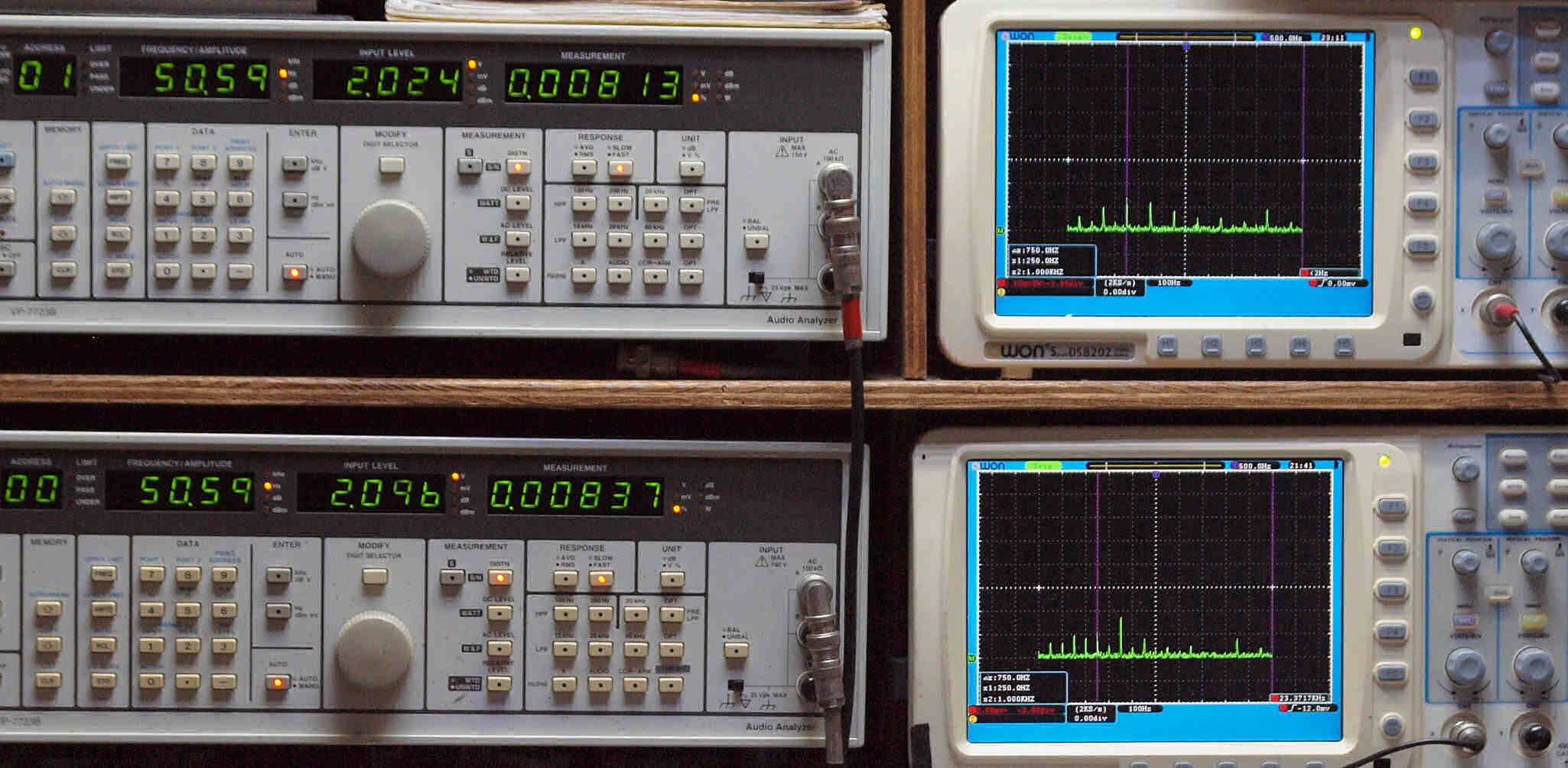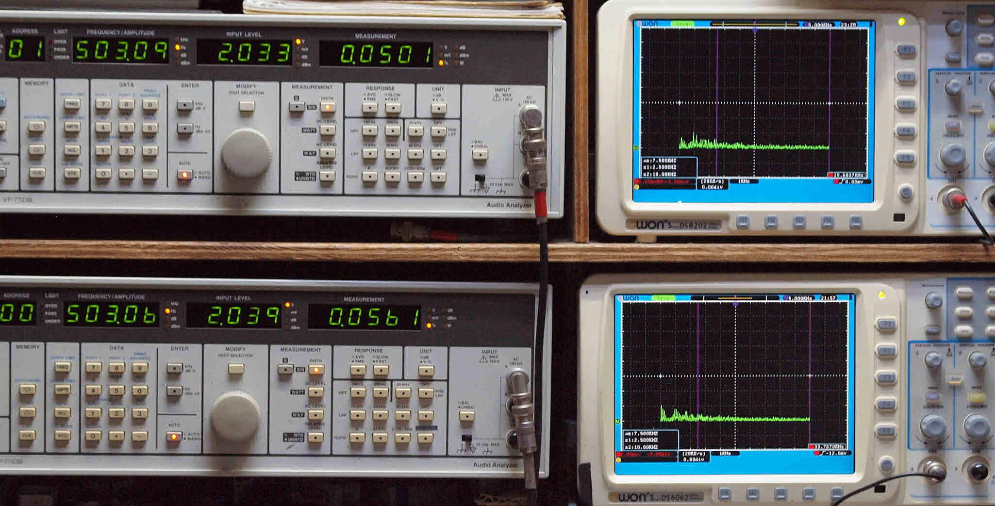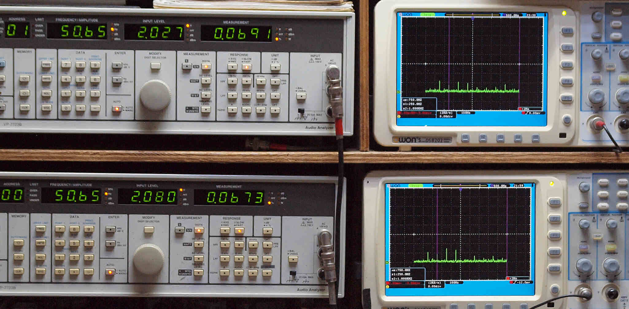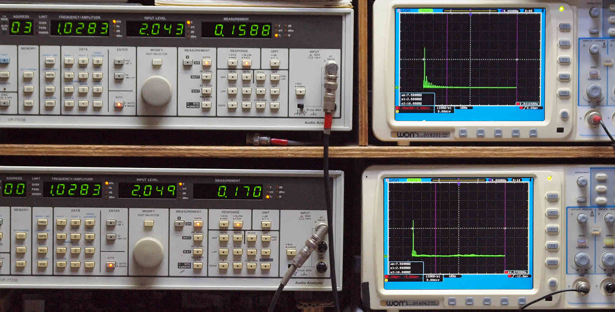 | E. 調整・測定。 画像をクリックすると、大きく(横幅2050ドット)表示されます。 E0. 出力・歪み率測定・調整。 「見方」。 上段中 右側SP出力を「Audio Analyzer Panasonic VP−7723B」により測定。 表示LED、 左端=メモリーNo、 中左=周波数測定、 中右=出力電圧測定、 右端=歪み率測定。 上段右端 VP−7723Bの基本波除去出力を「owon SDS8202(200MHZ)」で「FFT分析」表示。 下段中 左側SP出力を「Audio Analyzer Panasonic VP−7723B」により測定。 表示LED、 左端=メモリーNo、 中左=周波数測定、 中右=出力電圧測定、 右端=歪み率測定。 下段右端 VP−7723Bの基本波除去出力を「owon SDS6062(200MHZ)」で「FFT分析」表示。 下段左端 オーディオ発振器 VP−7201A より50Hz〜100kHzの信号を出し(歪み率=約0.003%)、ATT+分配器を通し、AMPに入力。 よって、ダイアル設定出力レベルより低くなります。測定機器の仕様や整備の様子はこちら、「VP−7723B」「VP−7201A」。 FFT画面の見方はこちら。 |