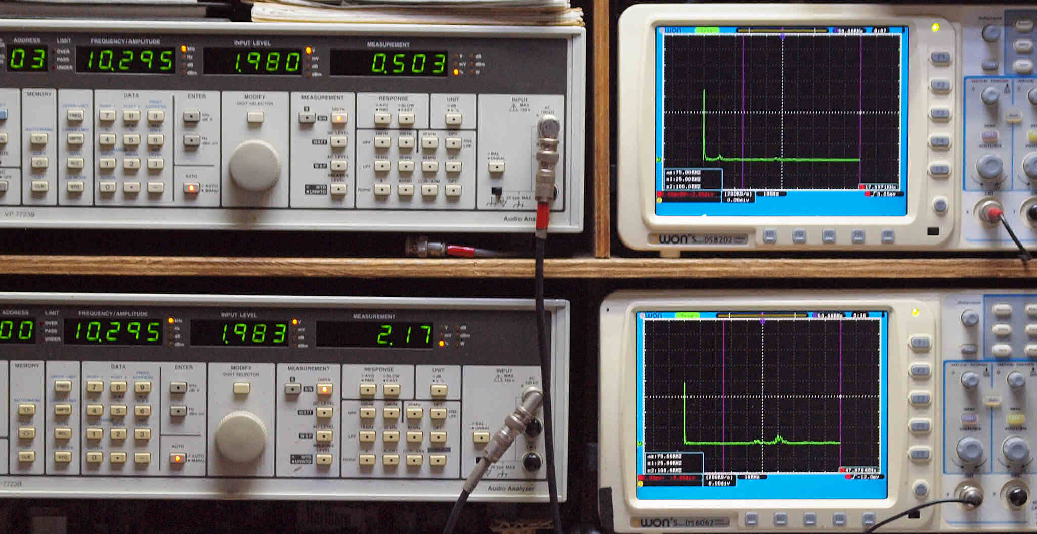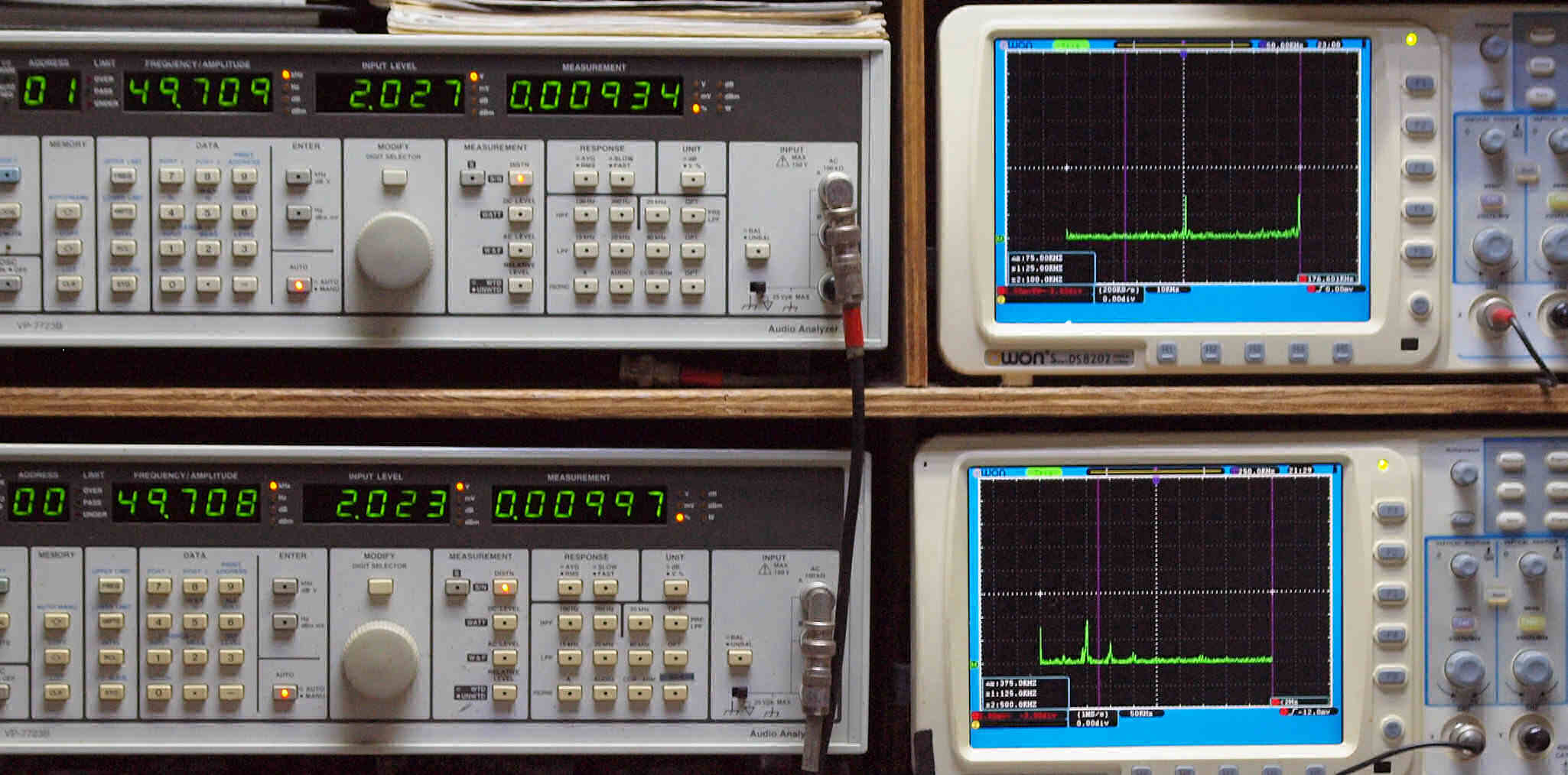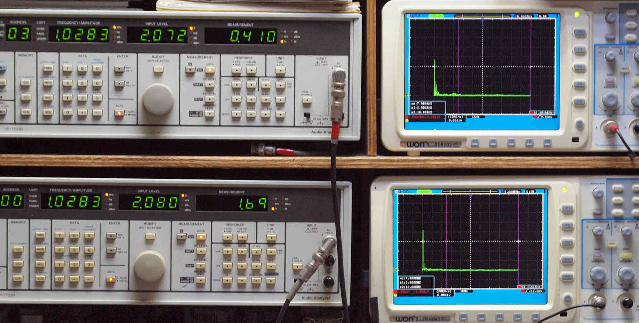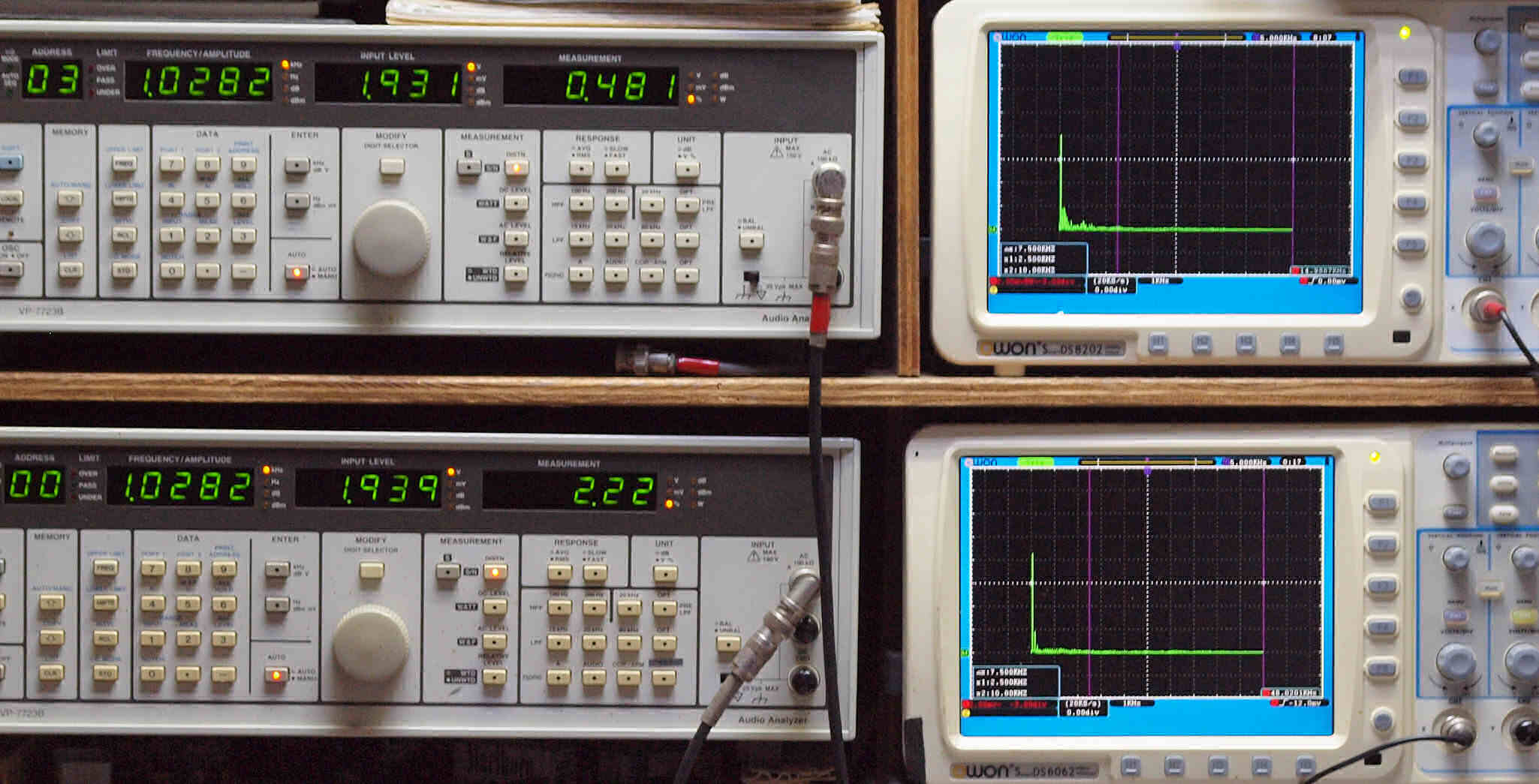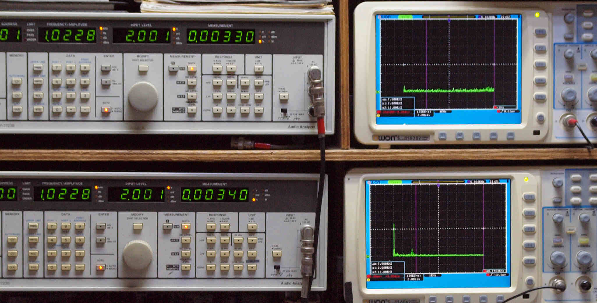 | E. 調整・測定。 画像をクリックすると、大きく(横幅2050ドット)表示されます。 E0. 出力・歪み率測定・調整。 「見方」。 上段中 右側SP出力を「Audio Analyzer Panasonic VP−7723B」により測定。 表示LED、 左端=メモリーNo、 中左=周波数測定、 中右=出力電圧測定、 右端=歪み率測定。 上段右端 VP−7723Bの基本波除去出力を「owon SDS8202(200MHZ)」で「FFT分析」表示。 下段中 左側SP出力を「Audio Analyzer Panasonic VP−7723B」により測定。 表示LED、 左端=メモリーNo、 中左=周波数測定、 中右=出力電圧測定、 右端=歪み率測定。 下段右端 VP−7723Bの基本波除去出力を「owon SDS6062(200MHZ)」で「FFT分析」表示。 下段左端 オーディオ発振器 VP−7201A より50Hz〜100kHzの信号を出し(歪み率=約0.003%)、ATT+分配器を通し、AMPに入力。 よって、ダイアル設定出力レベルより低くなります。測定機器の仕様や整備の様子はこちら、「VP−7723B」「VP−7201A」。 FFT画面の見方はこちら。 |