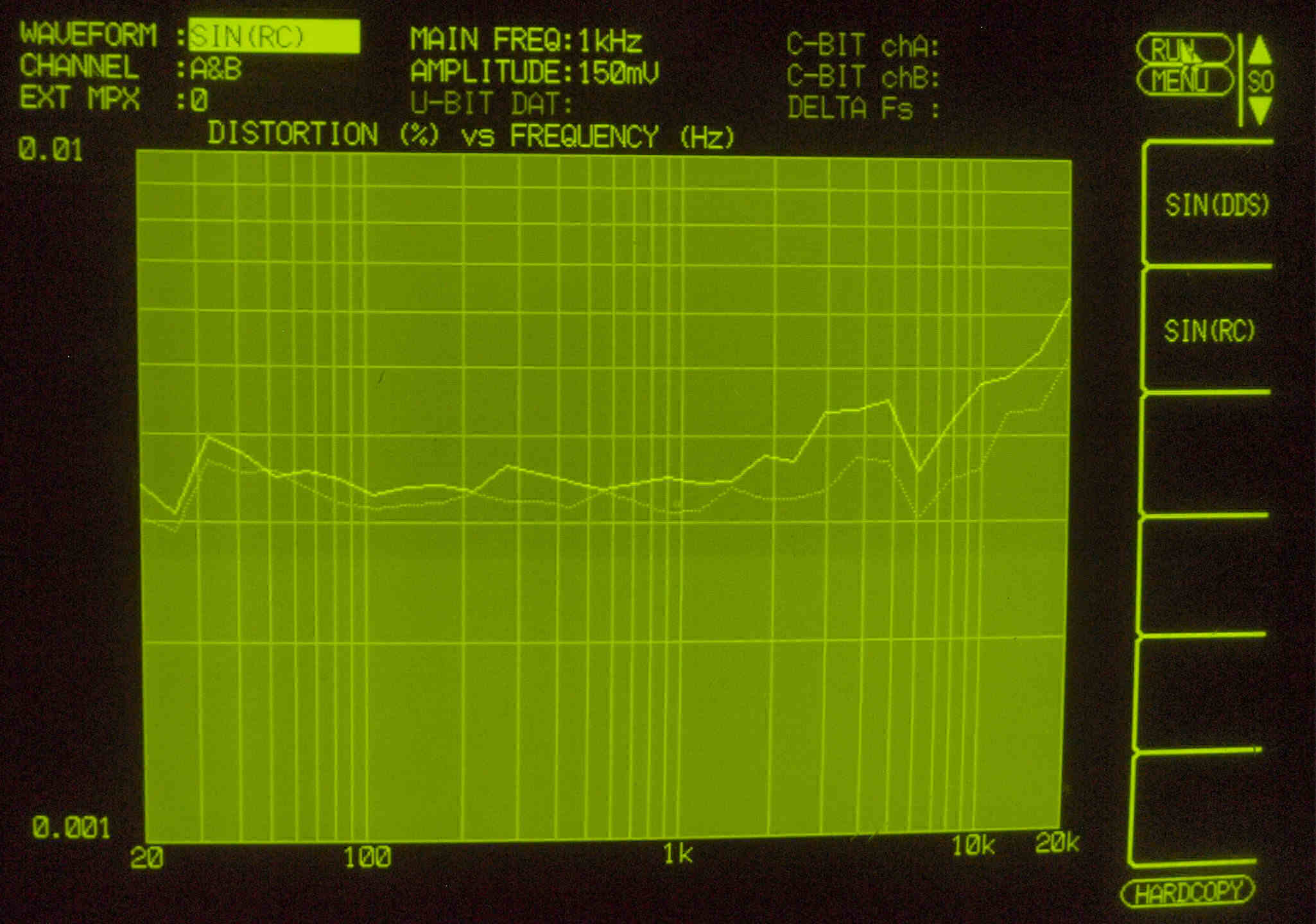 | F12. 歪み率特性測定(AUX入力) AUX入力端子へ150mV一定入力 VRはmax。 左出力=薄(細い)色 右出力=濃い(太い)色 |