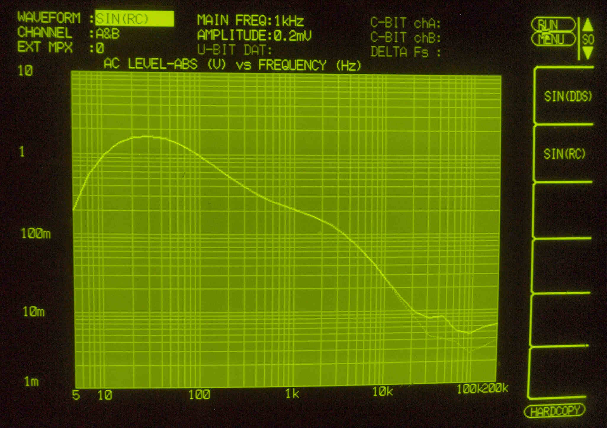 | F23. 入出力特性測定(MC TR入力)=PHONO−1 MC入力端子へ0.2mV入力 VRはmax 左出力=薄(細い)色 右出力=濃い(太い)色。 |