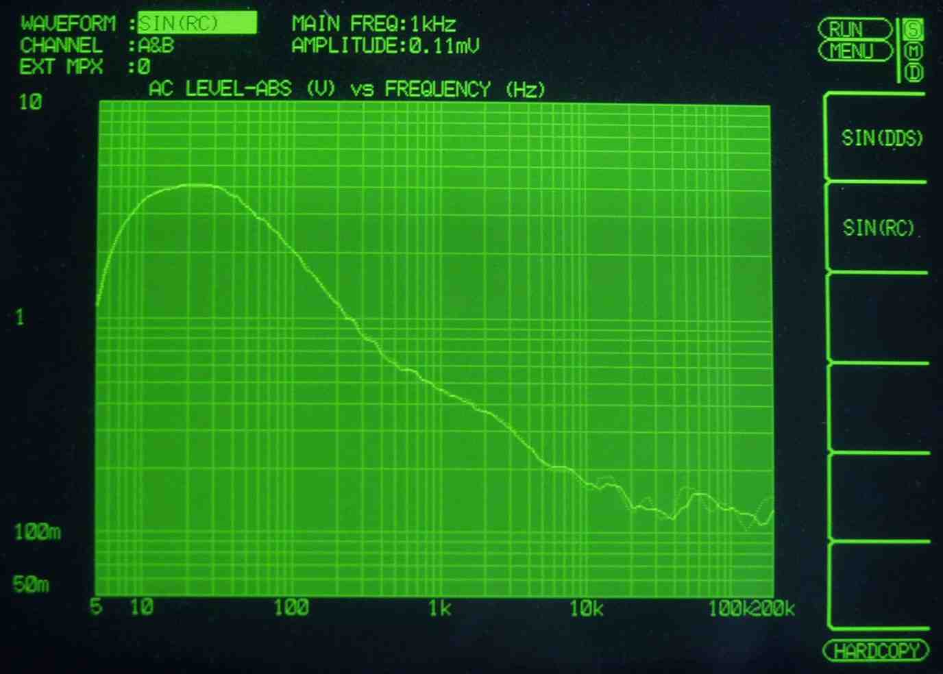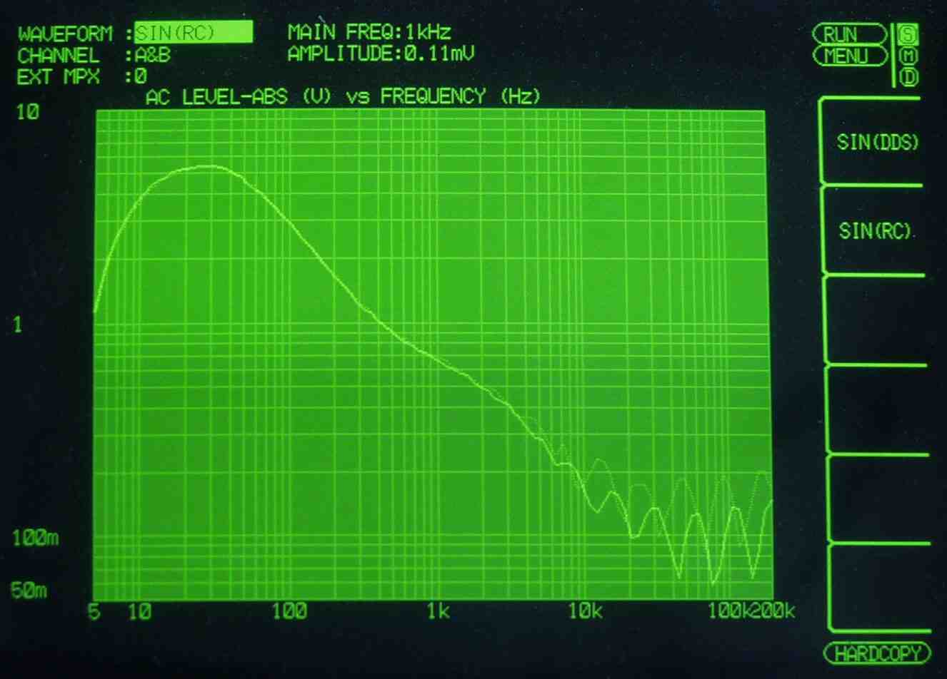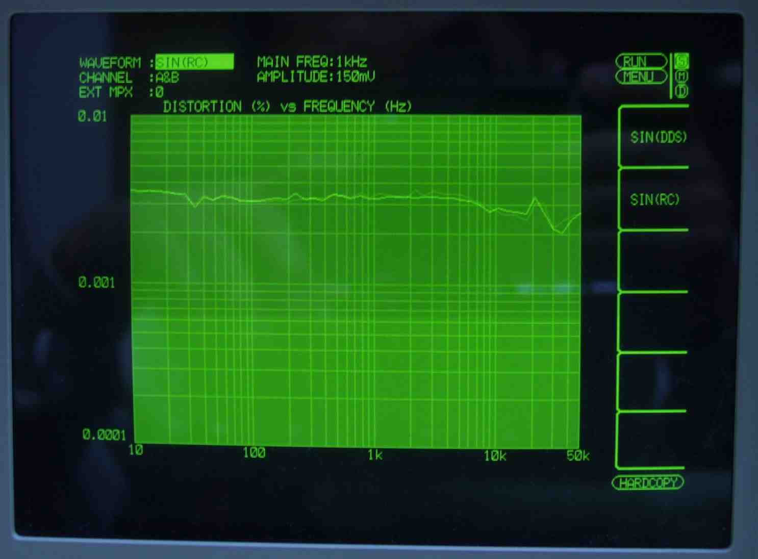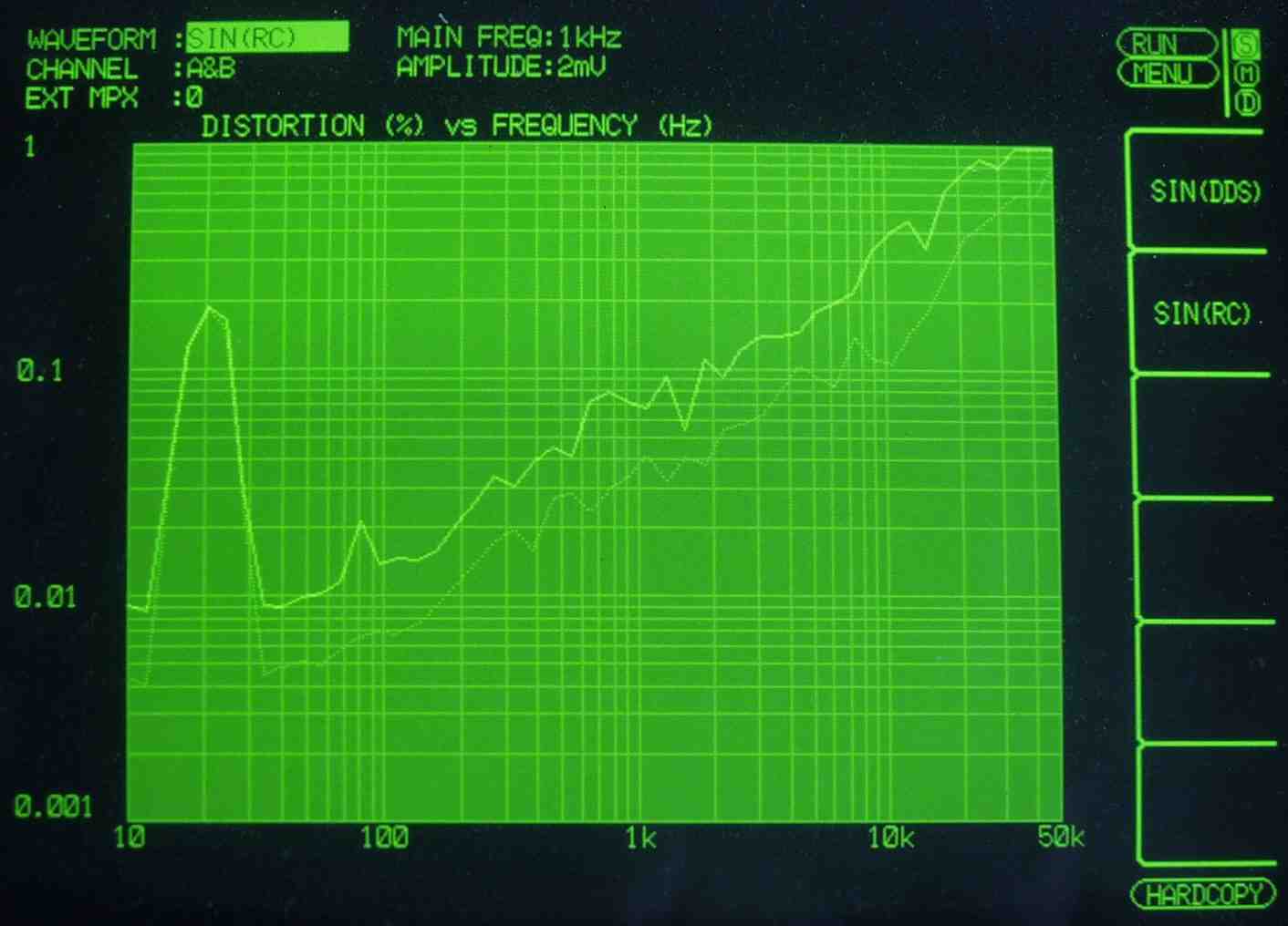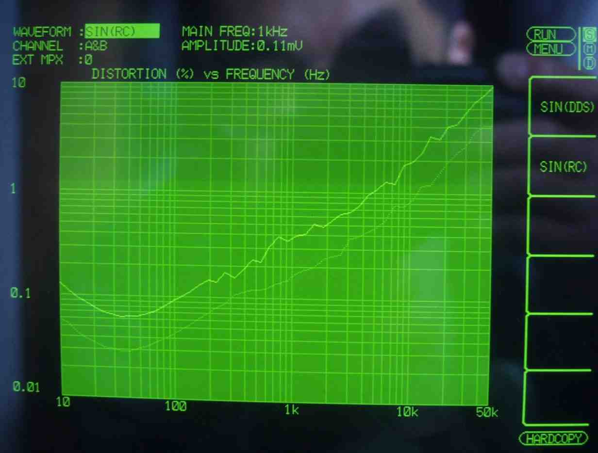 | HF4. 歪み率測定(MM入力)=PHONO−3 左出力=薄(細い)色 右出力=濃い(太い)色 MC入力端子へ=2mV一定入力 VRはmax この測定器は入力レベルが変化すると、正しく測定できない、 入力に逆RIAAフイルターを入れ、入力レベルを一定にしないと、正確な測定は出来ないので参考程度 |