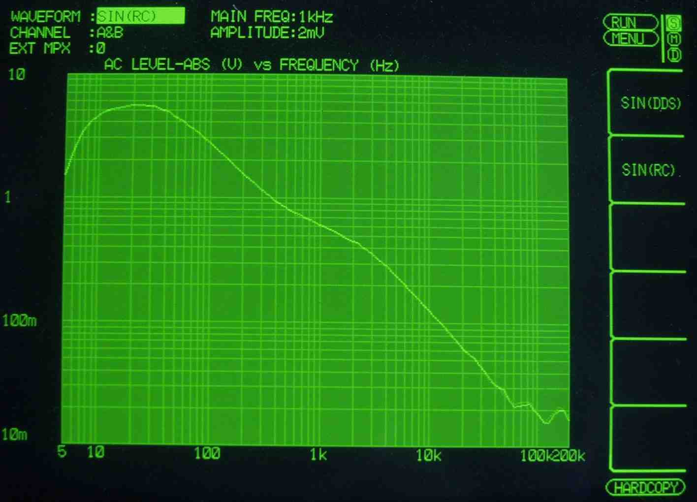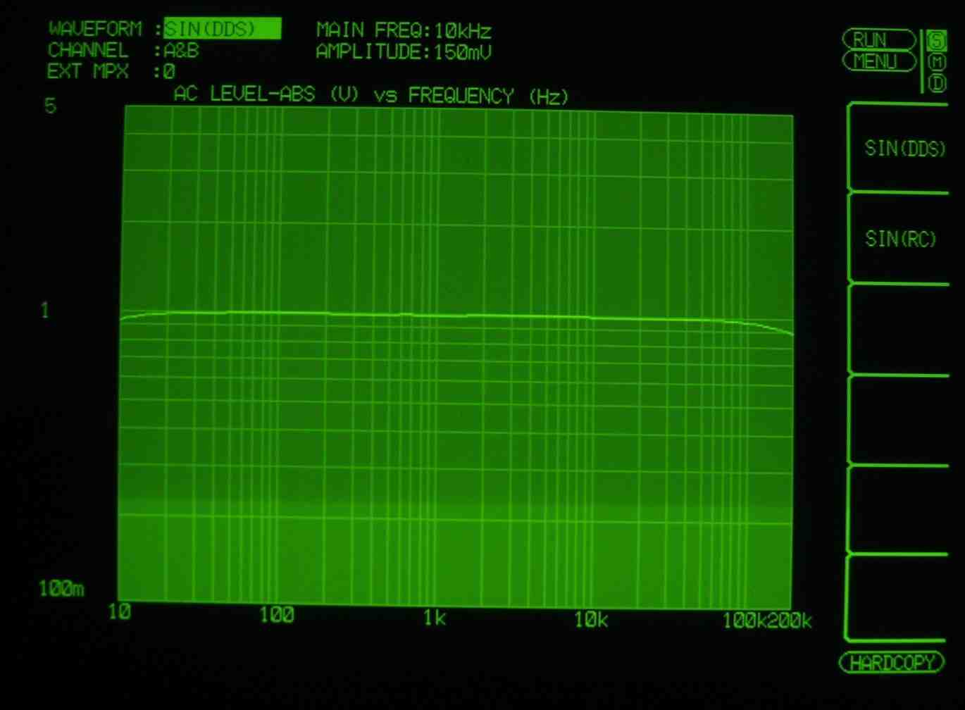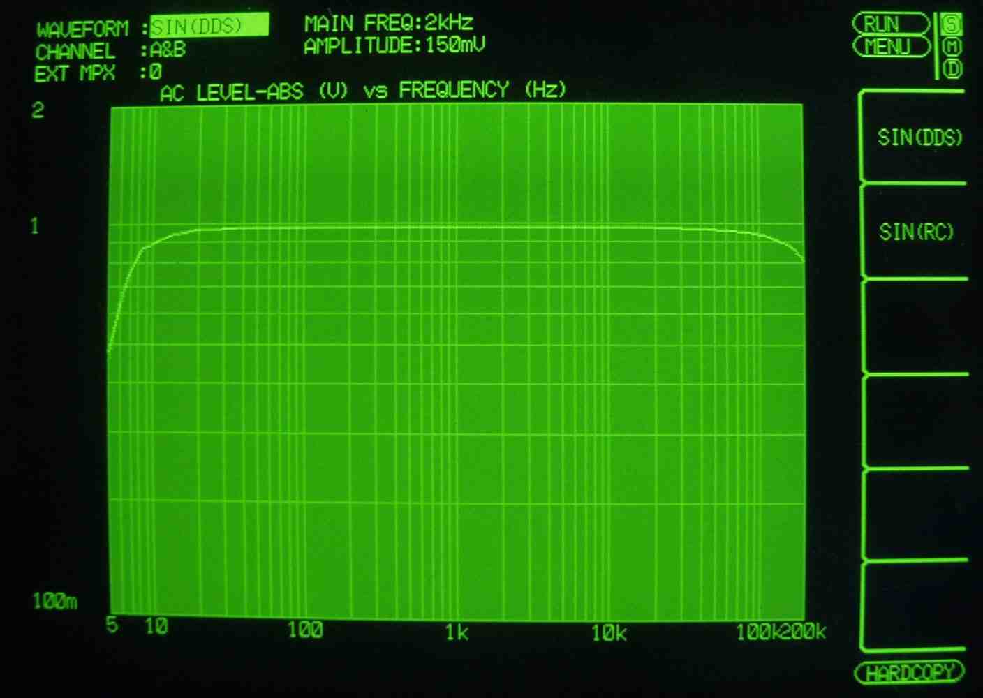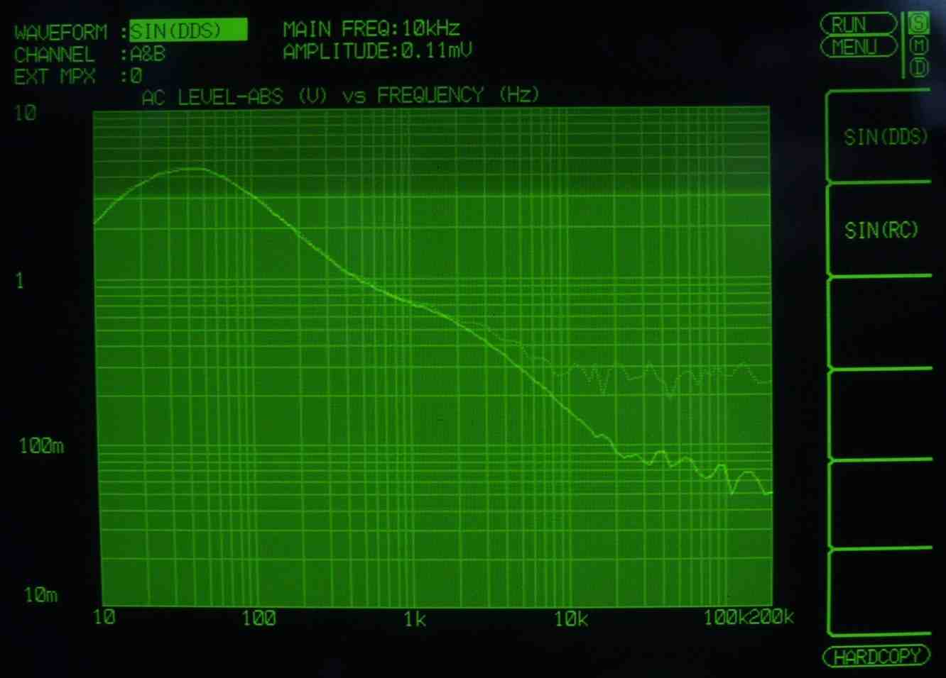 | HF4. 歪み率測定(MM入力)=PHONO−3 左出力=薄(細い)色 右出力=濃い(太い)色 MC入力端子へ=2mV一定入力 VRはmax この測定器は入力レベルが変化すると、正しく測定できない、 入力に逆RIAAフイルターを入れ、入力レベルを一定にしないと、正確な測定は出来ないので参考程度 |