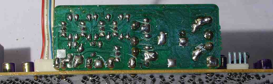 | E4. 左右のばらつきが有るので点検すると、製造時のコンデンサーが半田付け(穴に差し込んでない) このお陰で、全部解体する事になる |
