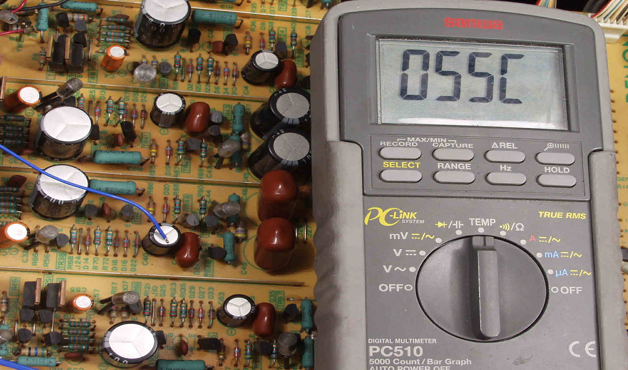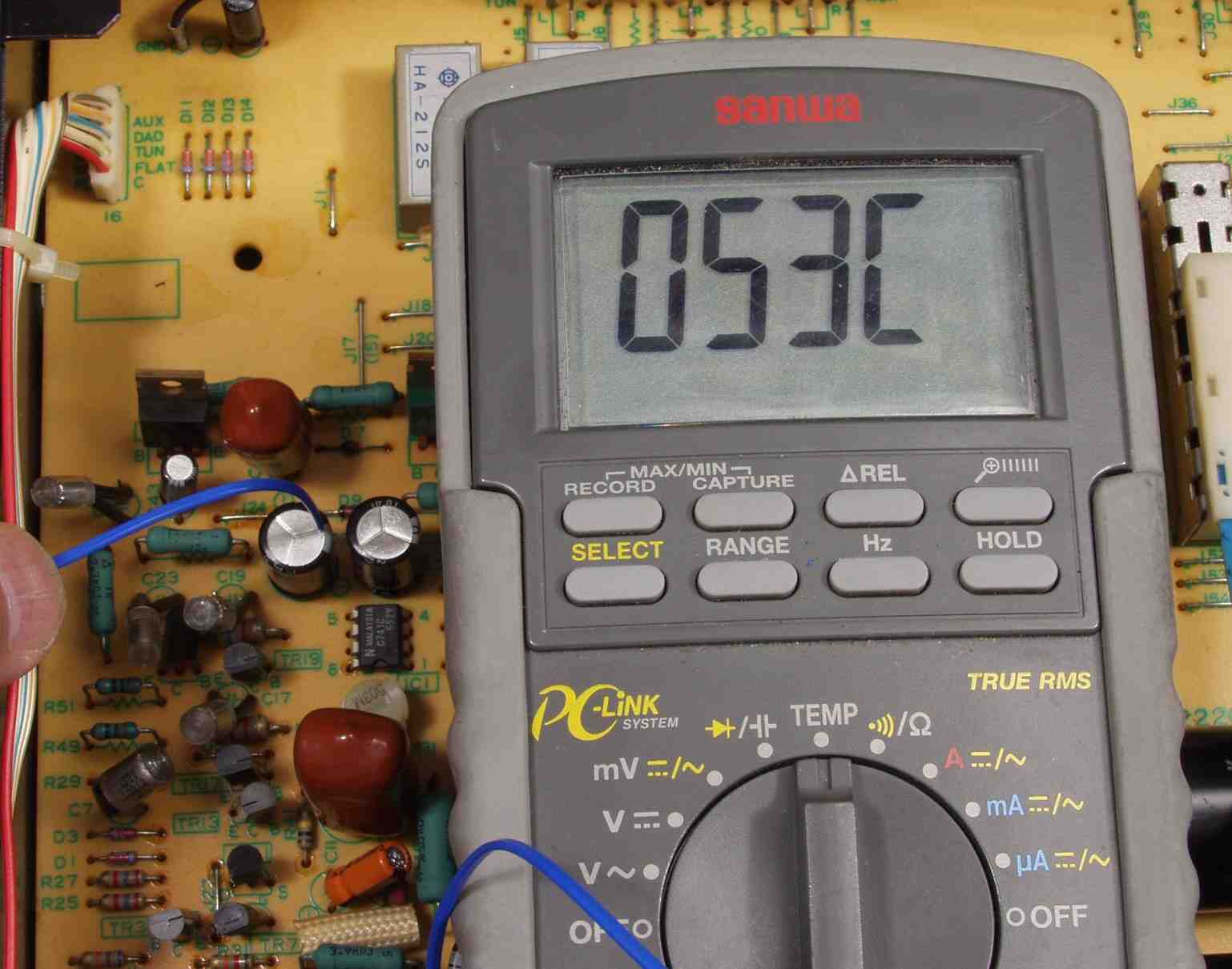 | A5A. 点検中 このAMPは馬鹿に電解コンデンサーが熱いので測定した EQ共通AMPの熱い電解コンデンサーの頭の温度=53度C |
