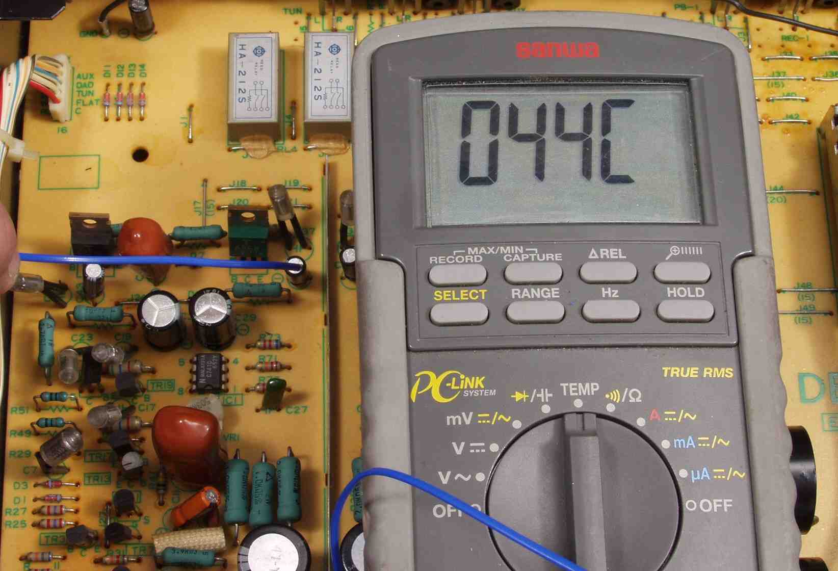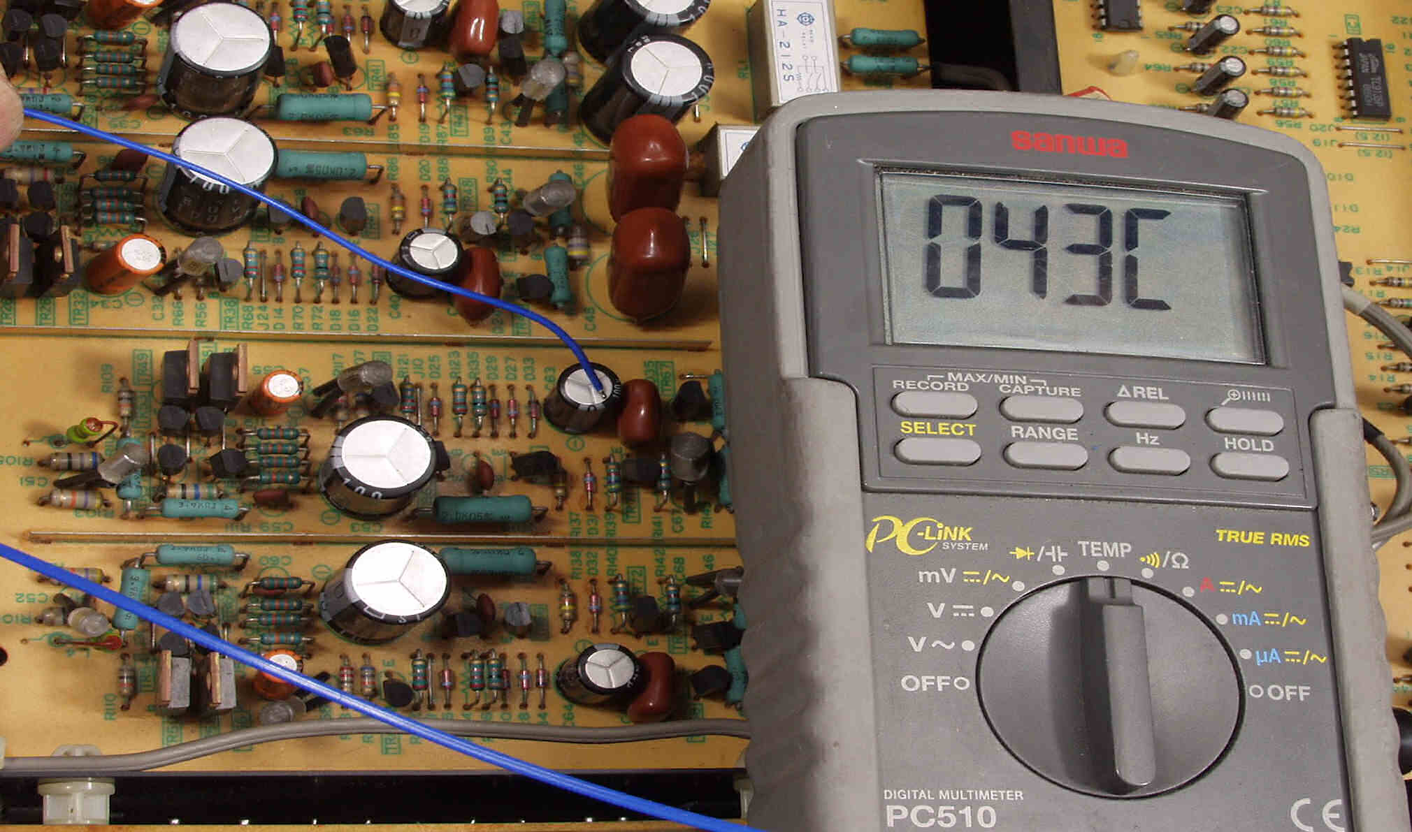 | A5B. 点検中 発熱TR(トランジスター)に近い、EQ共通AMPの電解コンデンサーの頭の温度=44度C | ||||||||||||||||||||||||||||||||||||||||||||||||||||