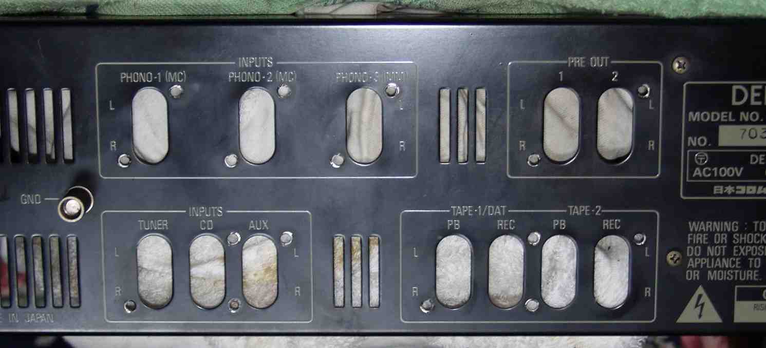 | A8. 後パネルのRCA端子取り付け部分、RCA端子の交換は、長穴なので当て板が4枚必要になる 機械加工場で2万円で製作してくらるかな? よって交換費は4万円〜 今回見送り。 |