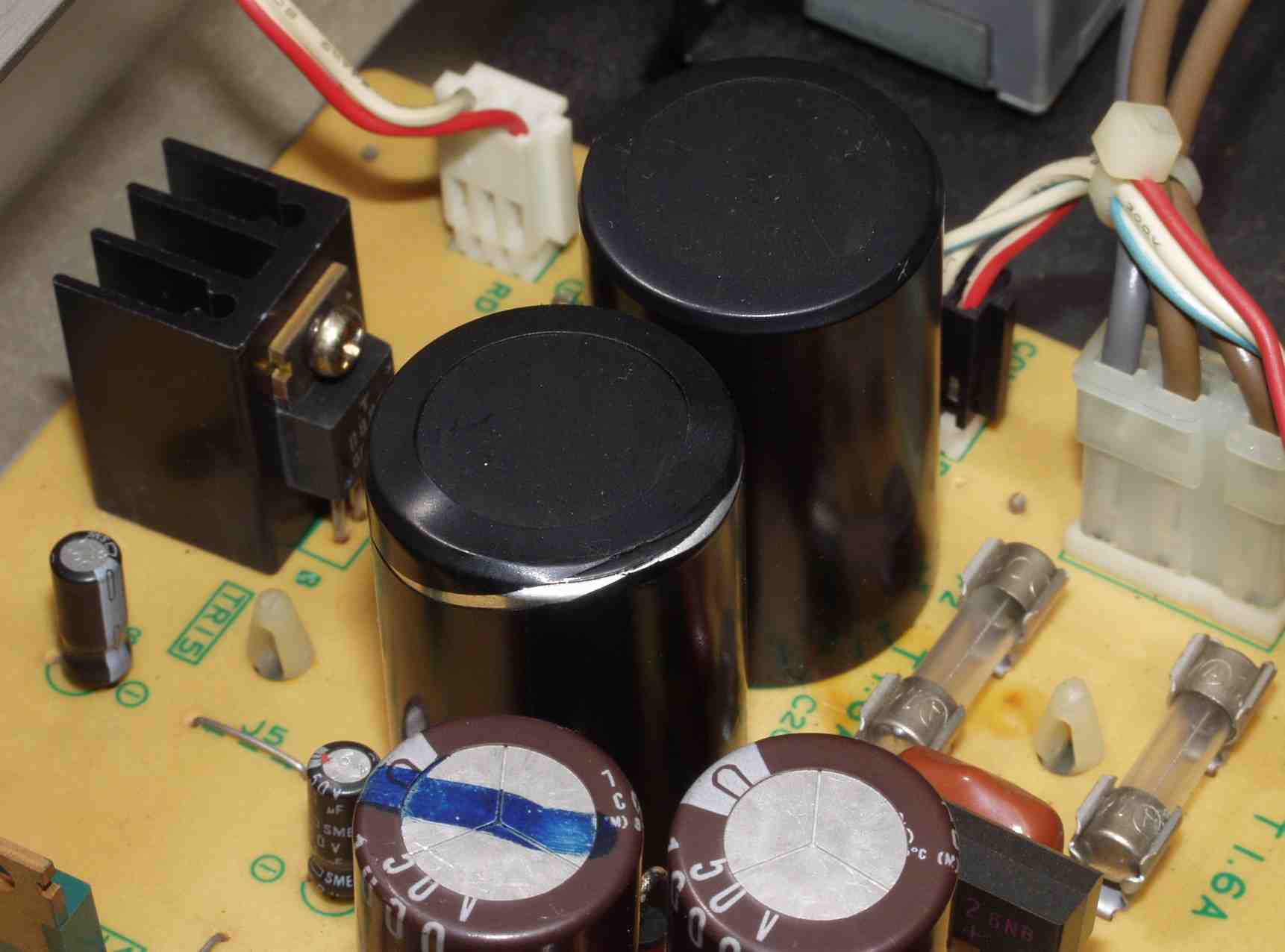 | A4. 点検中 出力TR(トランジスター)の放熱で、後退した電解コンデンサーのビニール | ||||||||||||||||||||||||||||||||||||||||||||||||||||