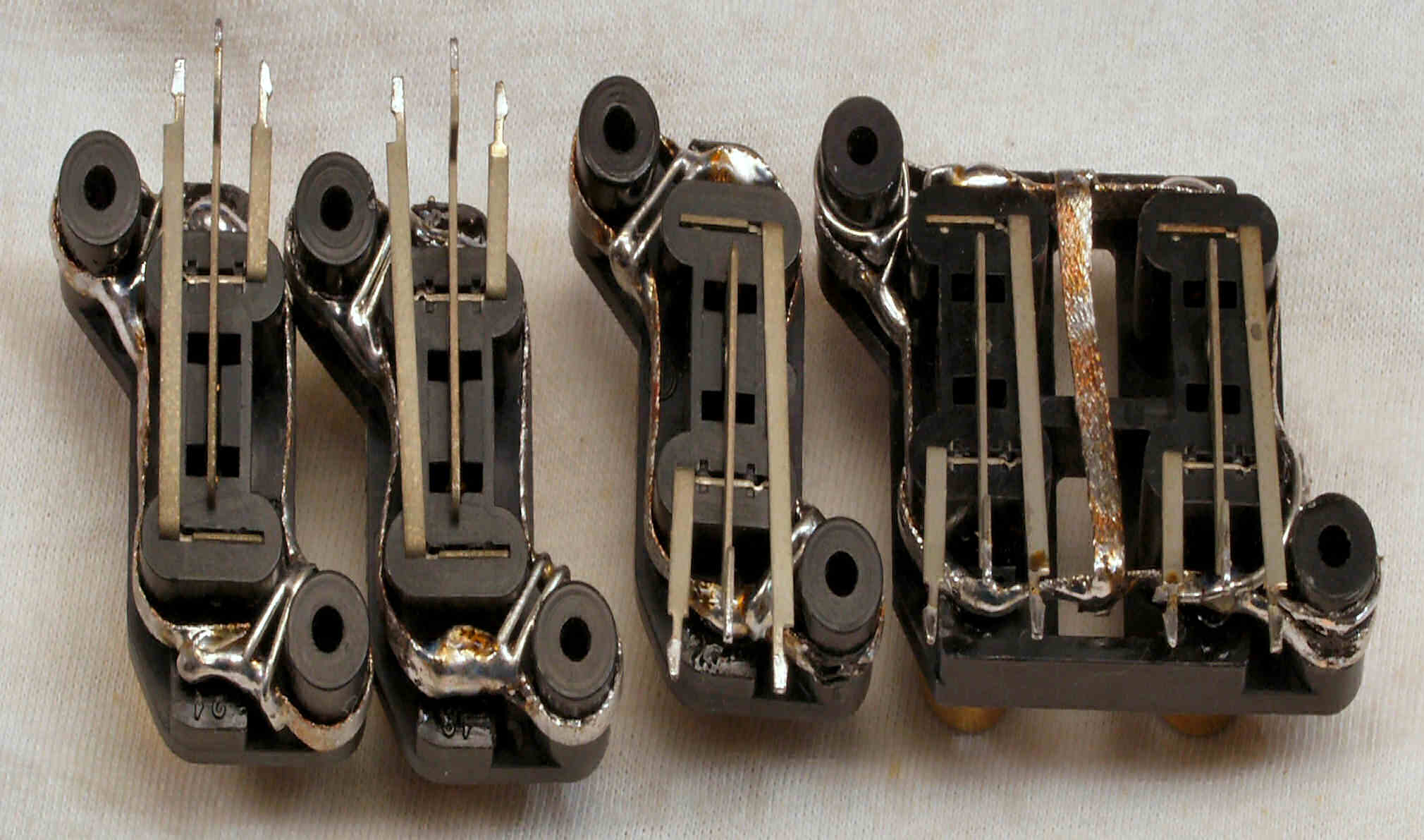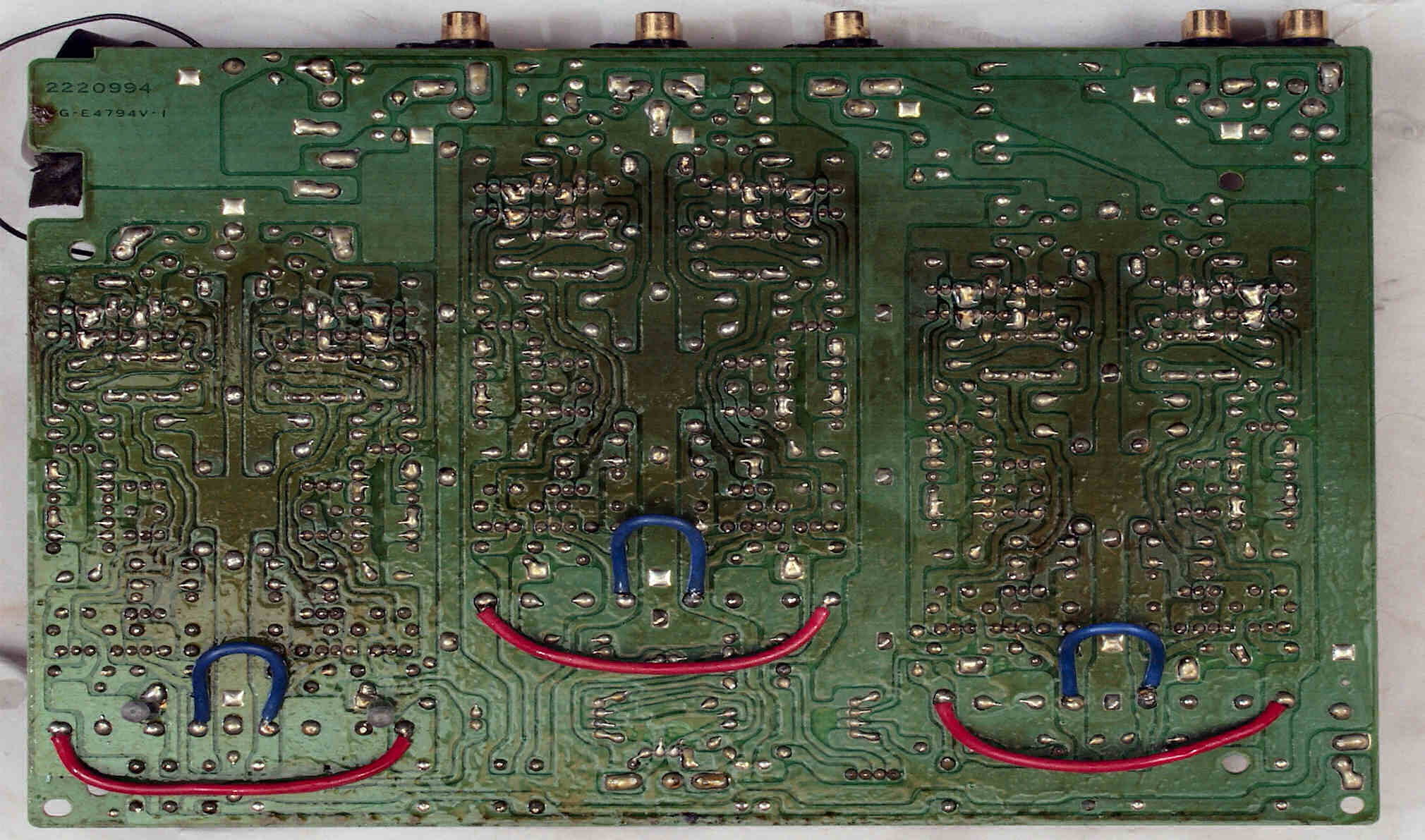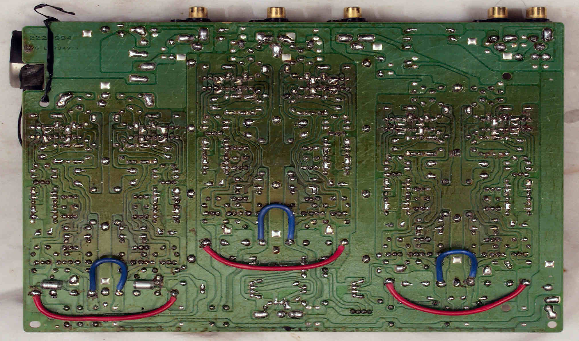 C223. 修理後 EQ−HEAD-AMP基板のRCA端子 半田吸い取り線で補強+さらにホットボンドで補強
