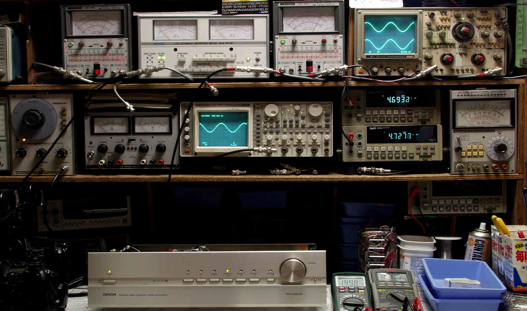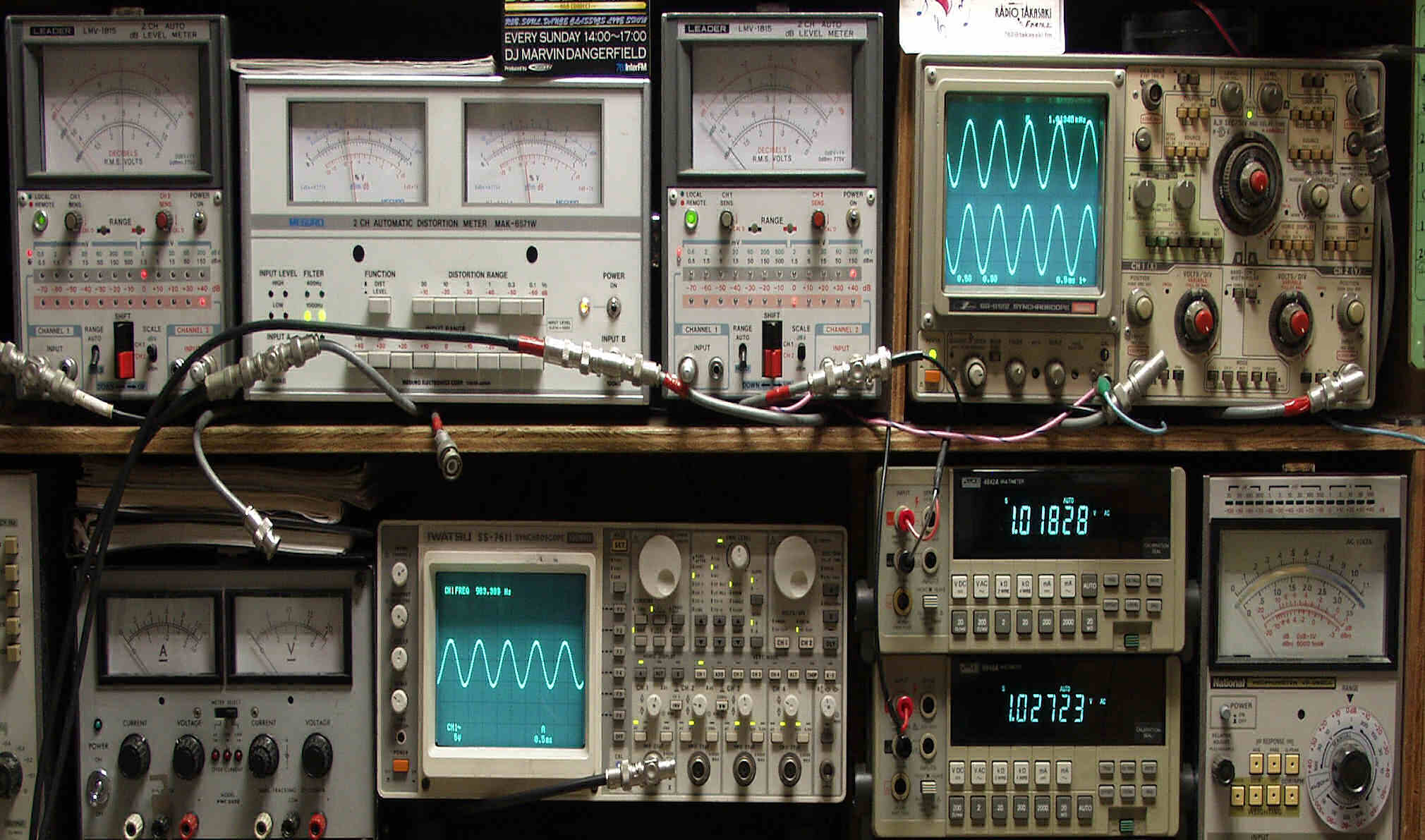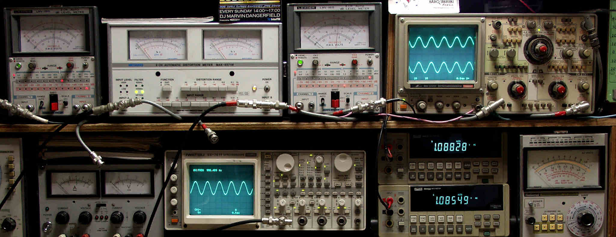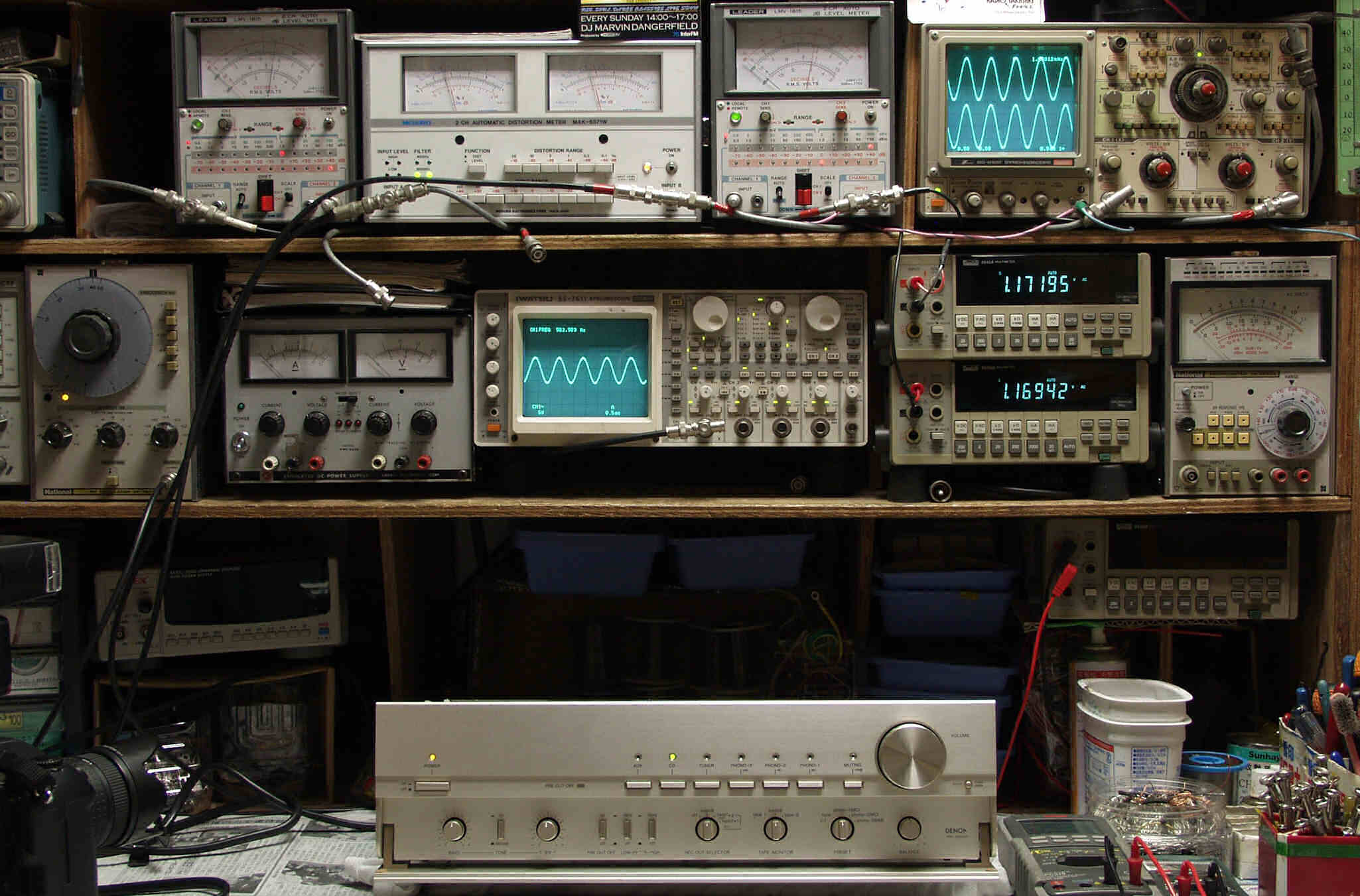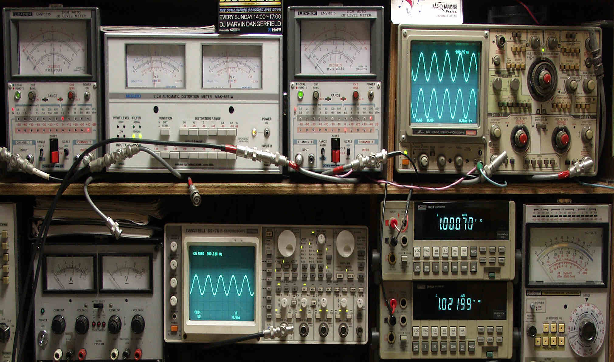 上段中左 歪み率計=出力の歪み率測定 左メータ=L出力、右メータ=R出力