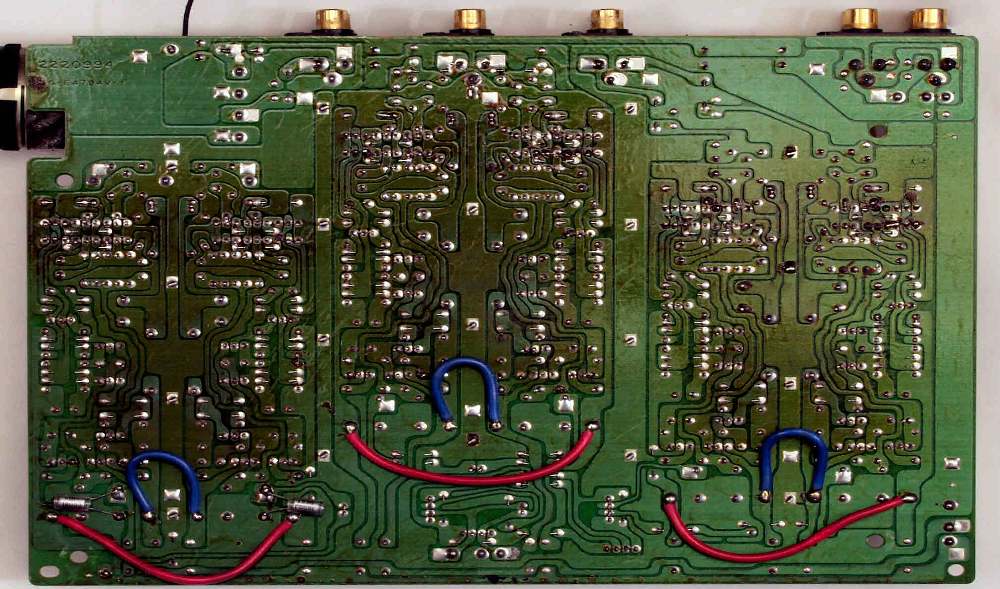 C222. 修理中 EQ−HEAD-AMP基板のRCA端子 半田吸い取り線で補強