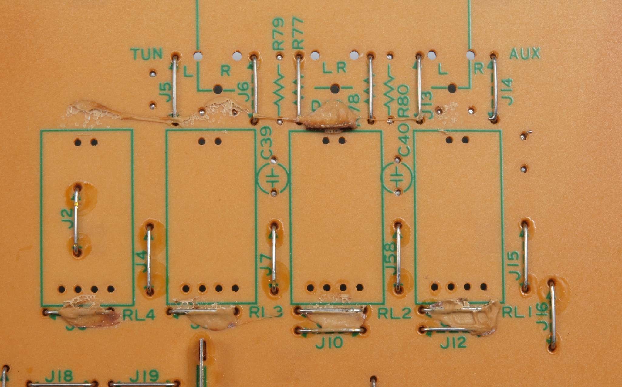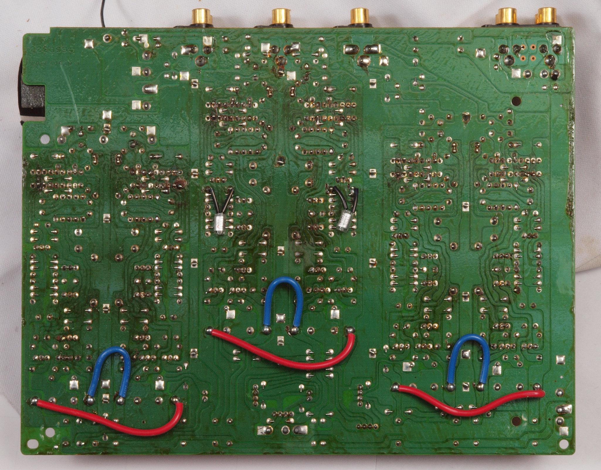 | C13. 修理前 EQ−HEAD-AMP基板裏。 RCA端子が半田補正してある。 | ||||||||||||||||||||||||||||||||||||||||||||||||||||