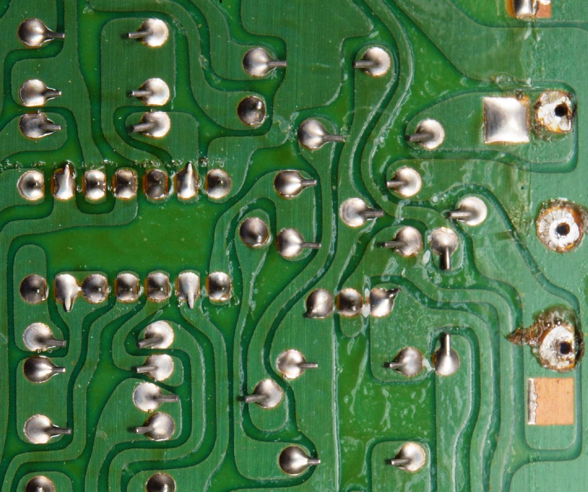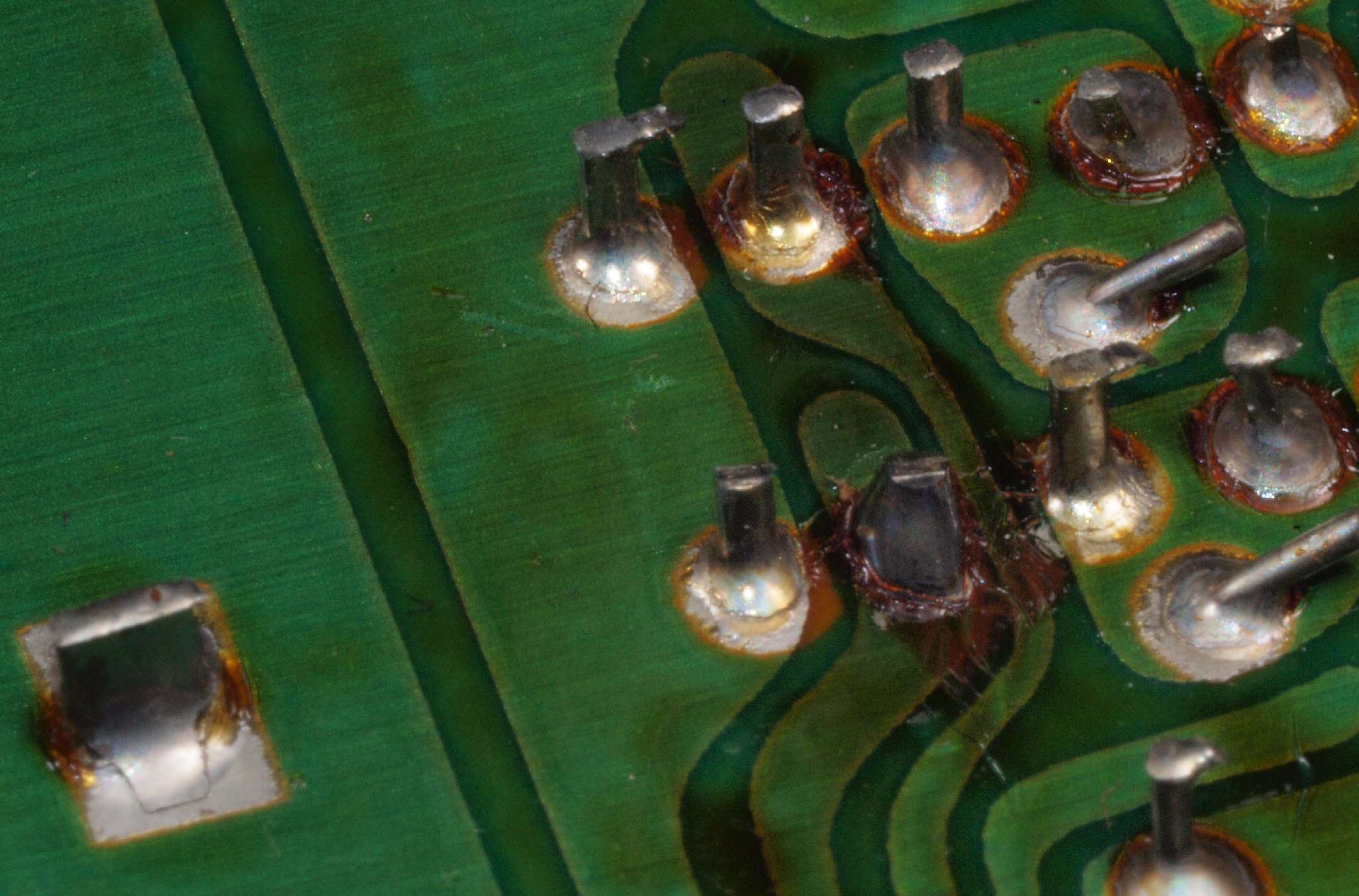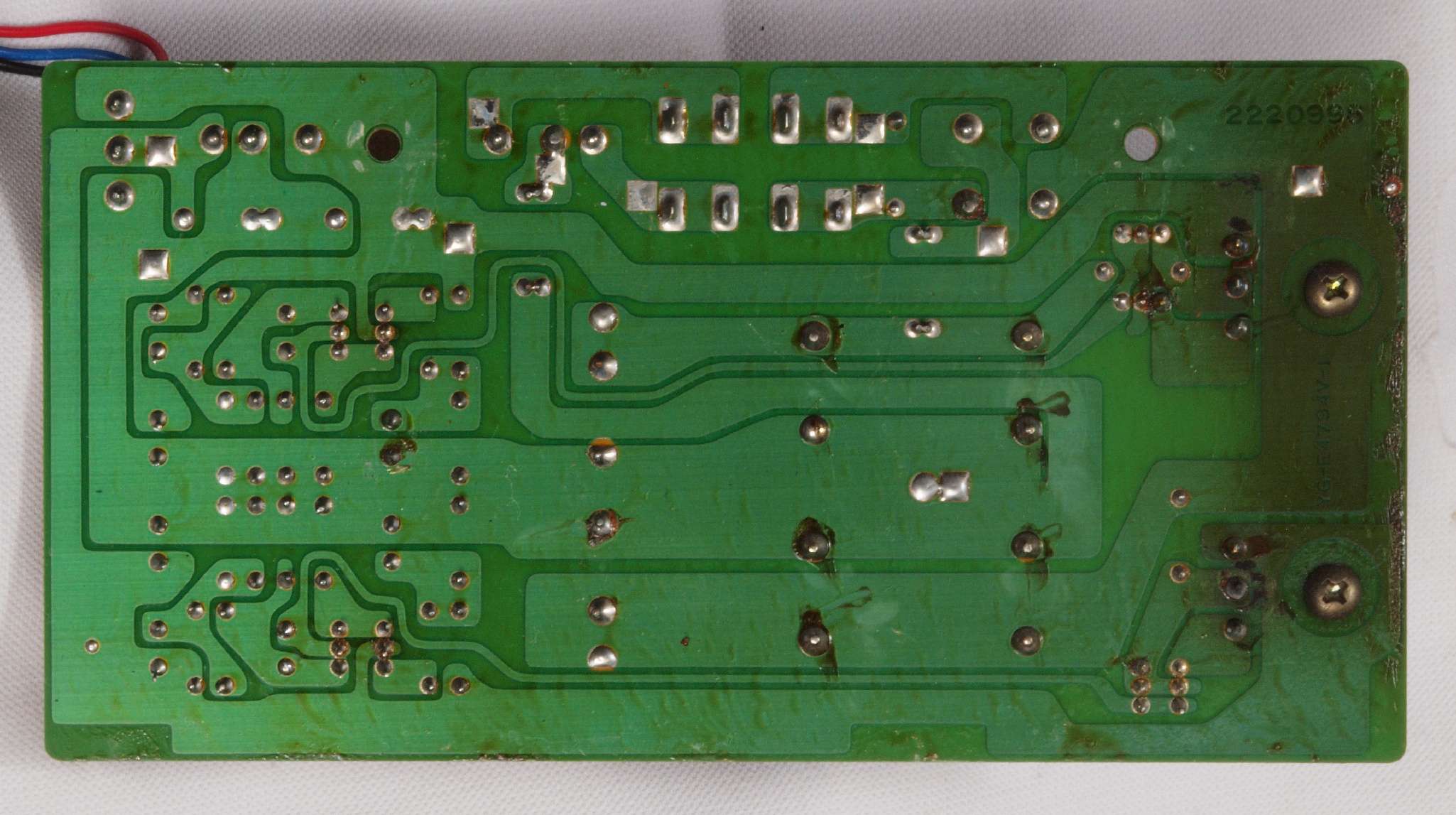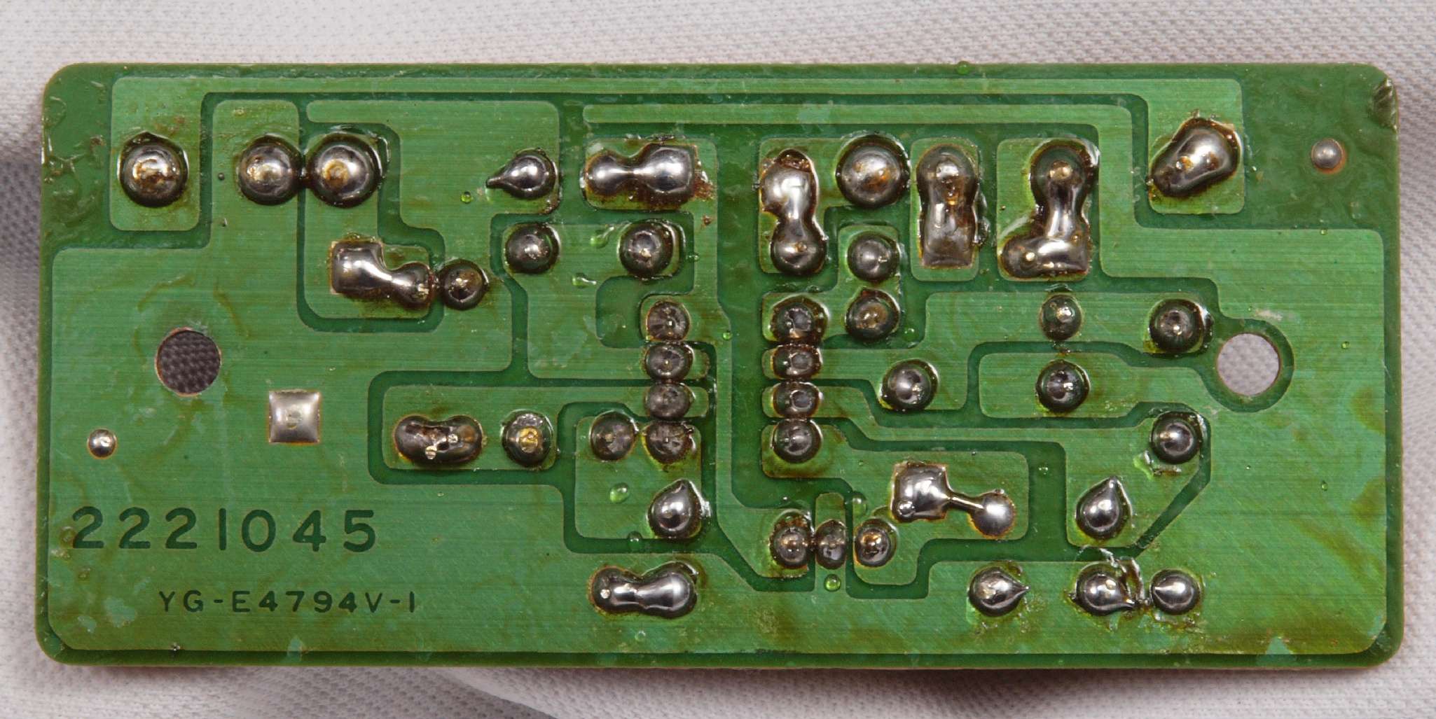 | C332. 修理中 電源・コントロール基板裏。 曲げる方向が悪く隣の銅箔に? | ||||||||||||||||||||||||||||||||||||||||||||||||||||