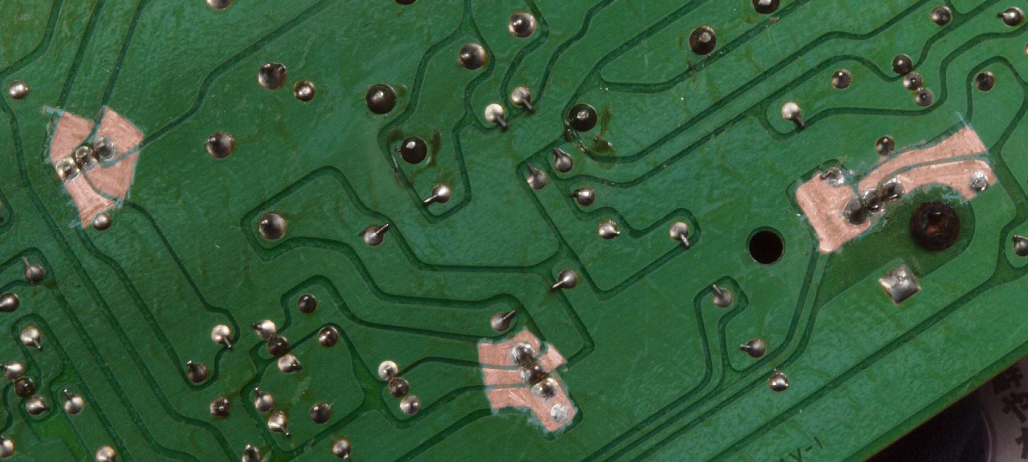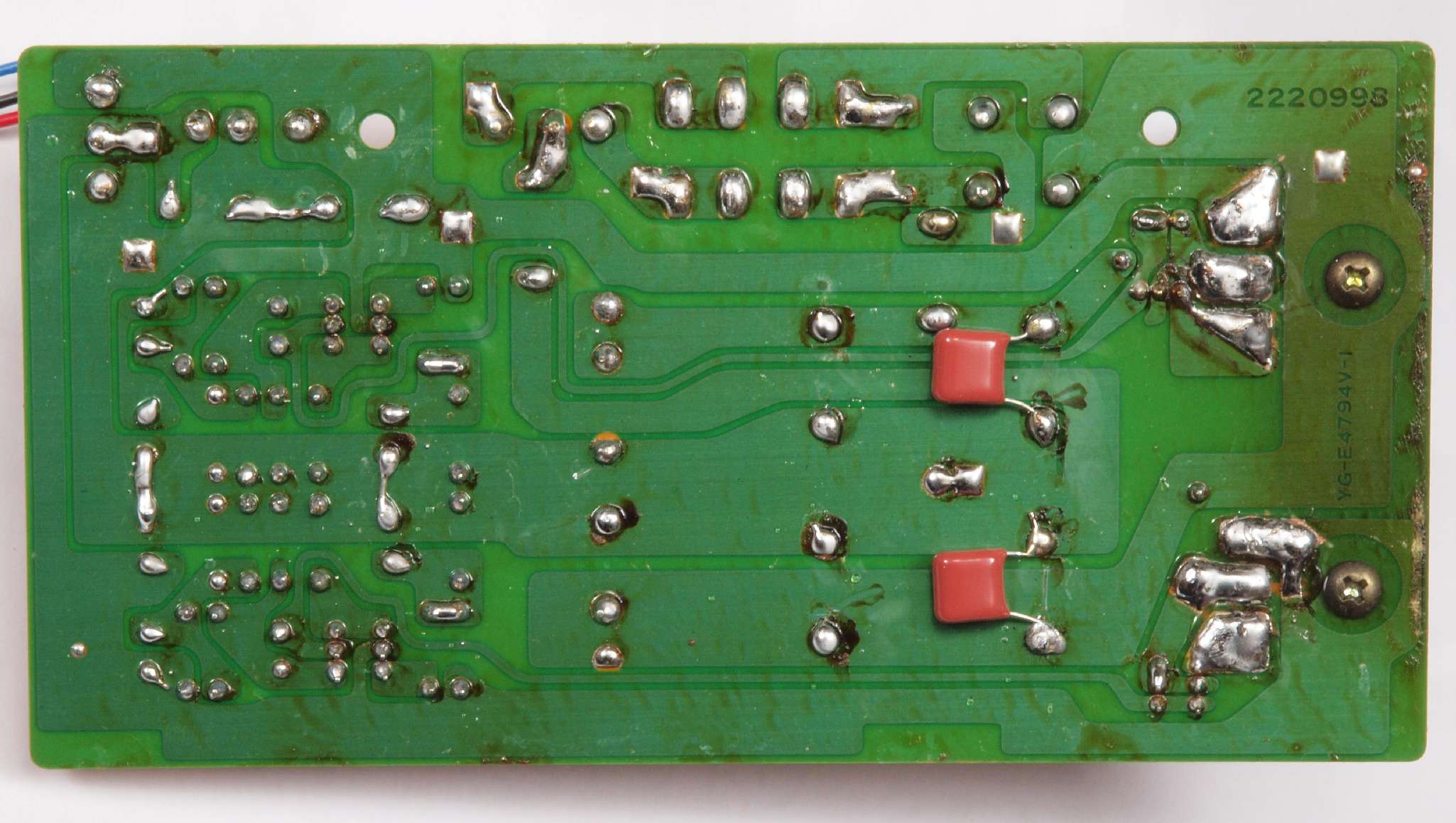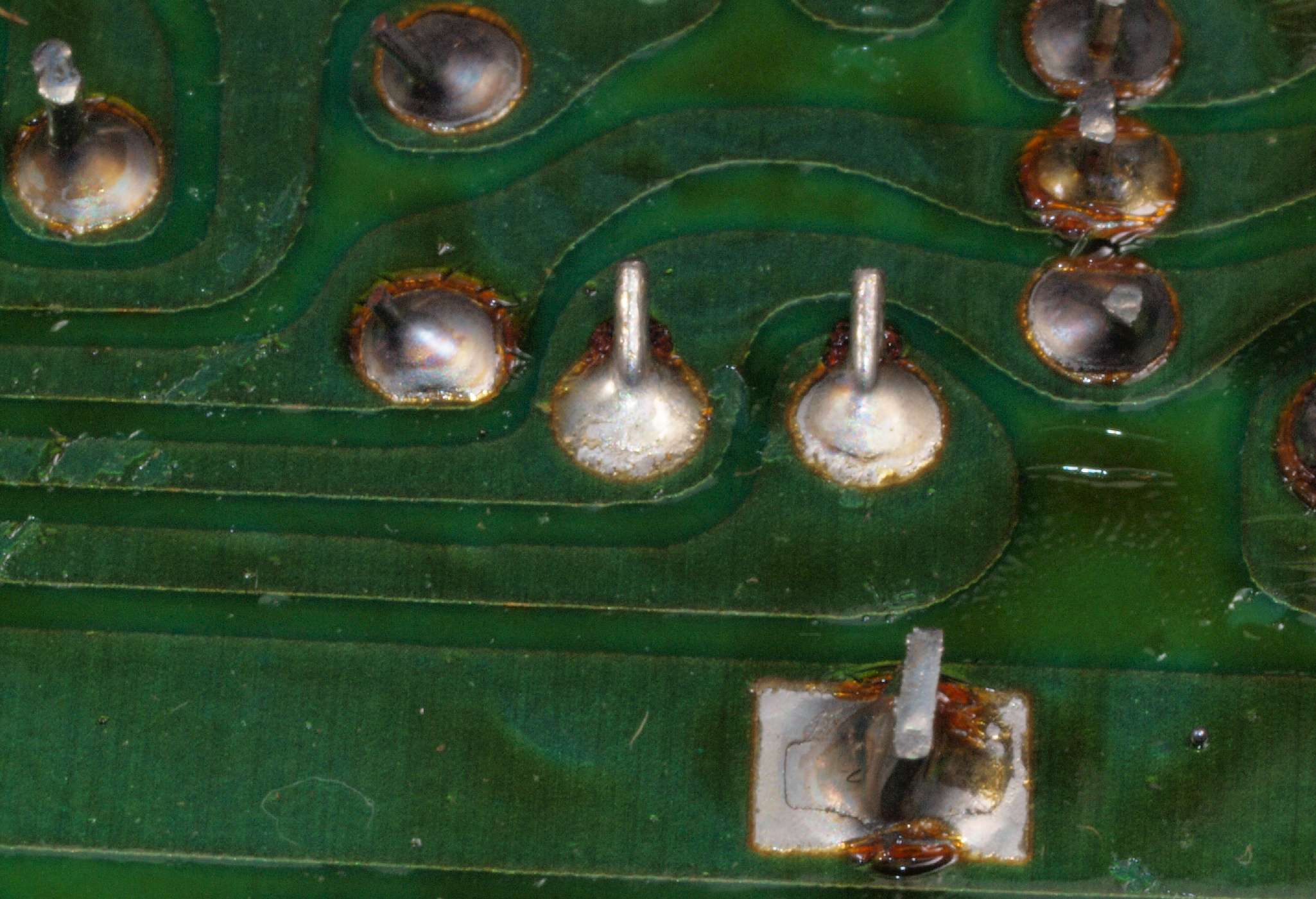 | C332. 修理中 電源・コントロール基板裏。 曲げる方向が悪く隣の銅箔に? | ||||||||||||||||||||||||||||||||||||||||||||||||||||