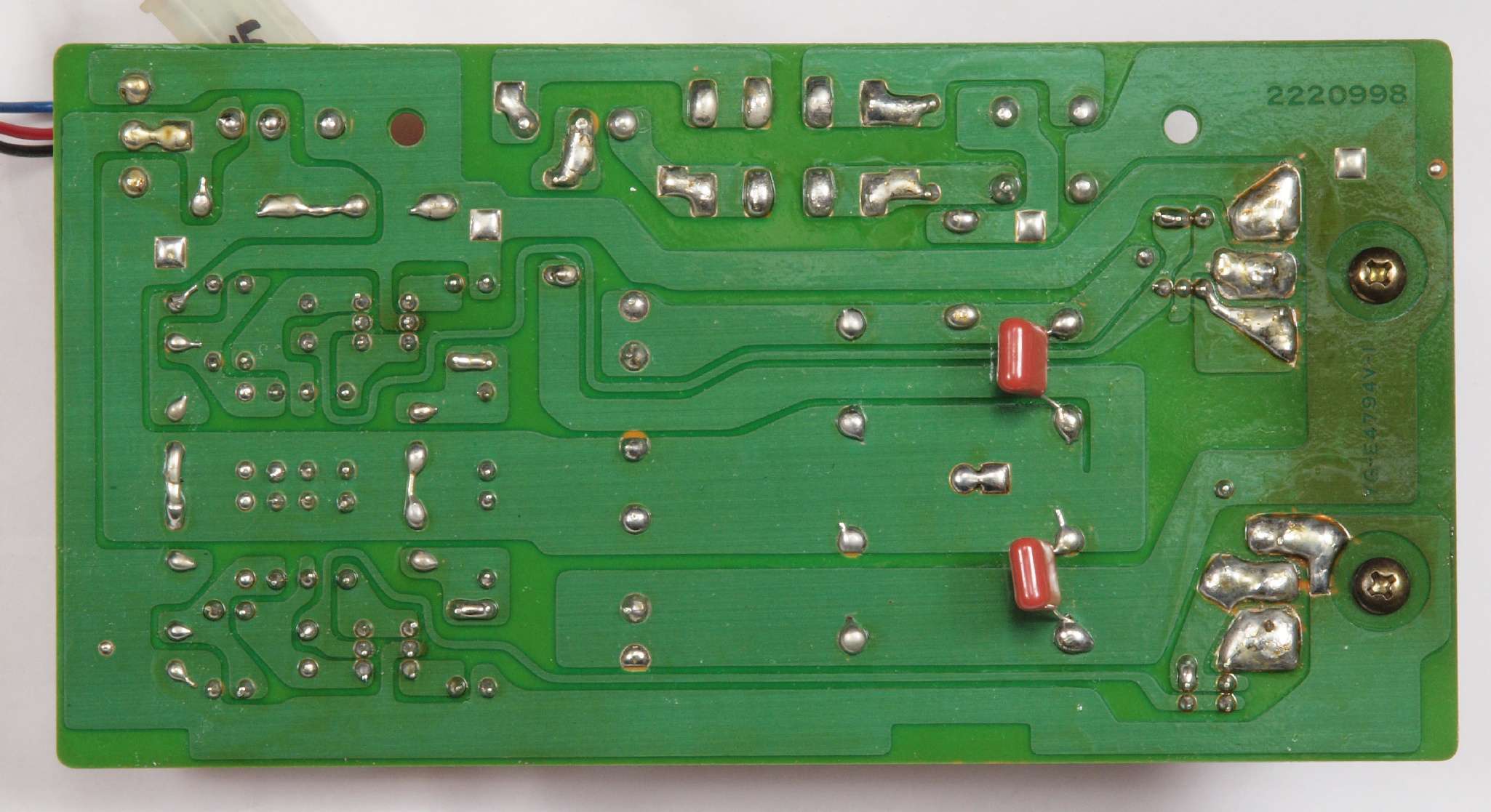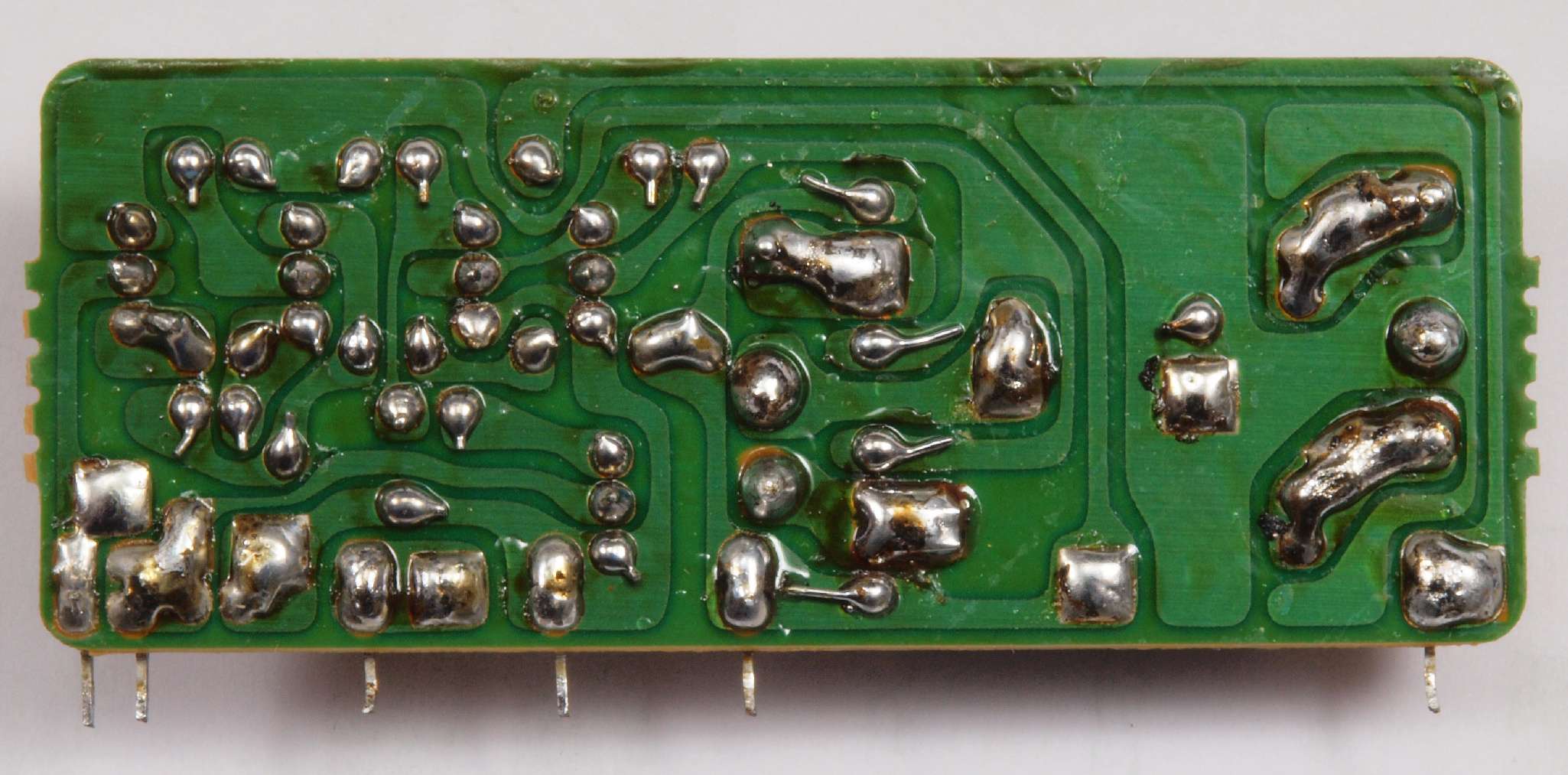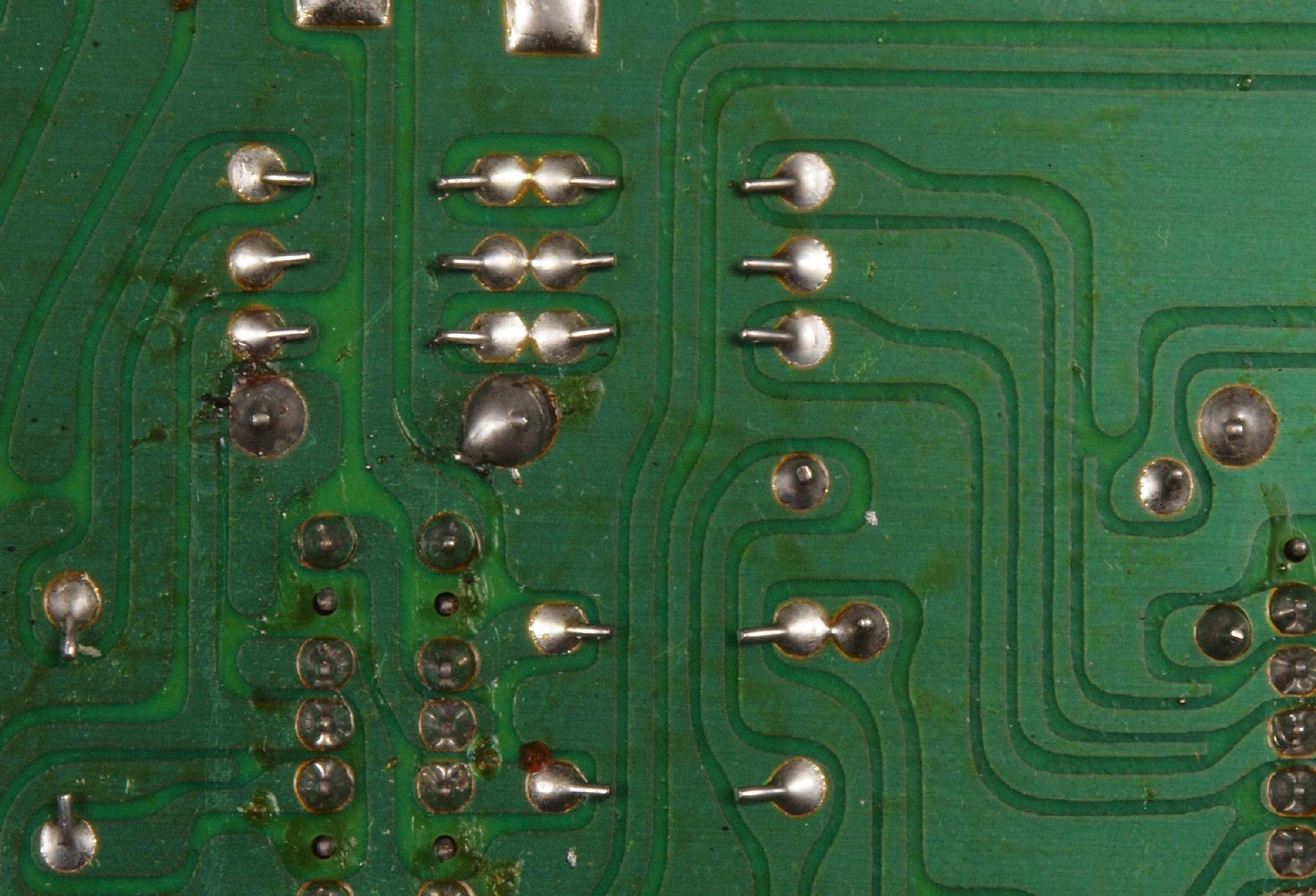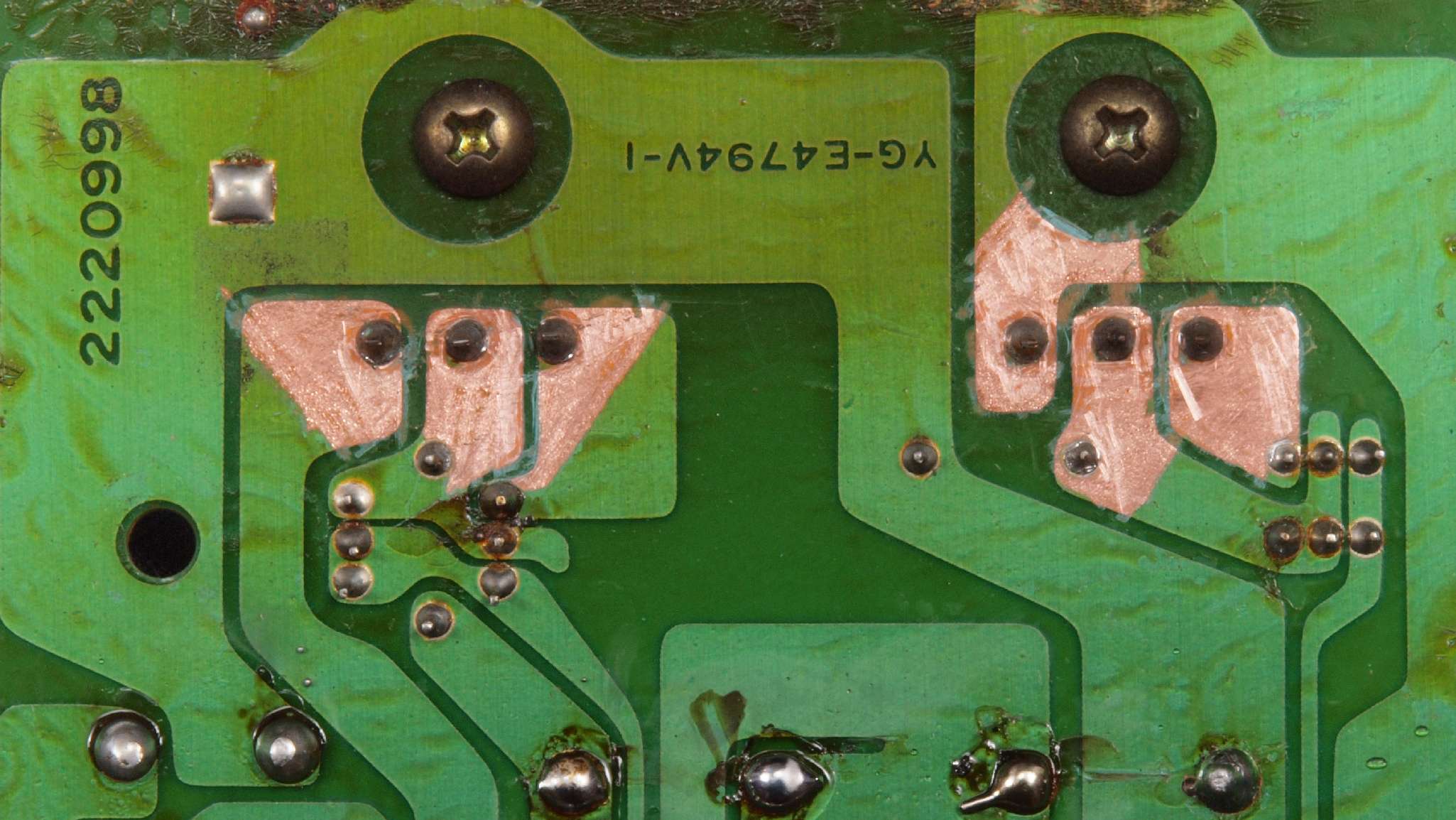 | C332. 修理中 電源・コントロール基板裏。 曲げる方向が悪く隣の銅箔に? | ||||||||||||||||||||||||||||||||||||||||||||||||||||