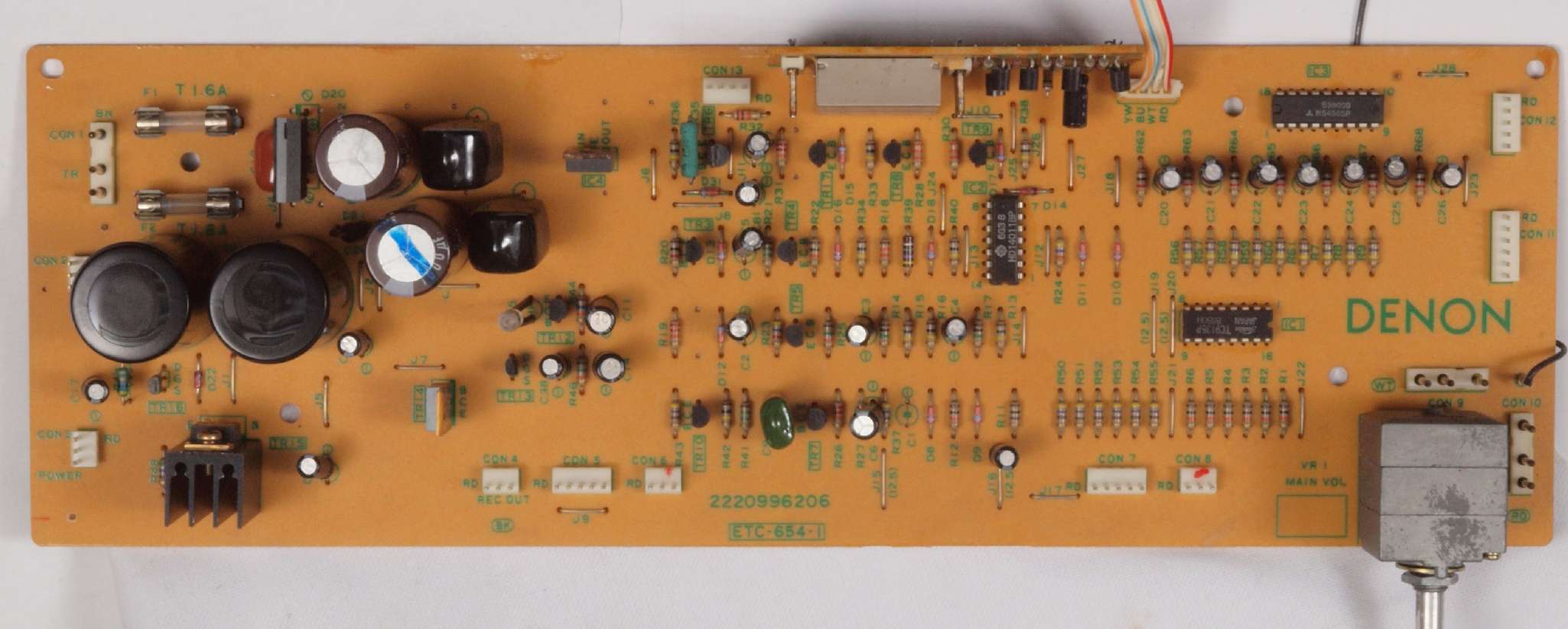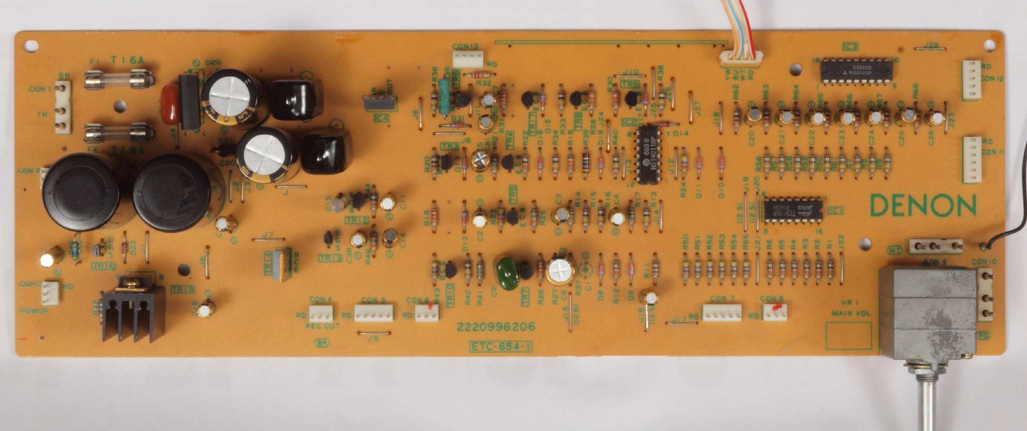 | C114. 修理中 EQ−HEAD-AMP基板。 フイルムコンデンサー(高域補正)の足の差し込みが不十分で、半田が無。 MCトランス使用のMC入力(Phono−1)なので、トランスの特性のお陰で、RLの差が僅差で解らなかったかも? |