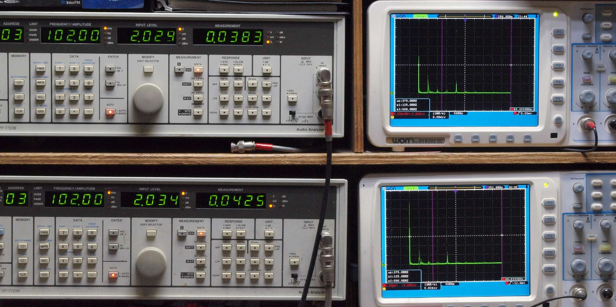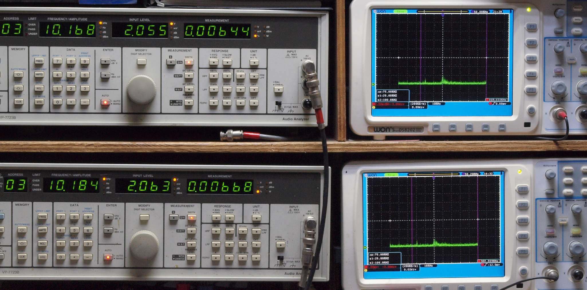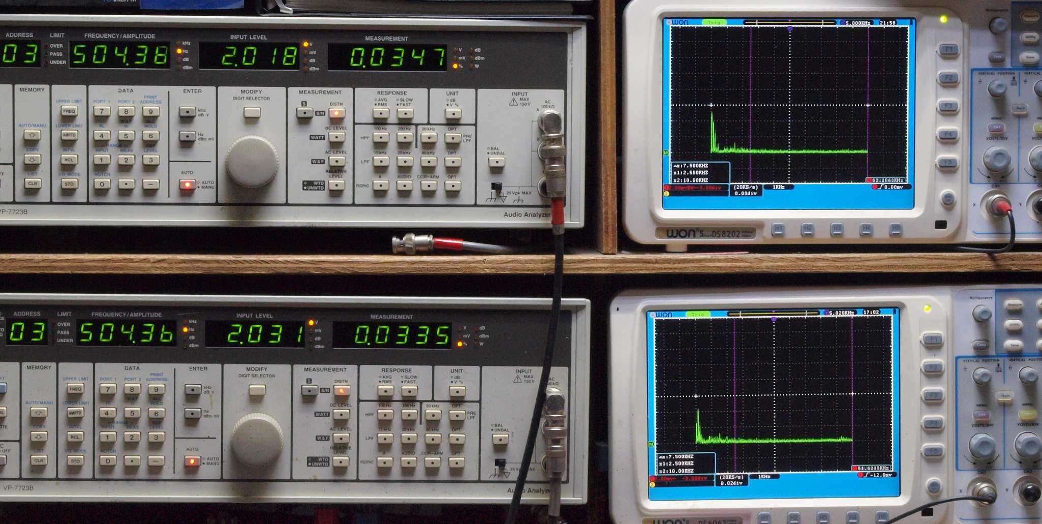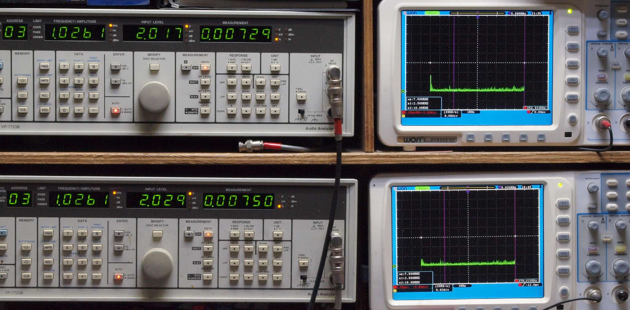 | E. 調整・測定。 画像をクリックすると、大きく(横幅2050ドット)表示されます。 E0. 出力・歪み率測定・調整。 「見方」。 上段中 右側SP出力を「Audio Analyzer Panasonic VP−7723B」により測定。 表示LED、 左端=メモリーNo、 中左=周波数測定、 中右=出力電圧測定、 右端=歪み率測定。 上段右端 VP−7723Bの基本波除去出力を「owon SDS8202(200MHZ)」で「FFT分析」表示。 下段中 左側SP出力を「Audio Analyzer Panasonic VP−7723B」により測定。 表示LED、 左端=メモリーNo、 中左=周波数測定、 中右=出力電圧測定、 右端=歪み率測定。 下段右端 VP−7723Bの基本波除去出力を「owon SDS6062(200MHZ)」で「FFT分析」表示。 下段左端 オーディオ発振器 VP−7201A より50Hz〜100kHzの信号を出し(歪み率=約0.003%)、ATT+分配器を通し、AMPに入力。 よって、ダイアル設定出力レベルより低くなります。測定機器の仕様や整備の様子はこちら、「VP−7723B」「VP−7201A」。 FFT画面の見方はこちら。 |