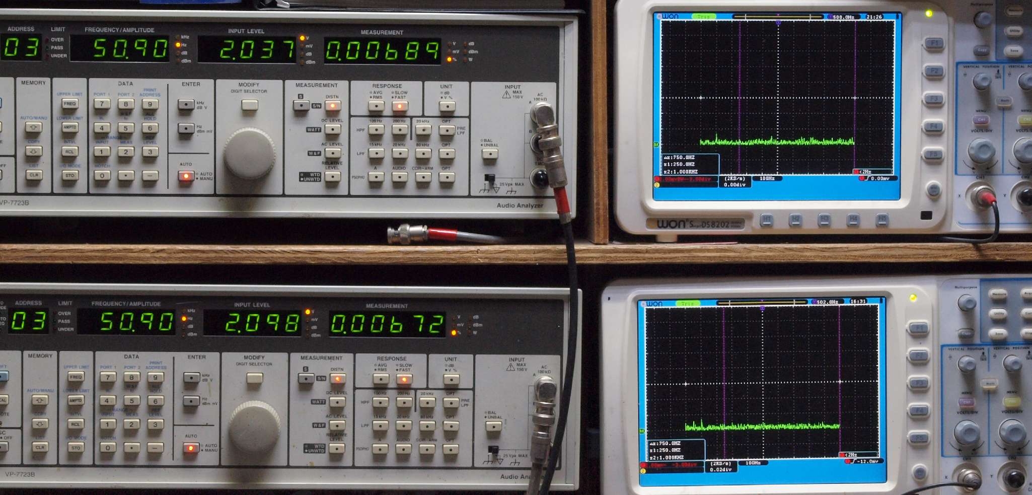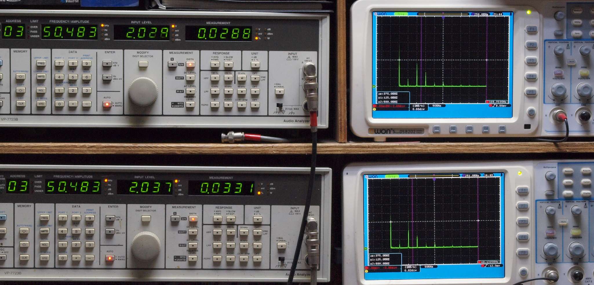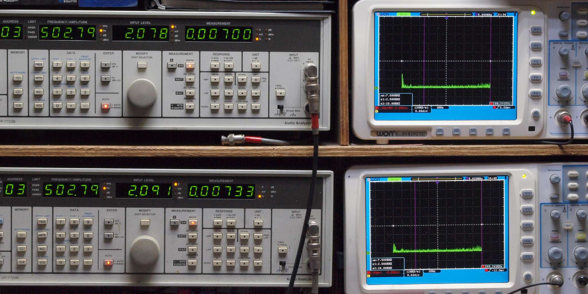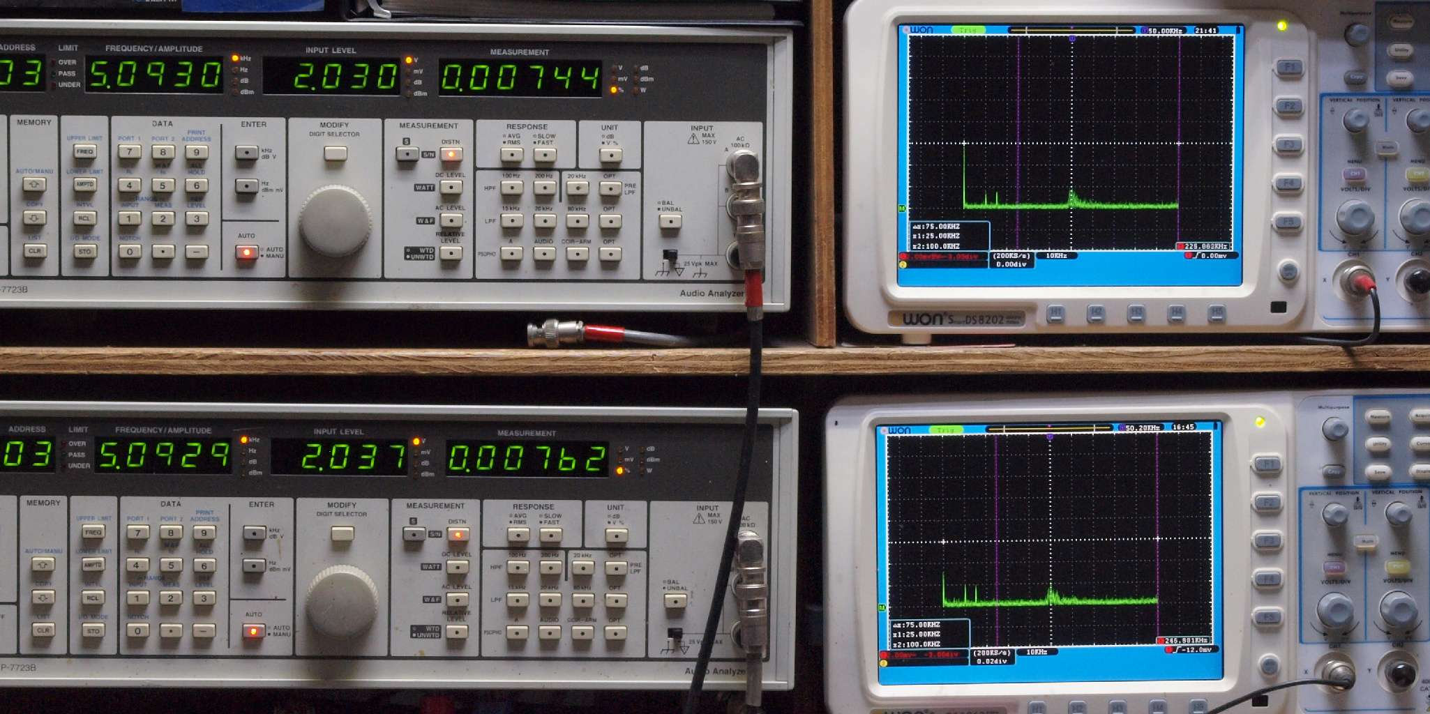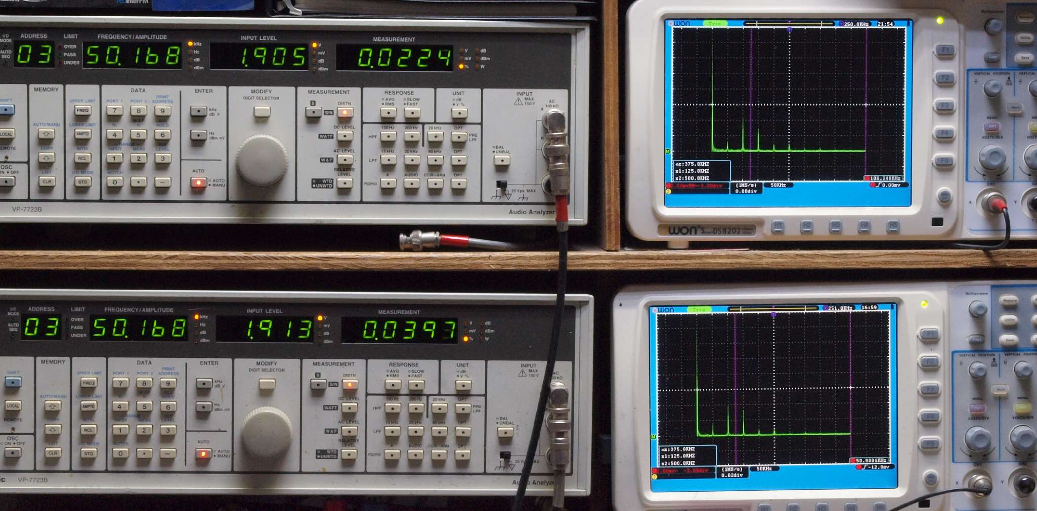 | E. 調整・測定。 画像をクリックすると、大きく(横幅2050ドット)表示されます。 E0. 出力・歪み率測定・調整。 「見方」。 上段中 右側SP出力を「Audio Analyzer Panasonic VP−7723B」により測定。 表示LED、 左端=メモリーNo、 中左=周波数測定、 中右=出力電圧測定、 右端=歪み率測定。 上段右端 VP−7723Bの基本波除去出力を「owon SDS8202(200MHZ)」で「FFT分析」表示。 下段中 左側SP出力を「Audio Analyzer Panasonic VP−7723B」により測定。 表示LED、 左端=メモリーNo、 中左=周波数測定、 中右=出力電圧測定、 右端=歪み率測定。 下段右端 VP−7723Bの基本波除去出力を「owon SDS6062(200MHZ)」で「FFT分析」表示。 下段左端 オーディオ発振器 VP−7201A より50Hz〜100kHzの信号を出し(歪み率=約0.003%)、ATT+分配器を通し、AMPに入力。 よって、ダイアル設定出力レベルより低くなります。測定機器の仕様や整備の様子はこちら、「VP−7723B」「VP−7201A」。 FFT画面の見方はこちら。 |