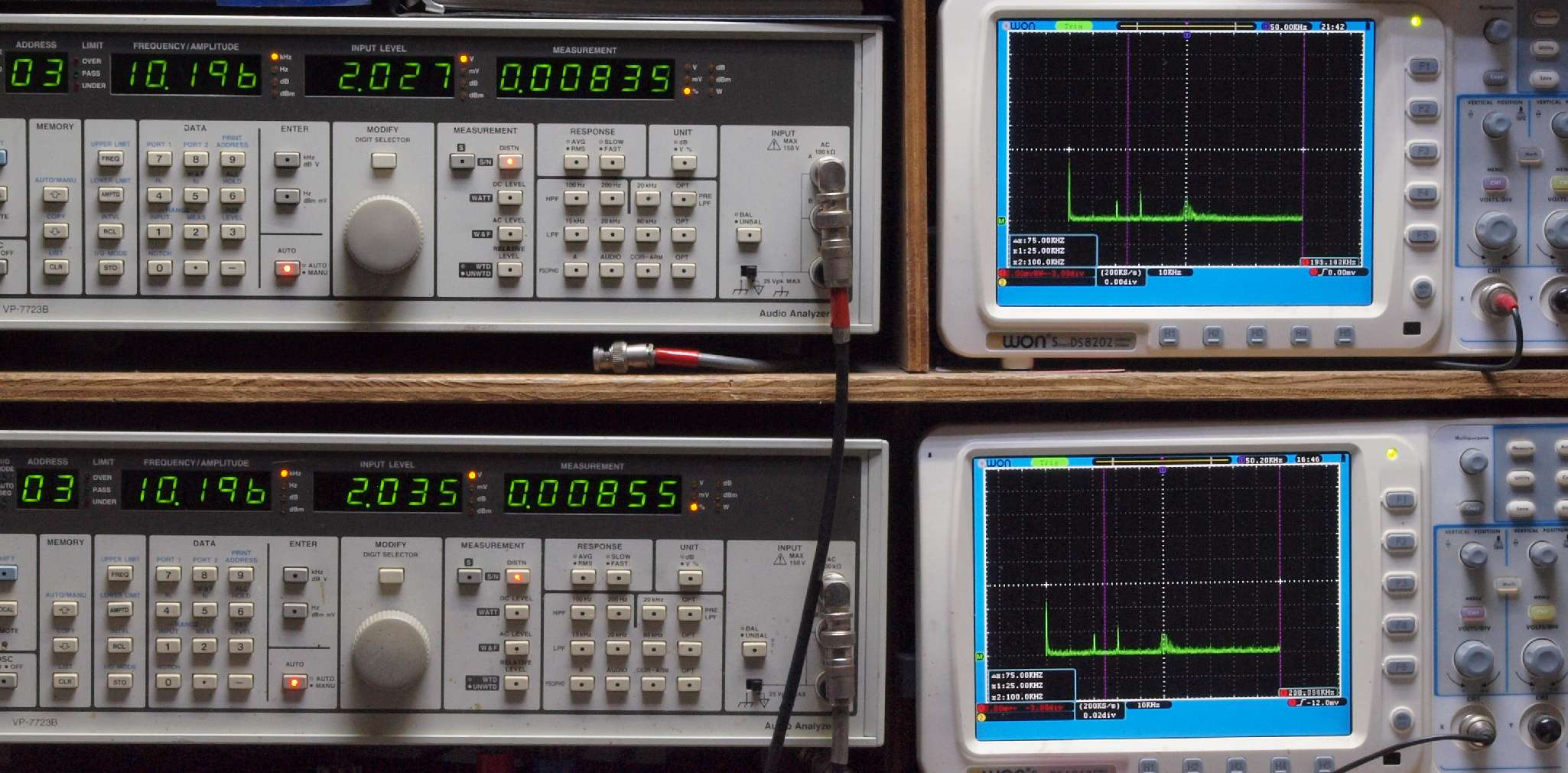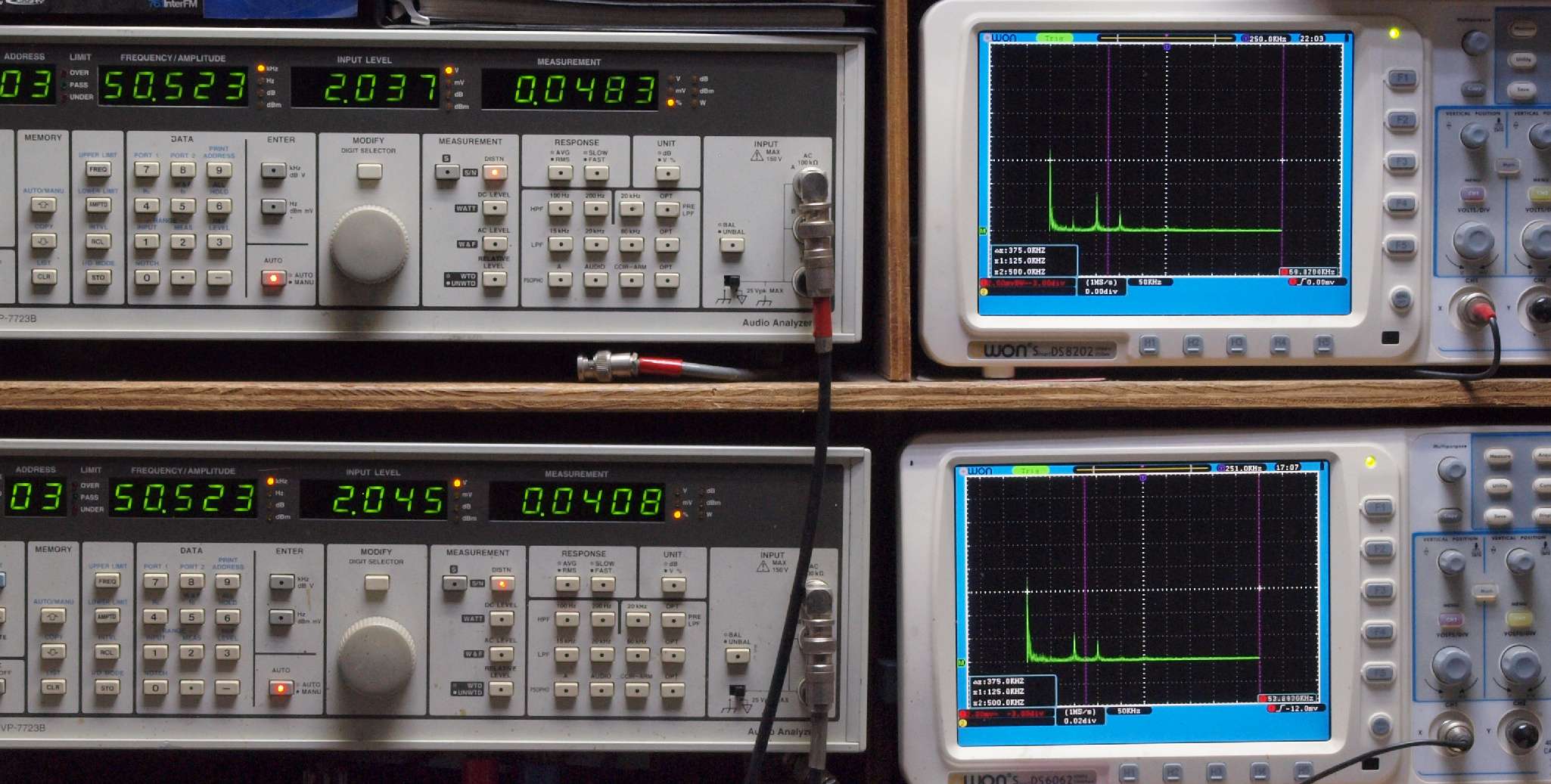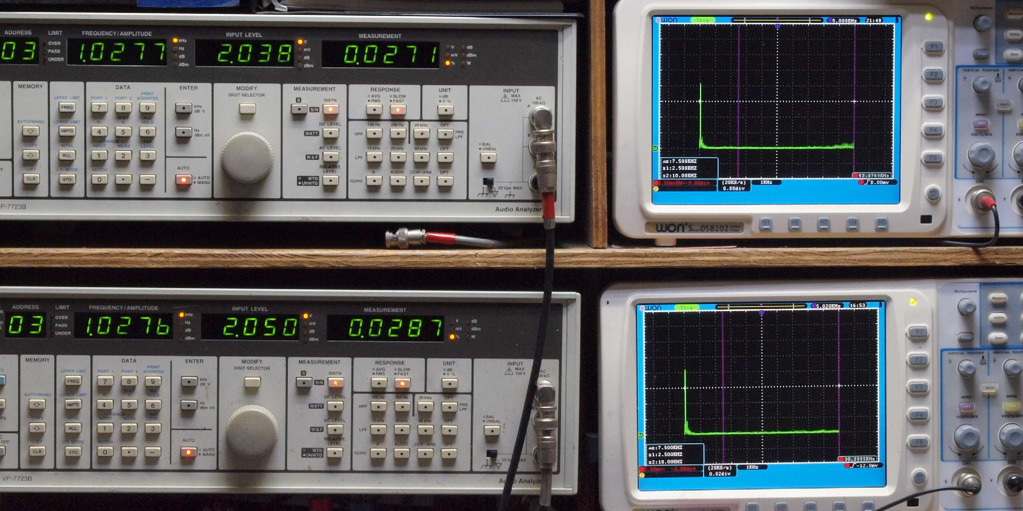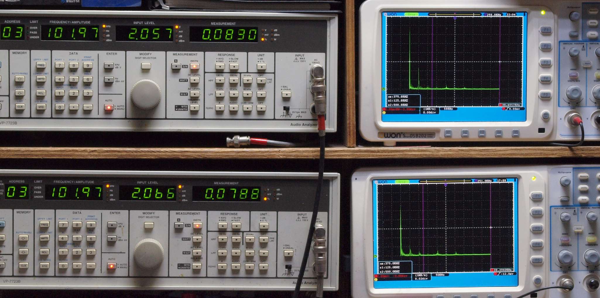 | E. 調整・測定。 画像をクリックすると、大きく(横幅2050ドット)表示されます。 E0. 出力・歪み率測定・調整。 「見方」。 上段中 右側SP出力を「Audio Analyzer Panasonic VP−7723B」により測定。 表示LED、 左端=メモリーNo、 中左=周波数測定、 中右=出力電圧測定、 右端=歪み率測定。 上段右端 VP−7723Bの基本波除去出力を「owon SDS8202(200MHZ)」で「FFT分析」表示。 下段中 左側SP出力を「Audio Analyzer Panasonic VP−7723B」により測定。 表示LED、 左端=メモリーNo、 中左=周波数測定、 中右=出力電圧測定、 右端=歪み率測定。 下段右端 VP−7723Bの基本波除去出力を「owon SDS6062(200MHZ)」で「FFT分析」表示。 下段左端 オーディオ発振器 VP−7201A より50Hz〜100kHzの信号を出し(歪み率=約0.003%)、ATT+分配器を通し、AMPに入力。 よって、ダイアル設定出力レベルより低くなります。測定機器の仕様や整備の様子はこちら、「VP−7723B」「VP−7201A」。 FFT画面の見方はこちら。 |