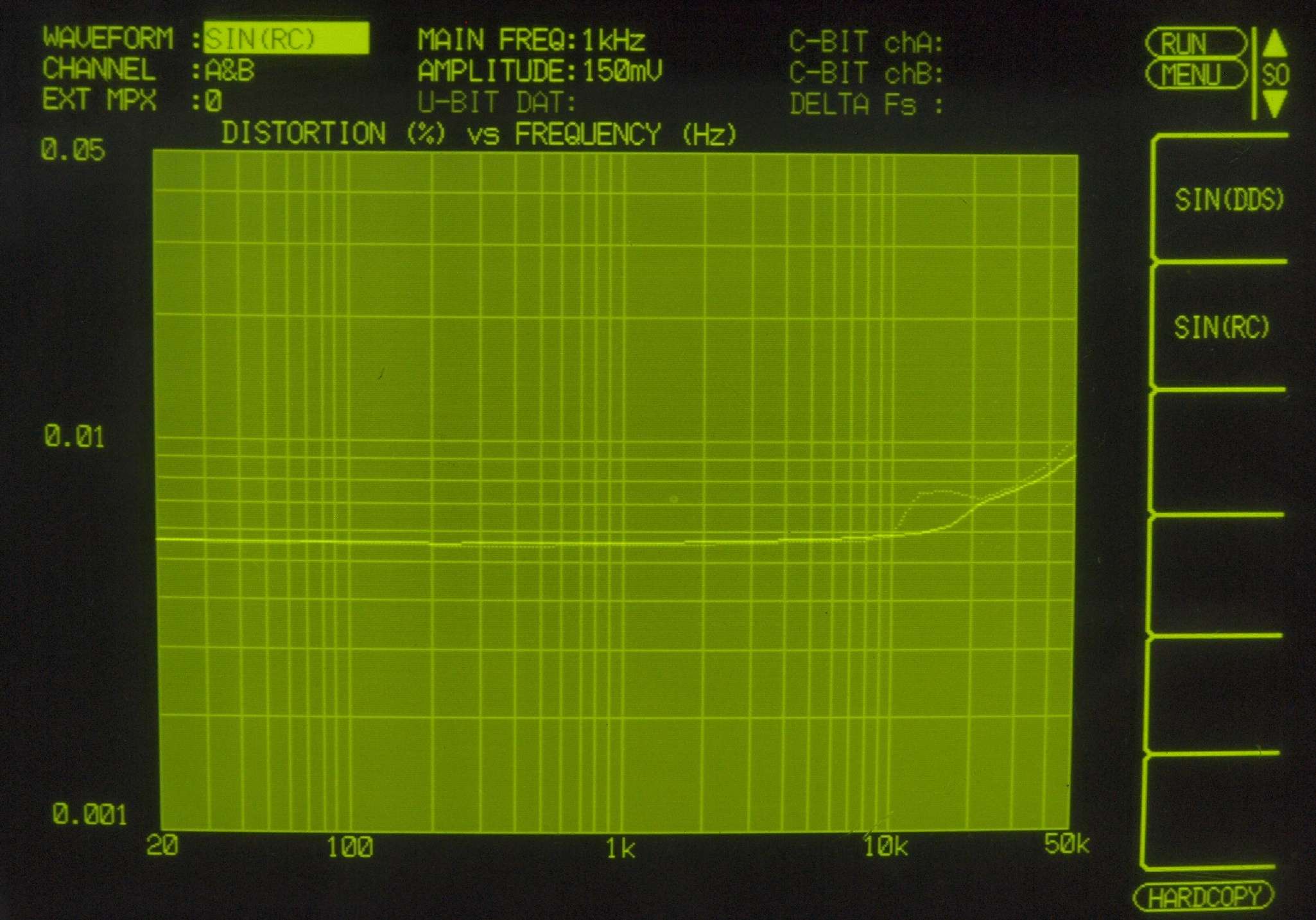| E45. MC_5kHz入力、R側出力電圧=2V、 0.01106%歪み。 L側出力電圧=2V、 0.0287%歪み。 「FFT分析」のオシロのカーソル周波数、左=25kHz、右=100kHz。 |