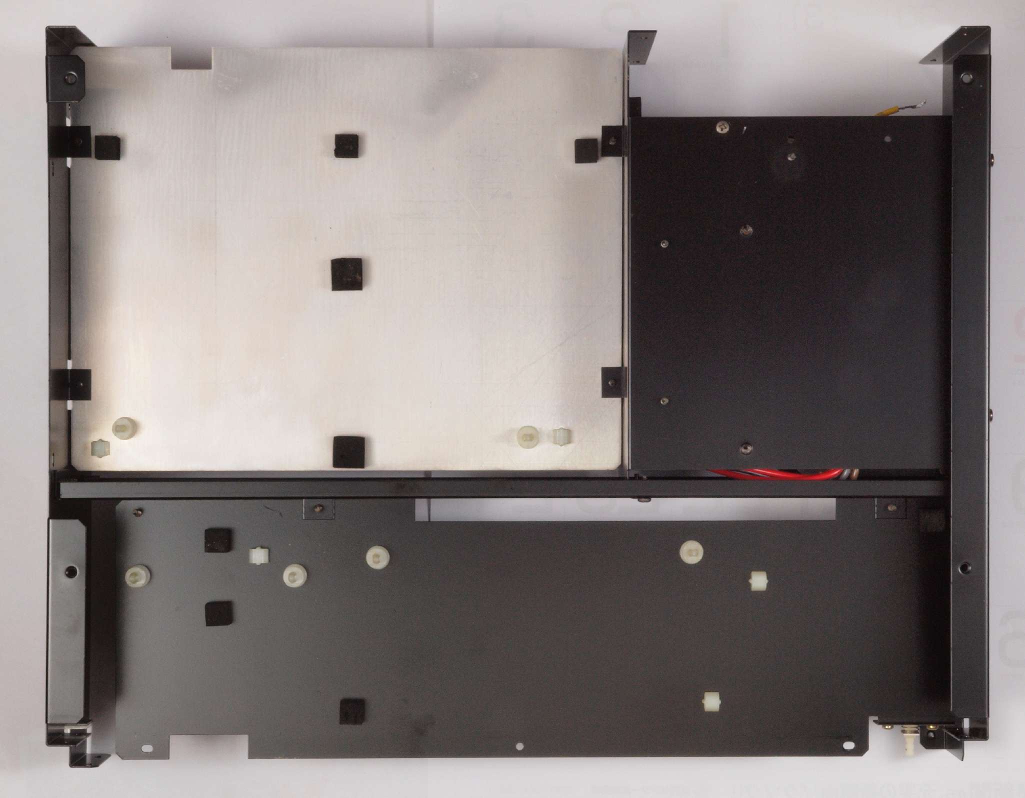 | C. 修理状況 。 画像をクリックすると、大きく(横幅2050ドット)表示されます。 C1. 修理中 基板を全て取り除いたシャーシを上から見る。 |