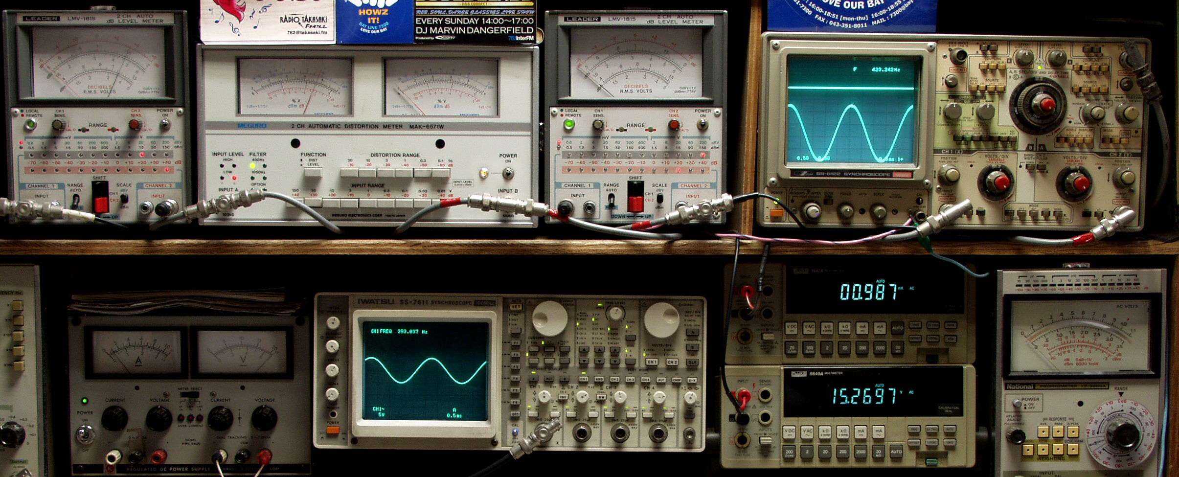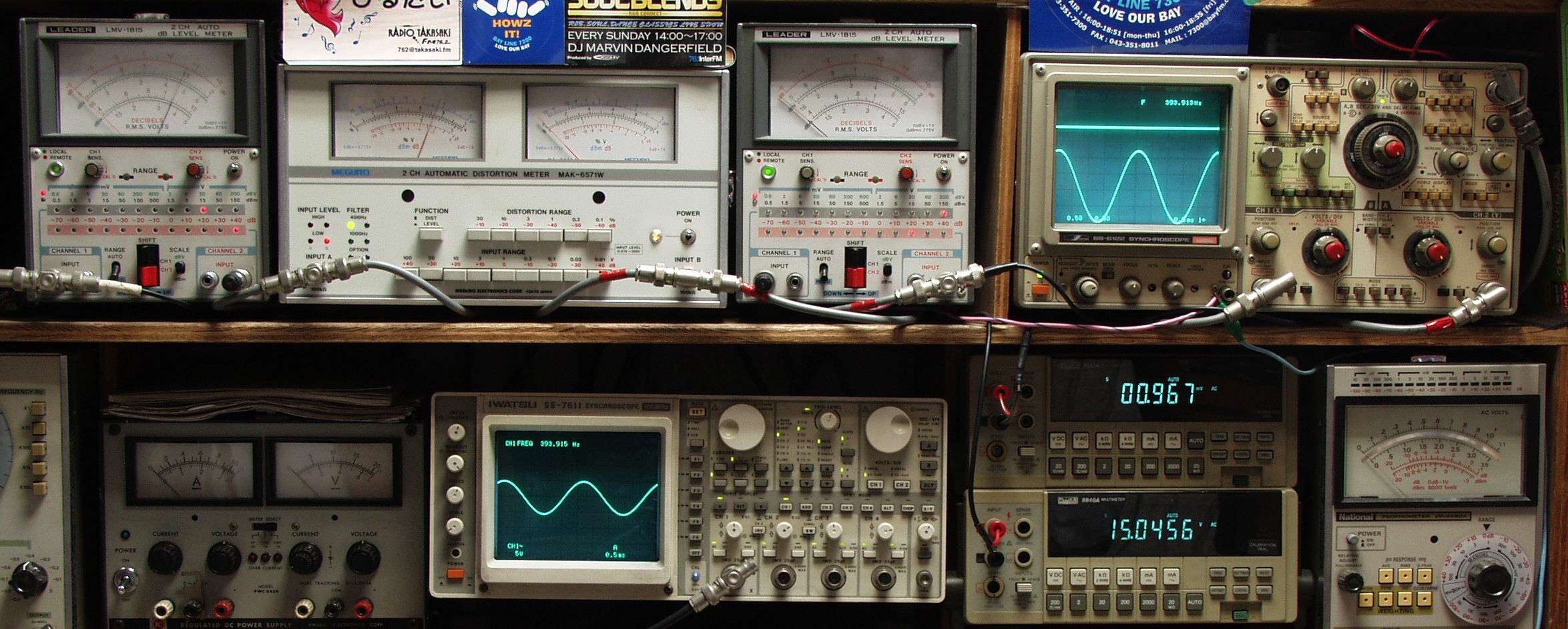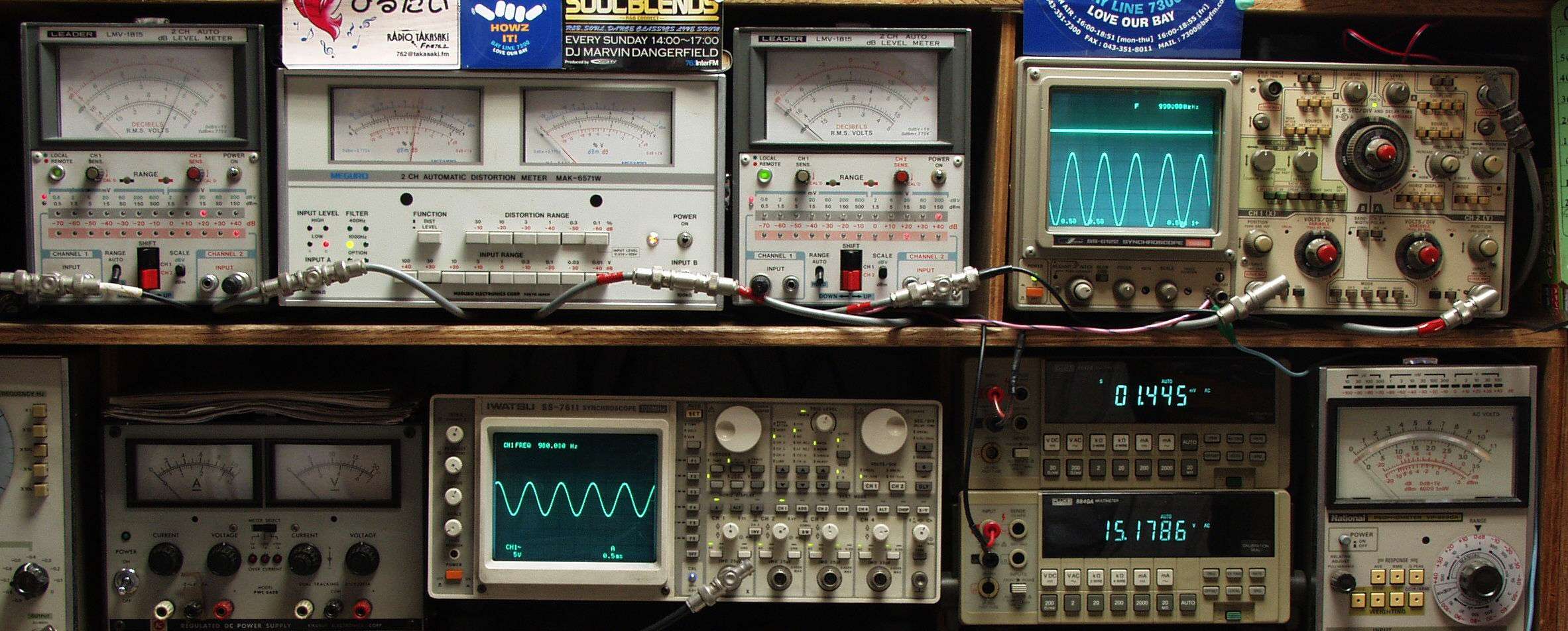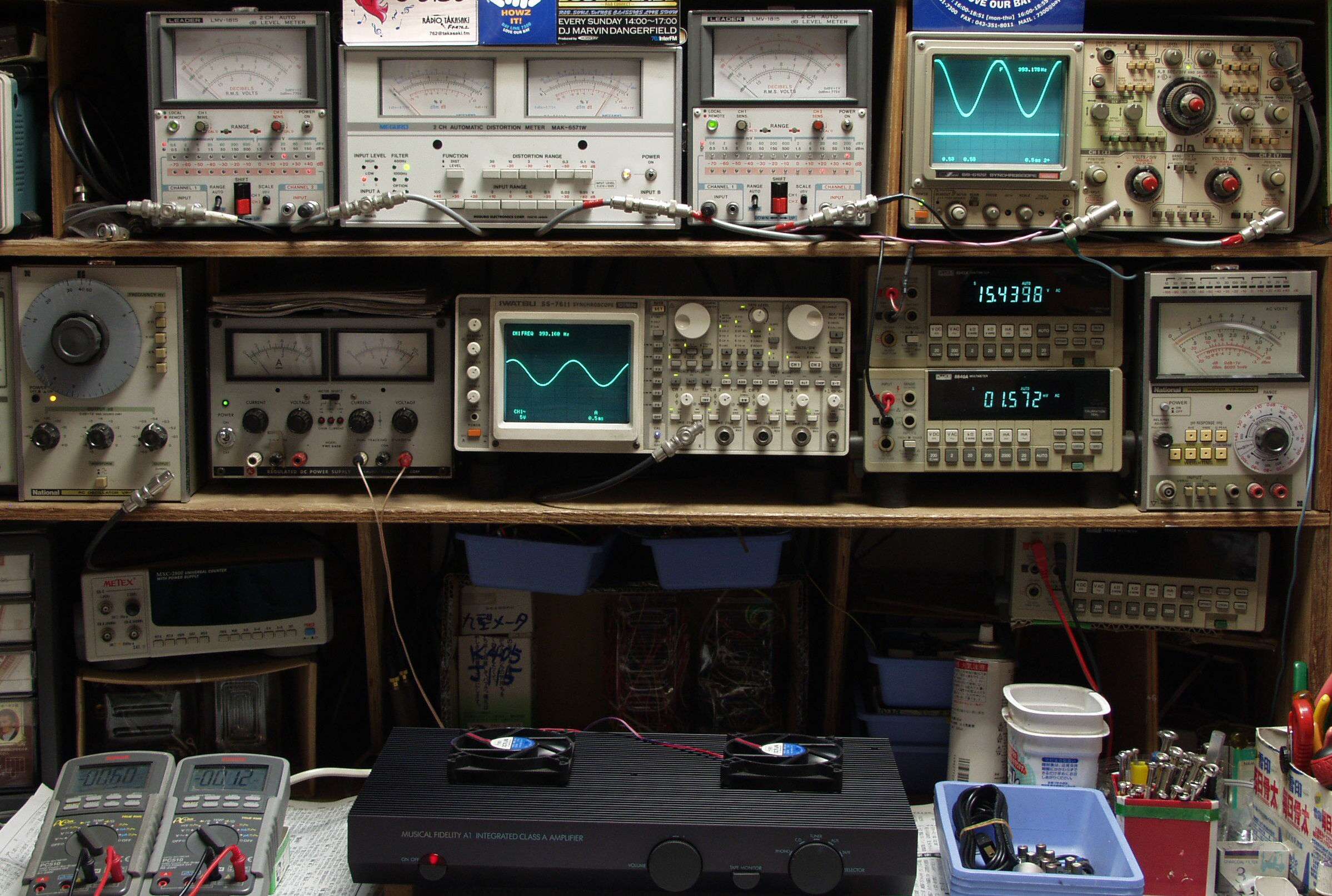 | E. 調整・測定. E1. 出力・歪み率測定. <見方> 下段左端 オーディオ発振器より400HZ・1KHZの信号を出し(歪み率=約0.003%)これをAMPに入力し、出力を測定. 下段中左 オシロ=入力波形(オーディオ発振器のTTLレベル). 下段中右上=周波数計. 上段左端 電圧計=L側出力電圧測定、黒針のみ使用. 上段中左 歪み率計=出力の歪み率測定 左メータ=L出力、右メータ=R出力. 上段中右 電圧計=R側出力電圧測定、赤針のみ使用. 上段右端 オシロ=出力波形、 上=R出力、下=L出力(実際にはRL電圧計の出力「Max1V」を観測). 下段中右上 デジタル電圧計=R出力電圧測定、 下段中右下 デジタル電圧計=L出力電圧測定. |