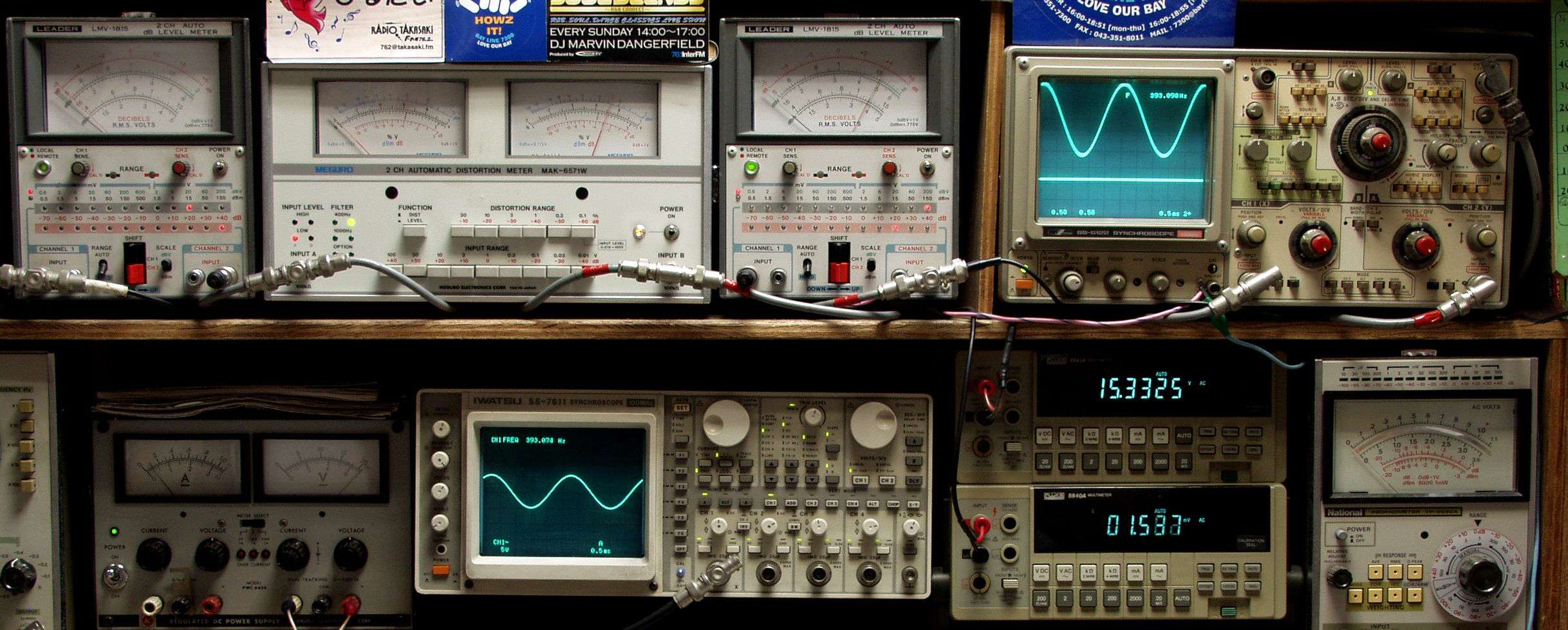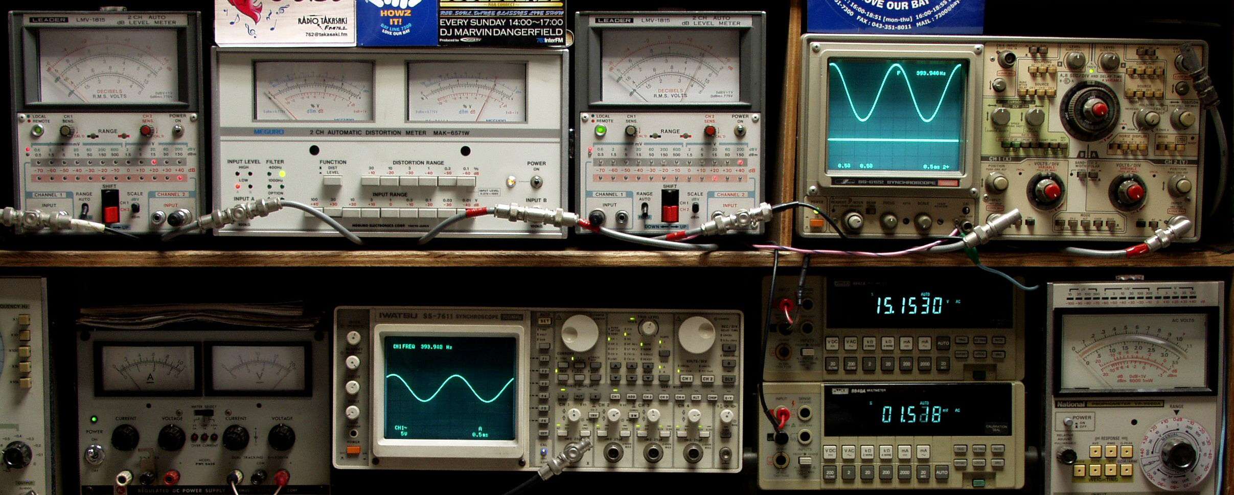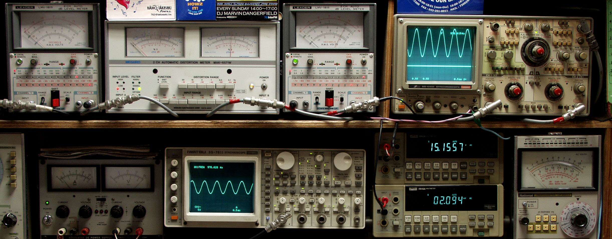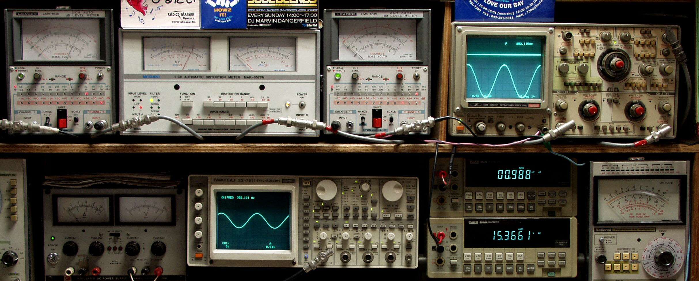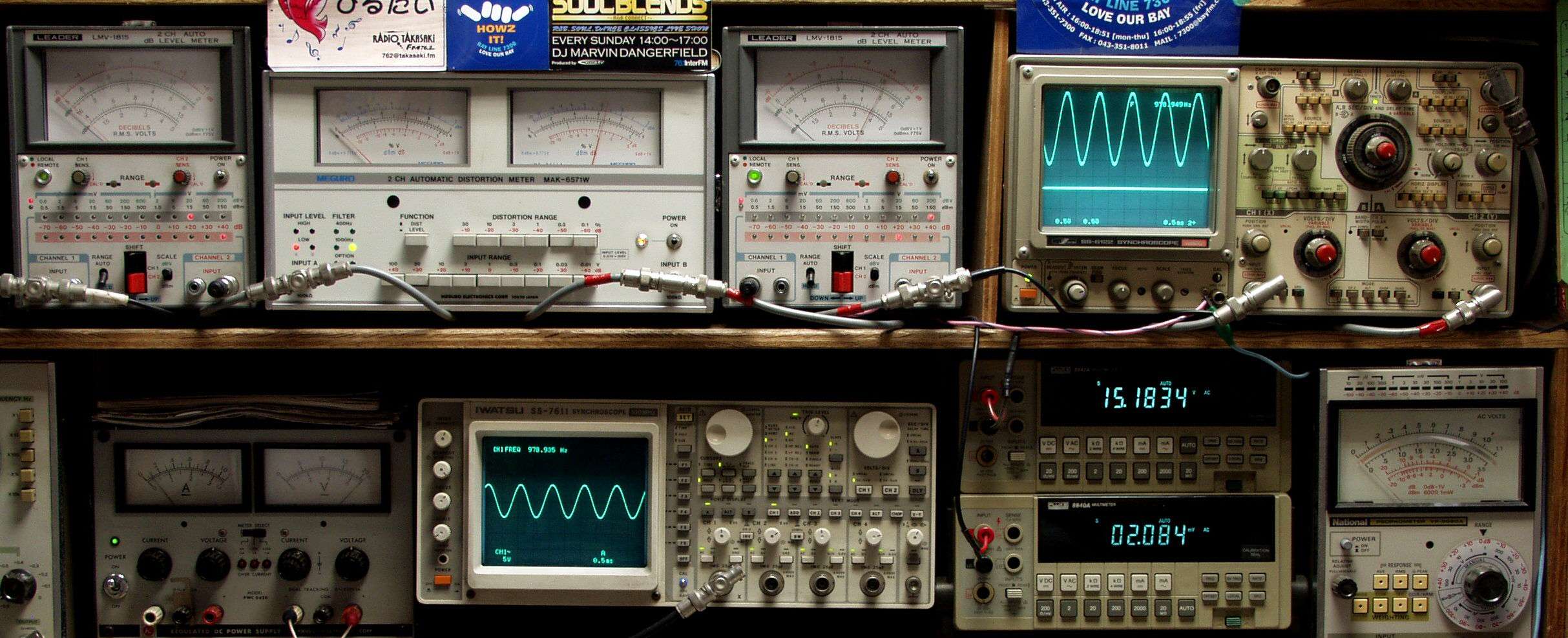 | E. 調整・測定. E1. 出力・歪み率測定. <見方> 下段左端 オーディオ発振器より400HZ・1KHZの信号を出し(歪み率=約0.003%)これをAMPに入力し、出力を測定. 下段中左 オシロ=入力波形(オーディオ発振器のTTLレベル). 下段中右上=周波数計. 上段左端 電圧計=L側出力電圧測定、黒針のみ使用. 上段中左 歪み率計=出力の歪み率測定 左メータ=L出力、右メータ=R出力. 上段中右 電圧計=R側出力電圧測定、赤針のみ使用. 上段右端 オシロ=出力波形、 上=R出力、下=L出力(実際にはRL電圧計の出力「Max1V」を観測). 下段中右上 デジタル電圧計=R出力電圧測定、 下段中右下 デジタル電圧計=L出力電圧測定. |
