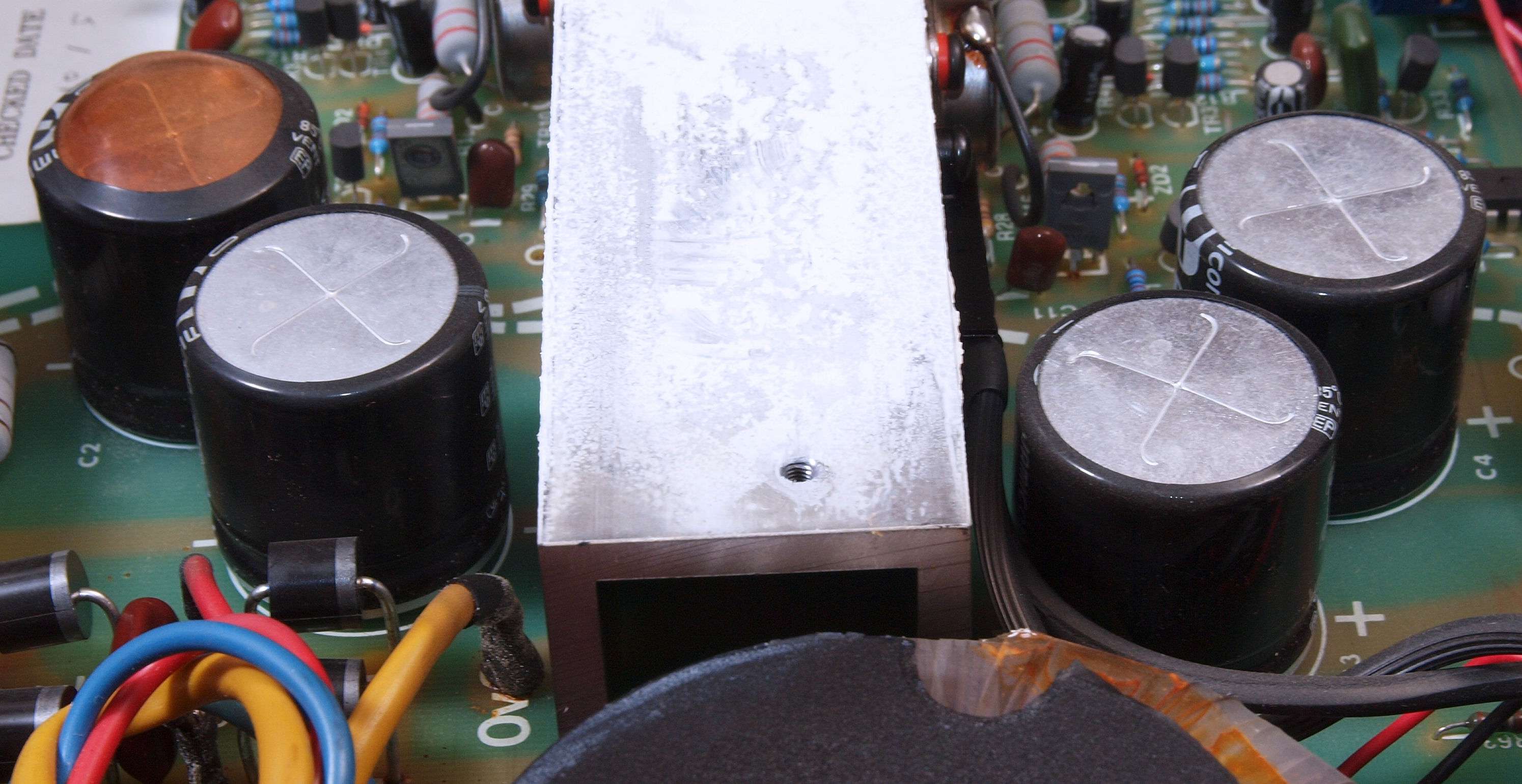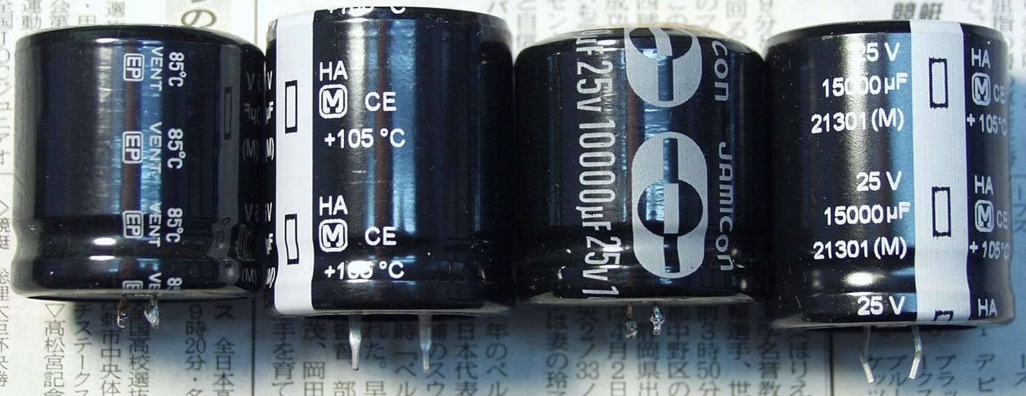 A61. 点検中 電源電解コンデンサーの比較、中=25V/10000μ、両側=交換する、25V/15000μ。