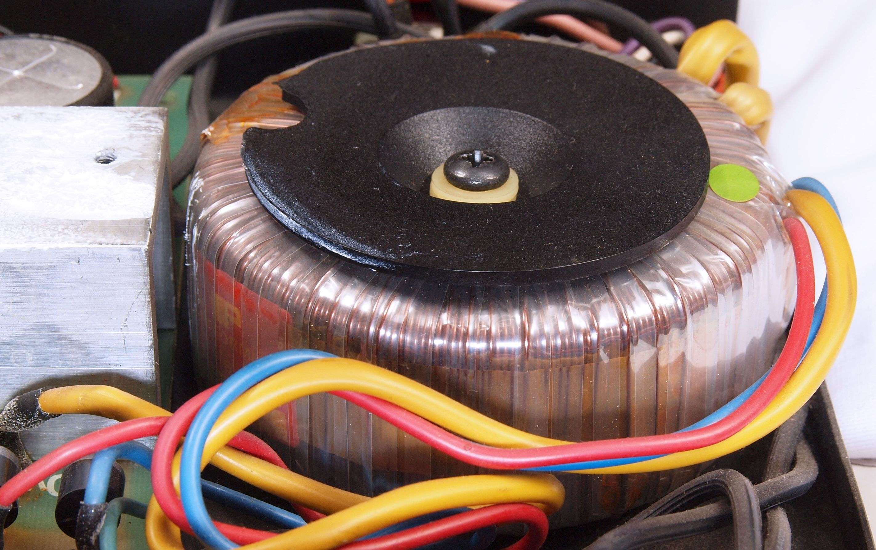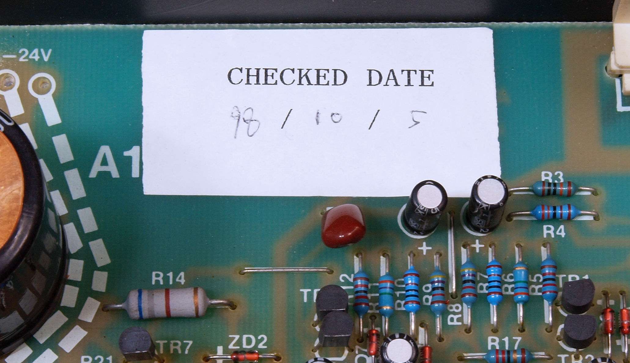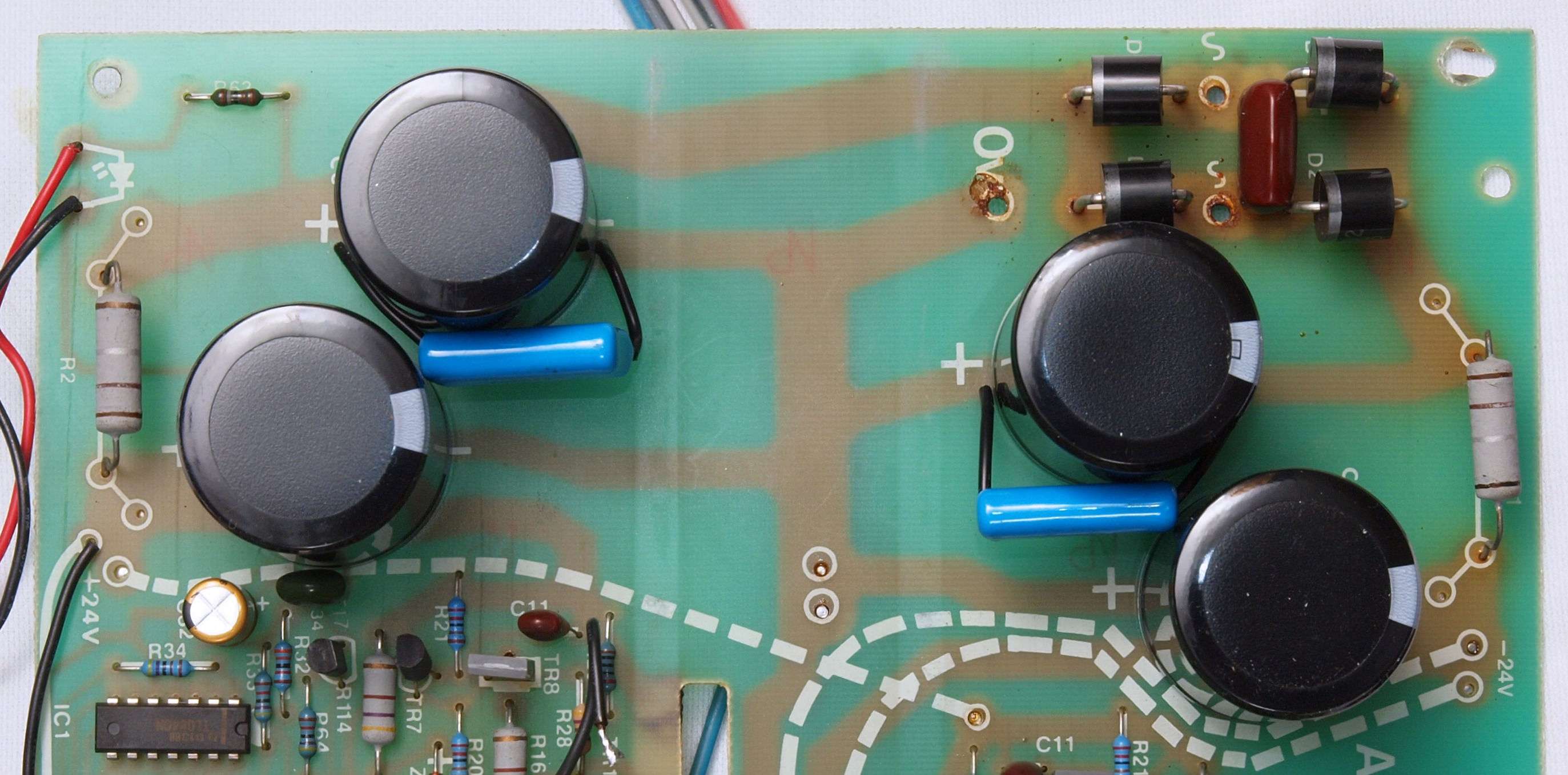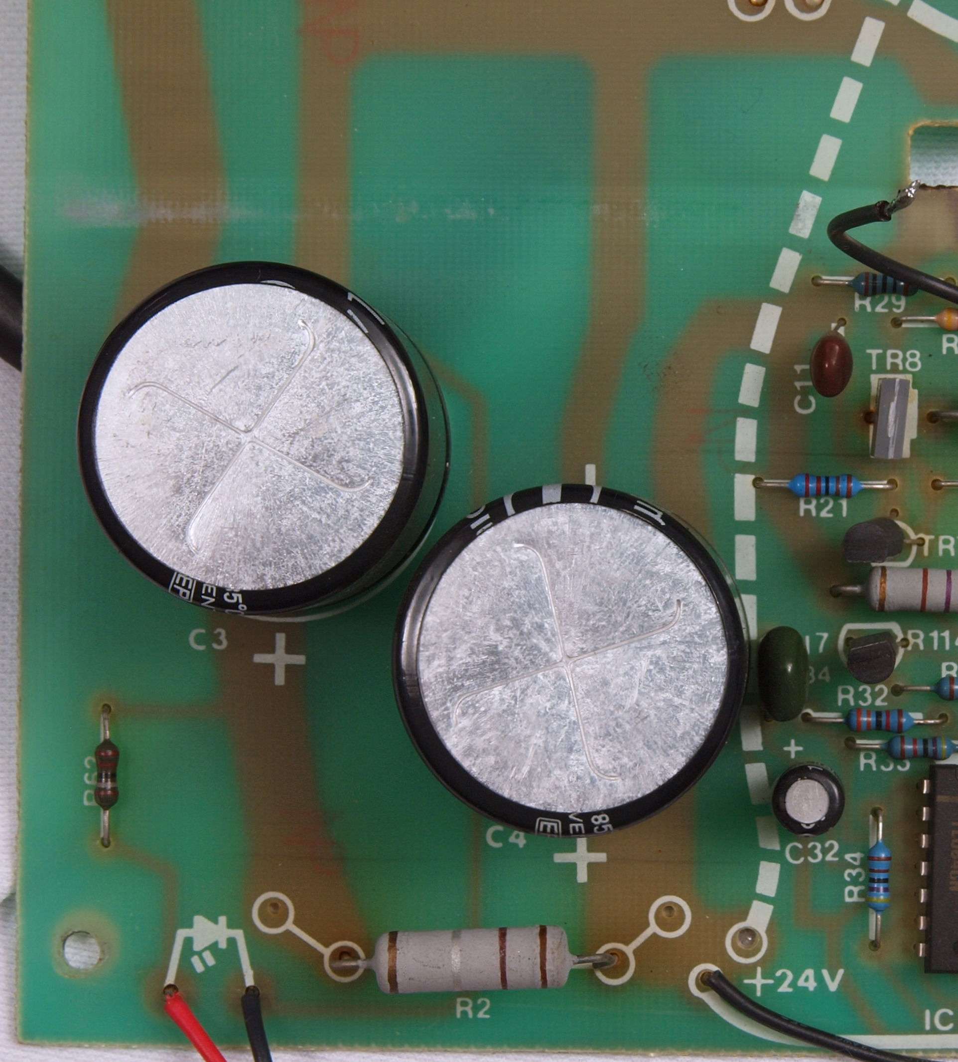 A34. 点検中、 電源電解コンデンサーの被覆が熱で剥け始めている。