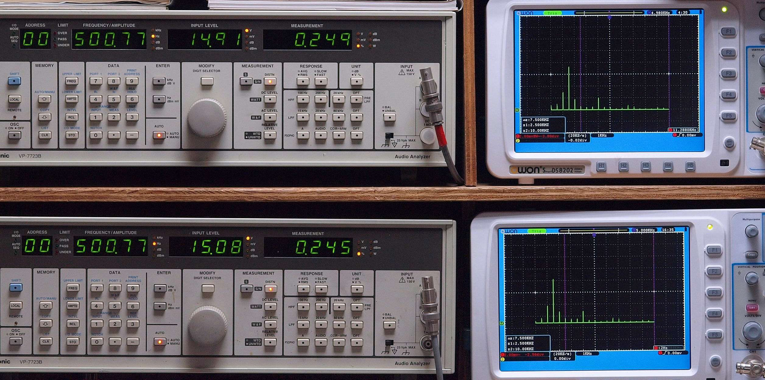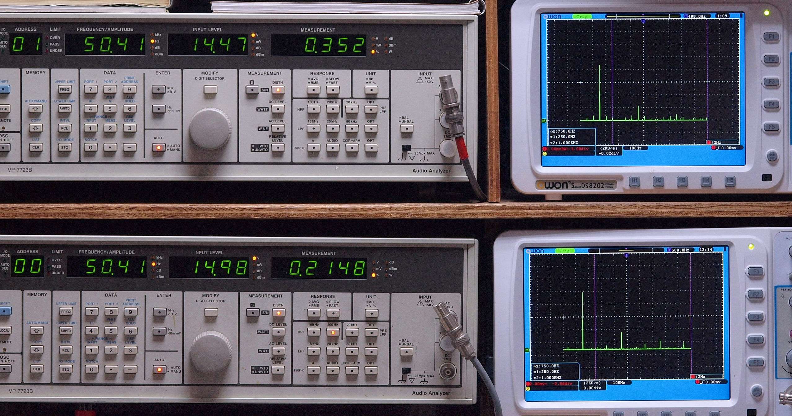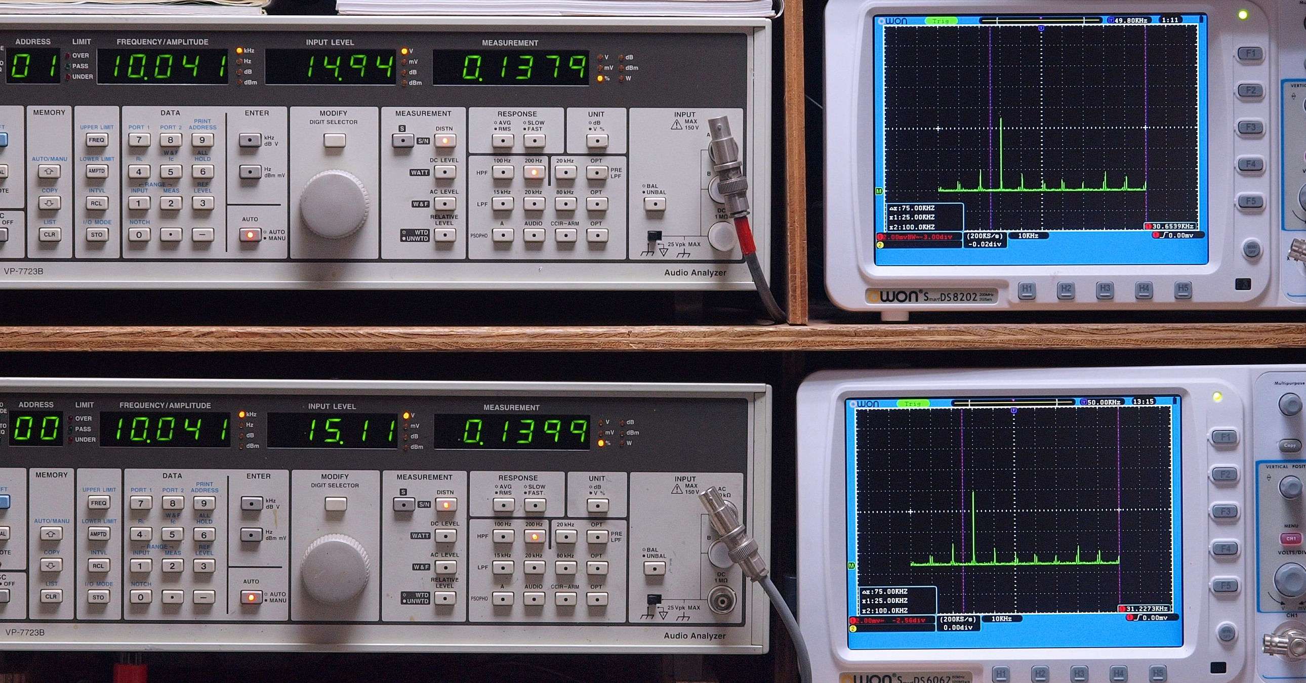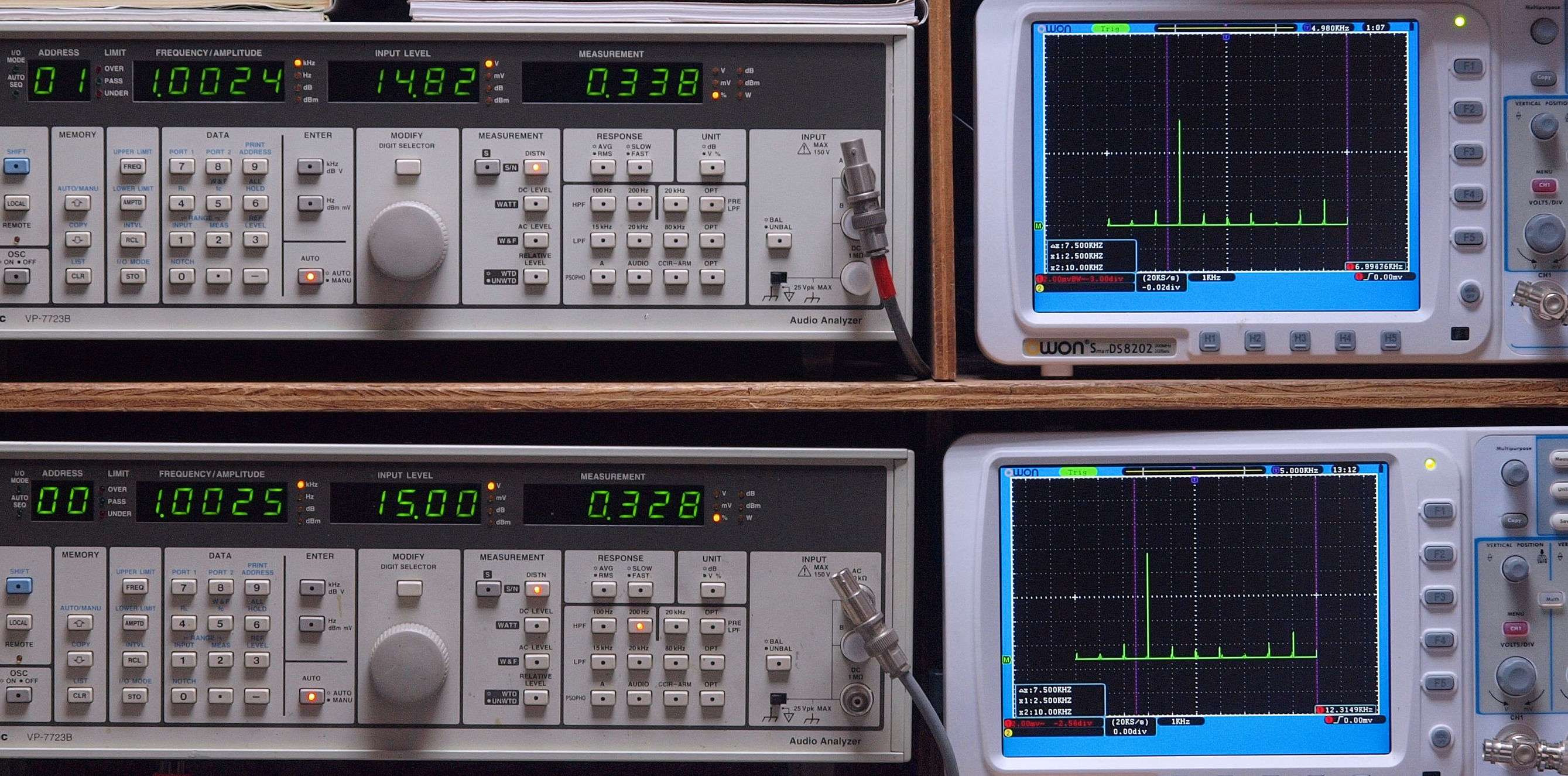 上段右端 VP−7723Bの基本波除去出力を「owon SDS8202(200MHZ)」で「FFT分析」表示。