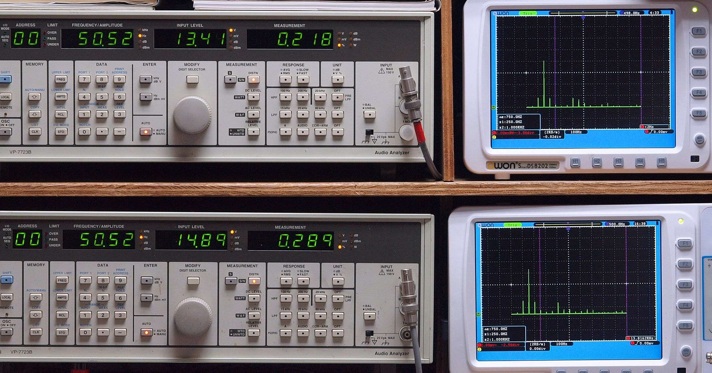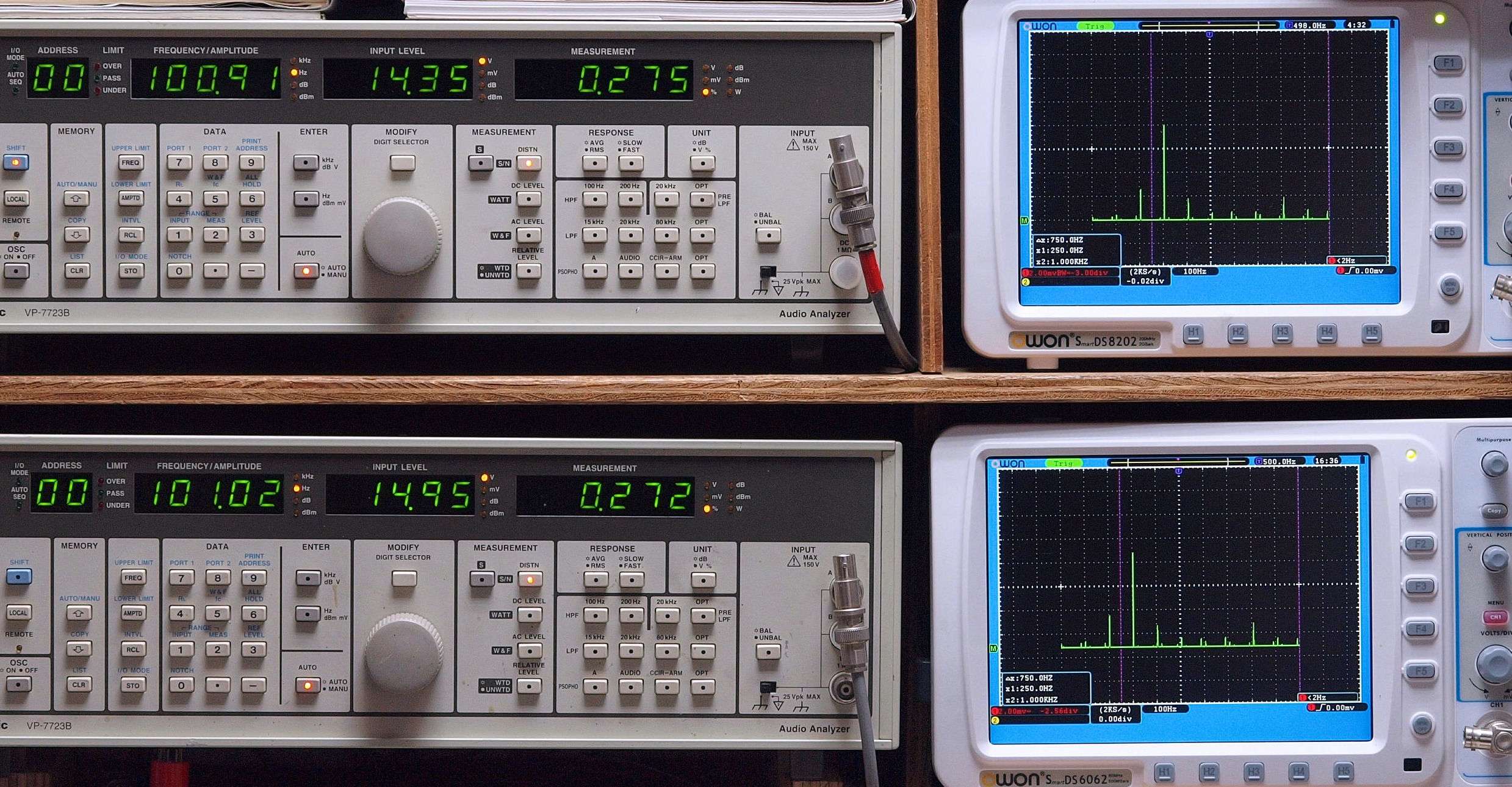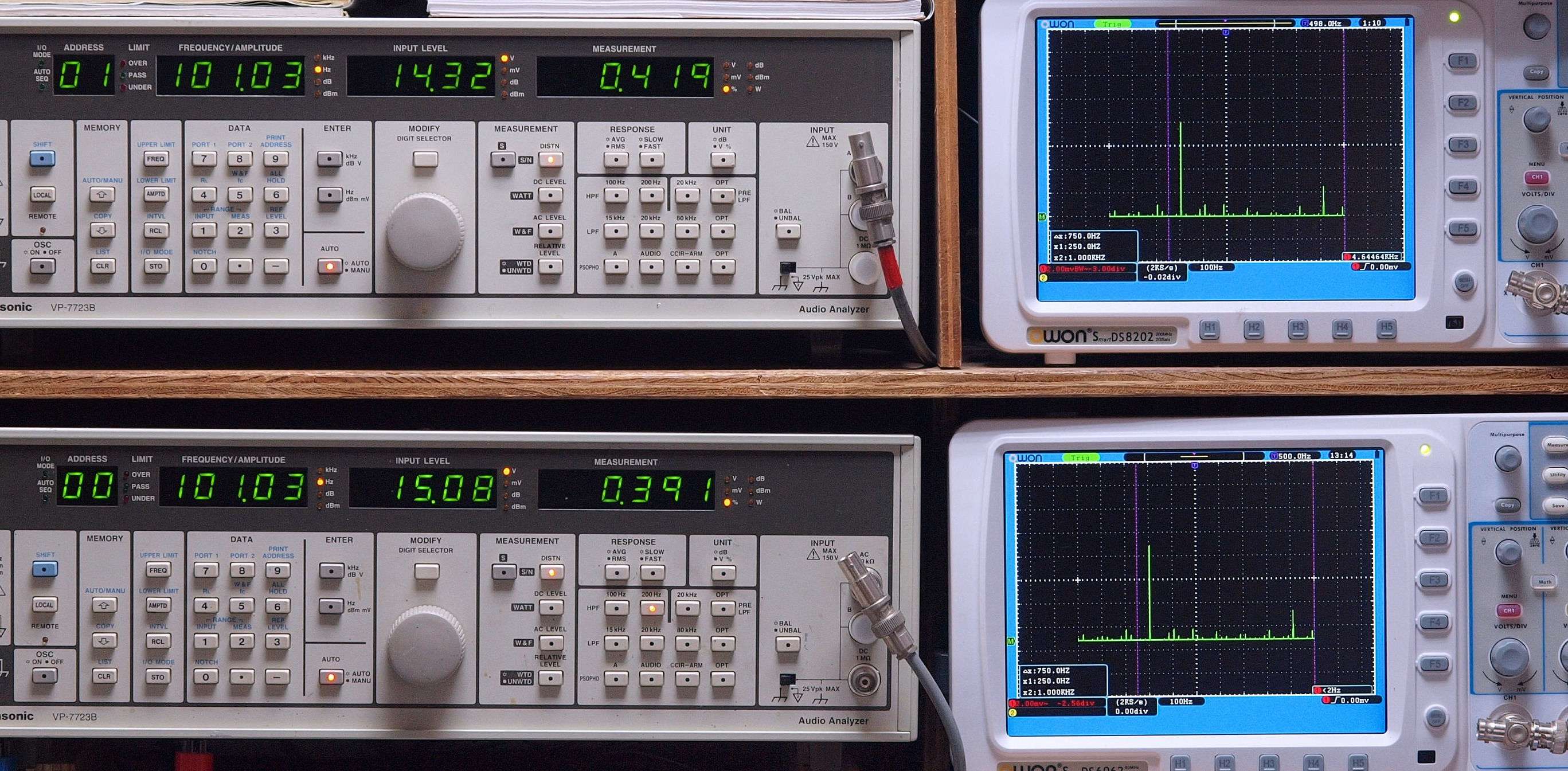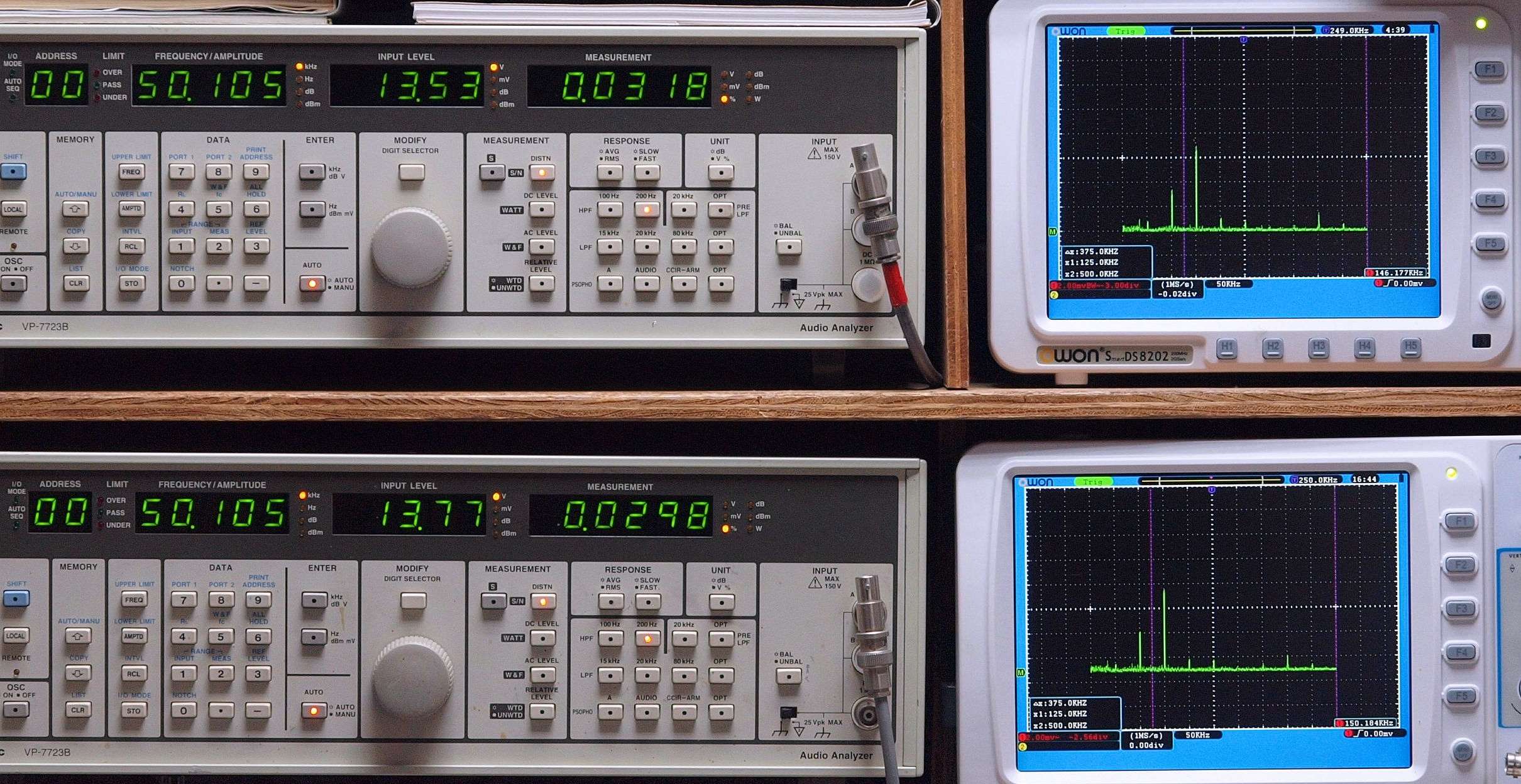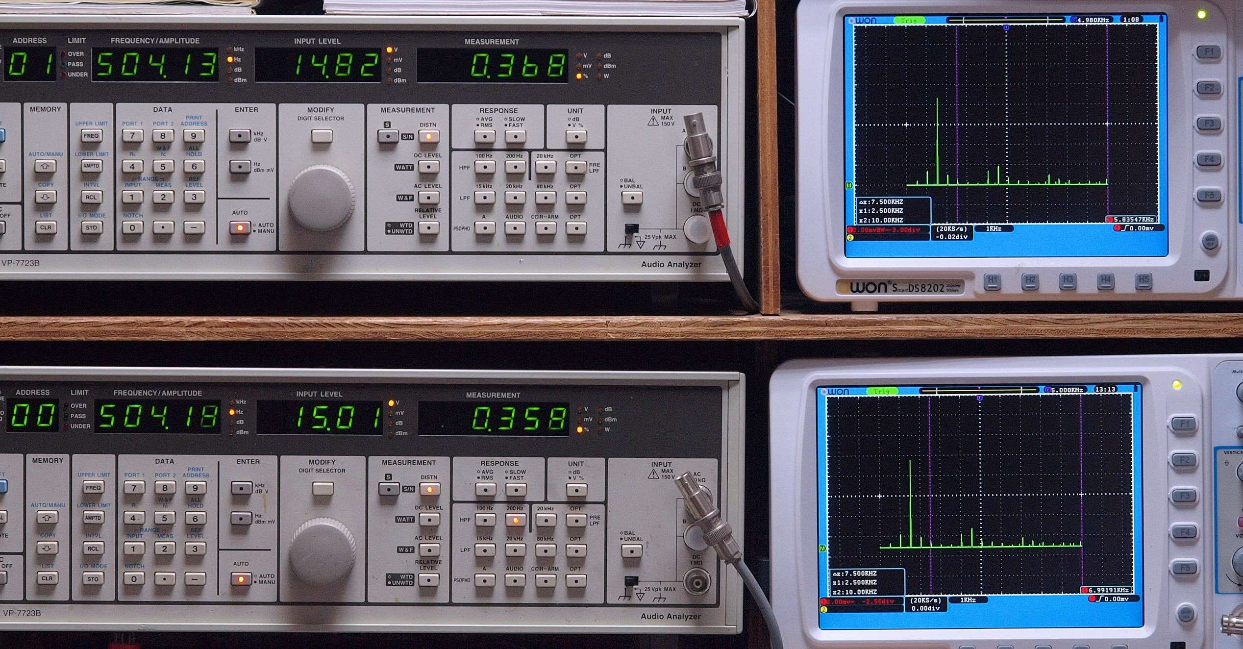 上段右端 VP−7723Bの基本波除去出力を「owon SDS8202(200MHZ)」で「FFT分析」表示。