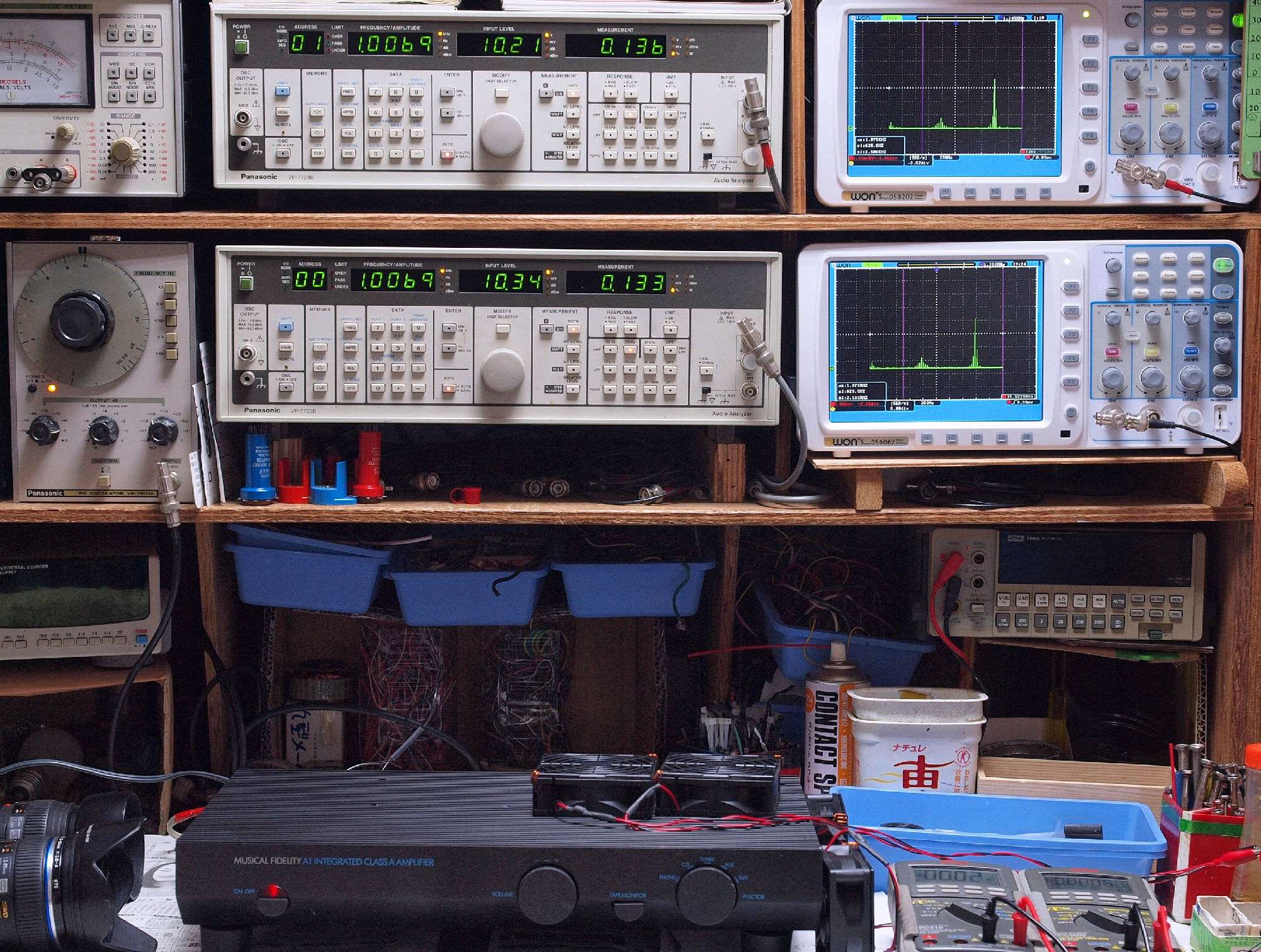 下段左端 オーディオ発振器 VP−7201A より50Hz〜100kHzの信号を出し(歪み率=約0.003%)、ATT+分配器を通し、AMPに入力。