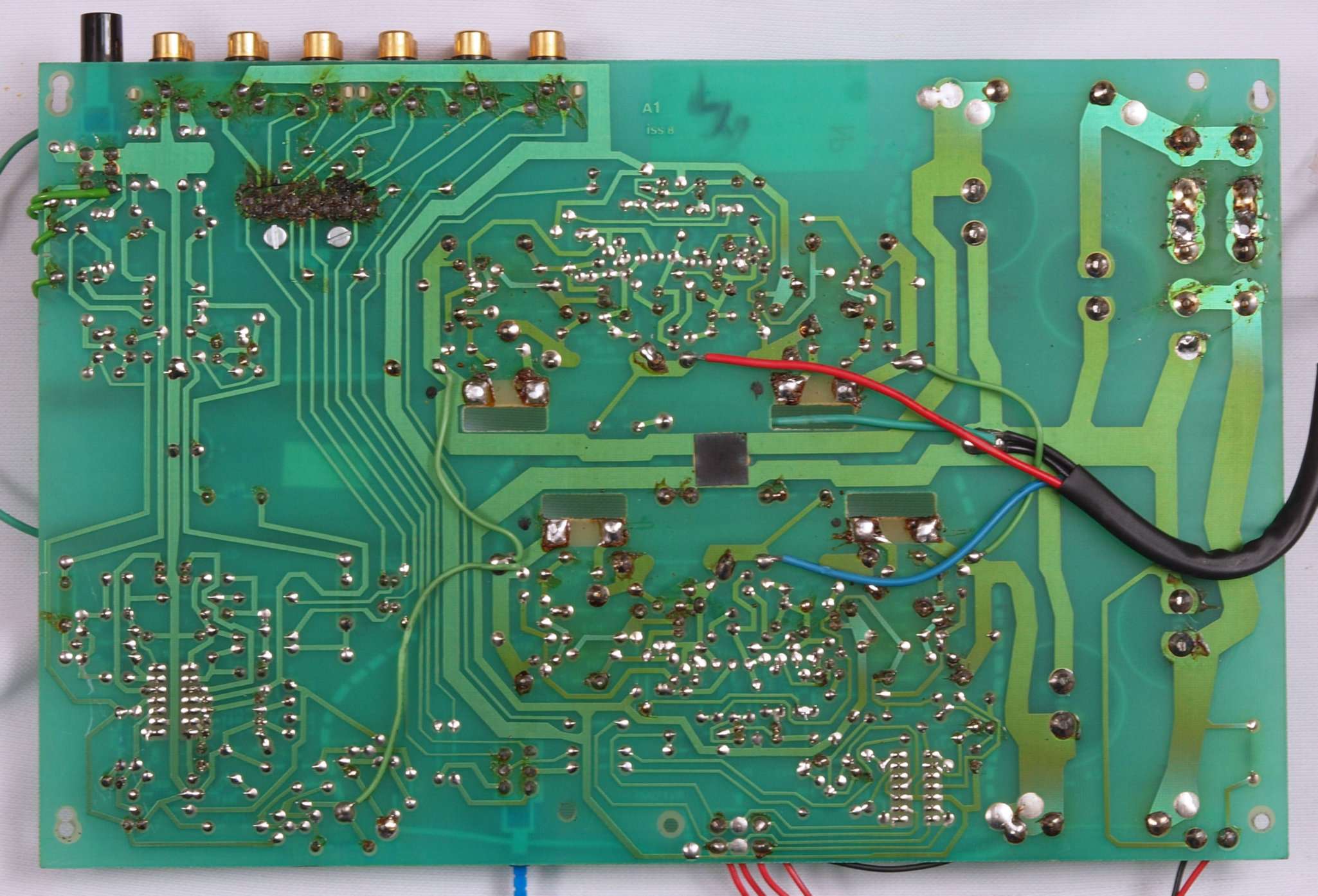 C34. 修理(半田補正)後 R側AMP基板裏、 半田を全部やり直す。