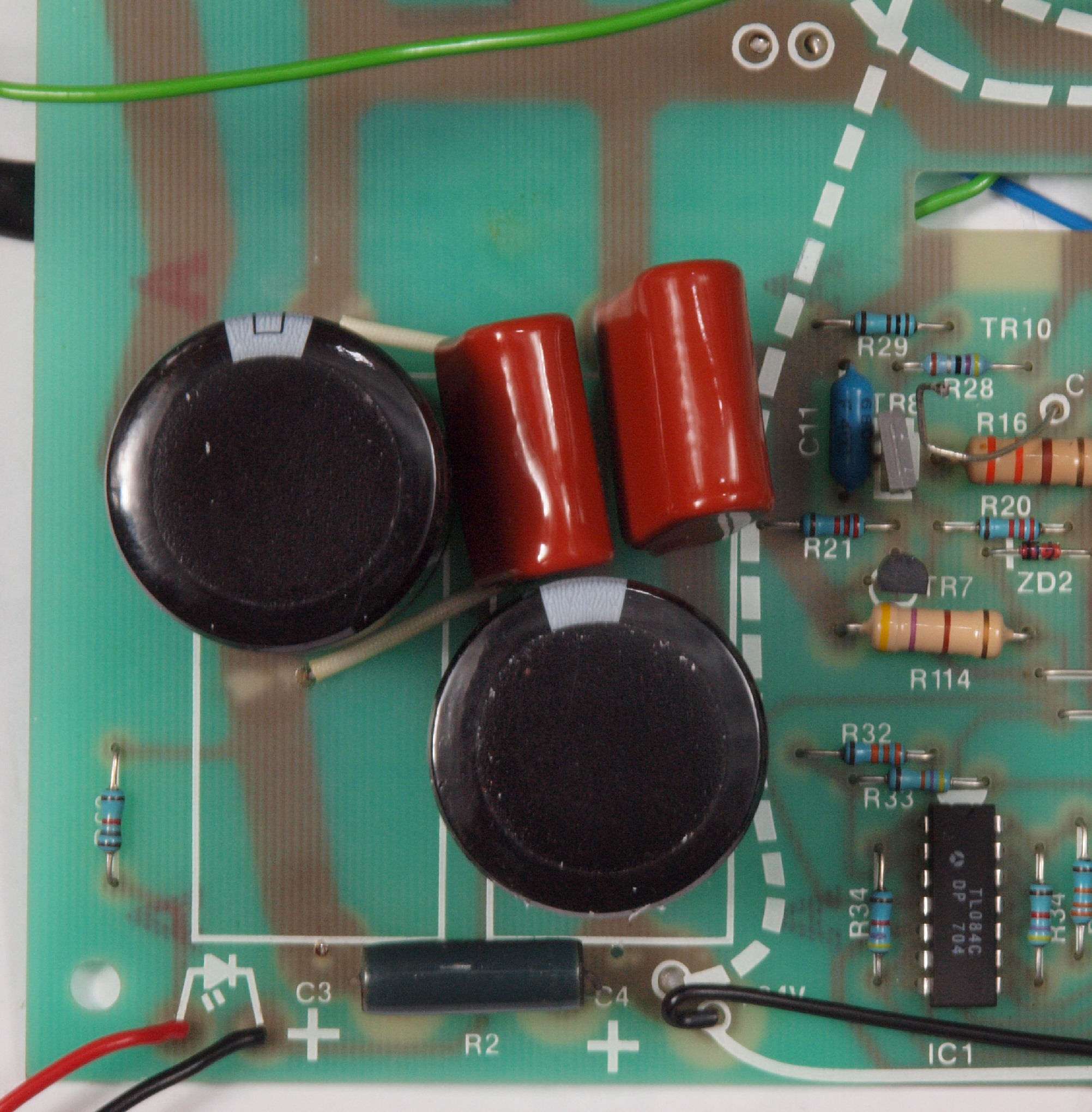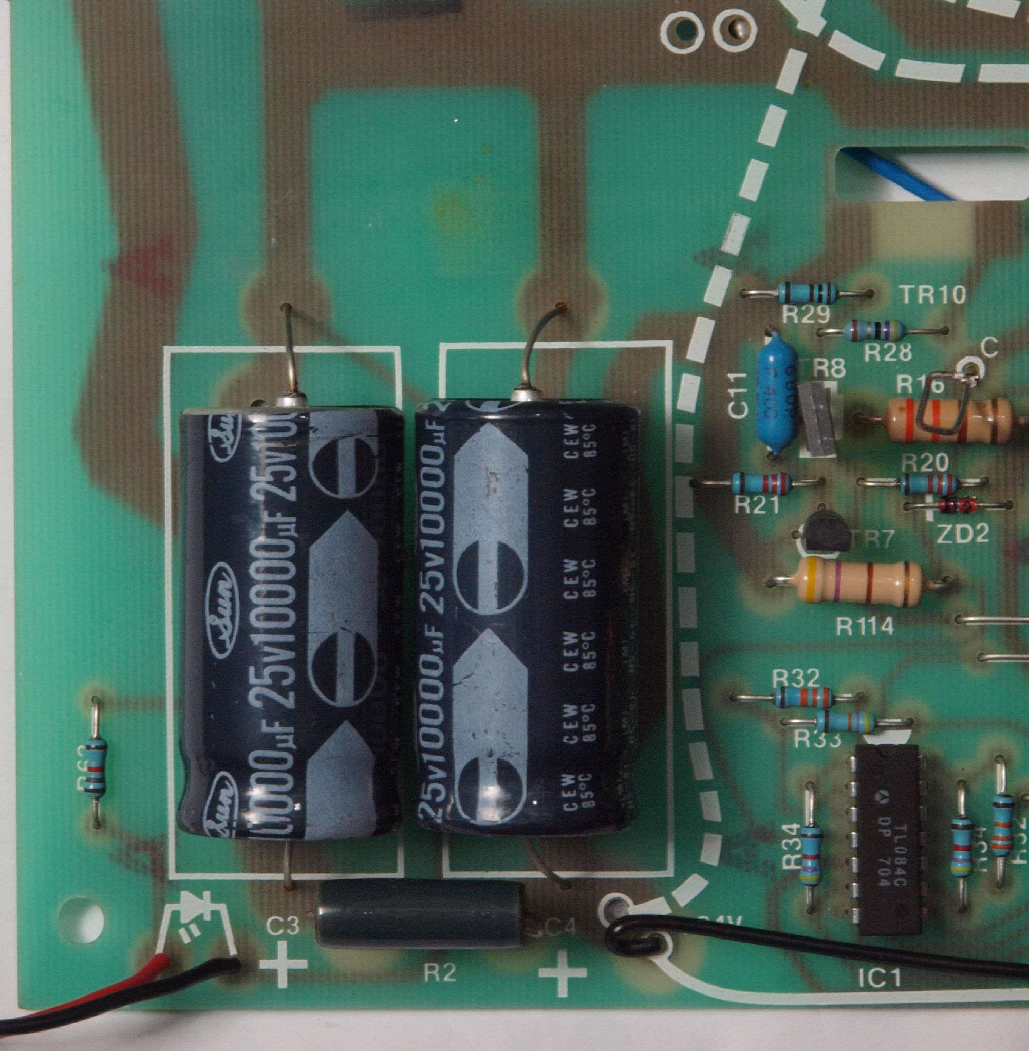 | C72. 修理後 電源基板。 電解コンデンサー4個交換、フイルムコンデンサー4個追加。 | ||||||||||||||||||||