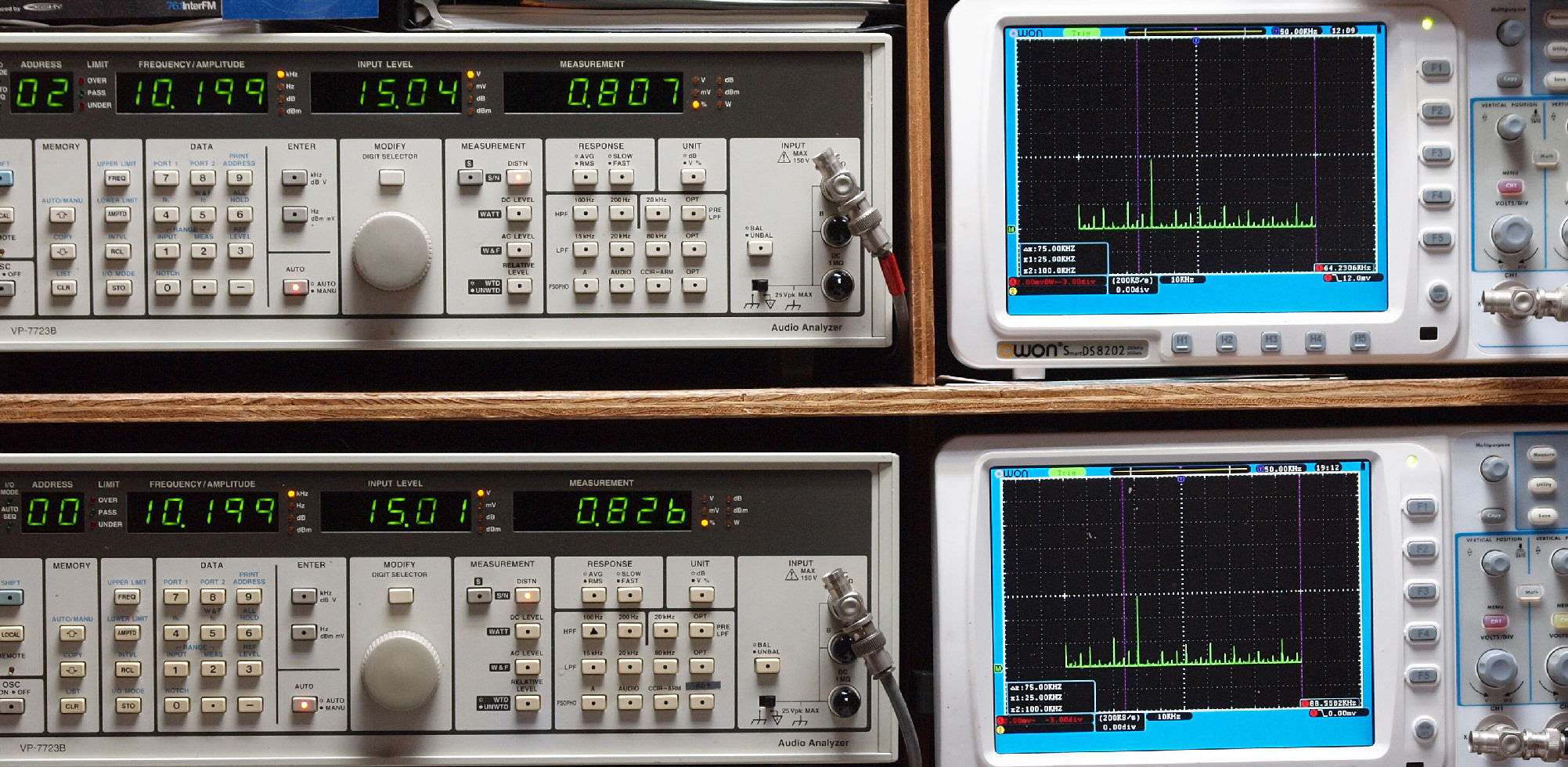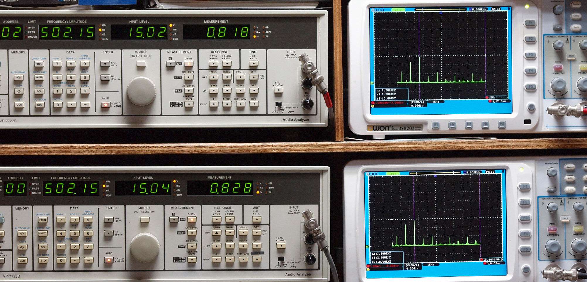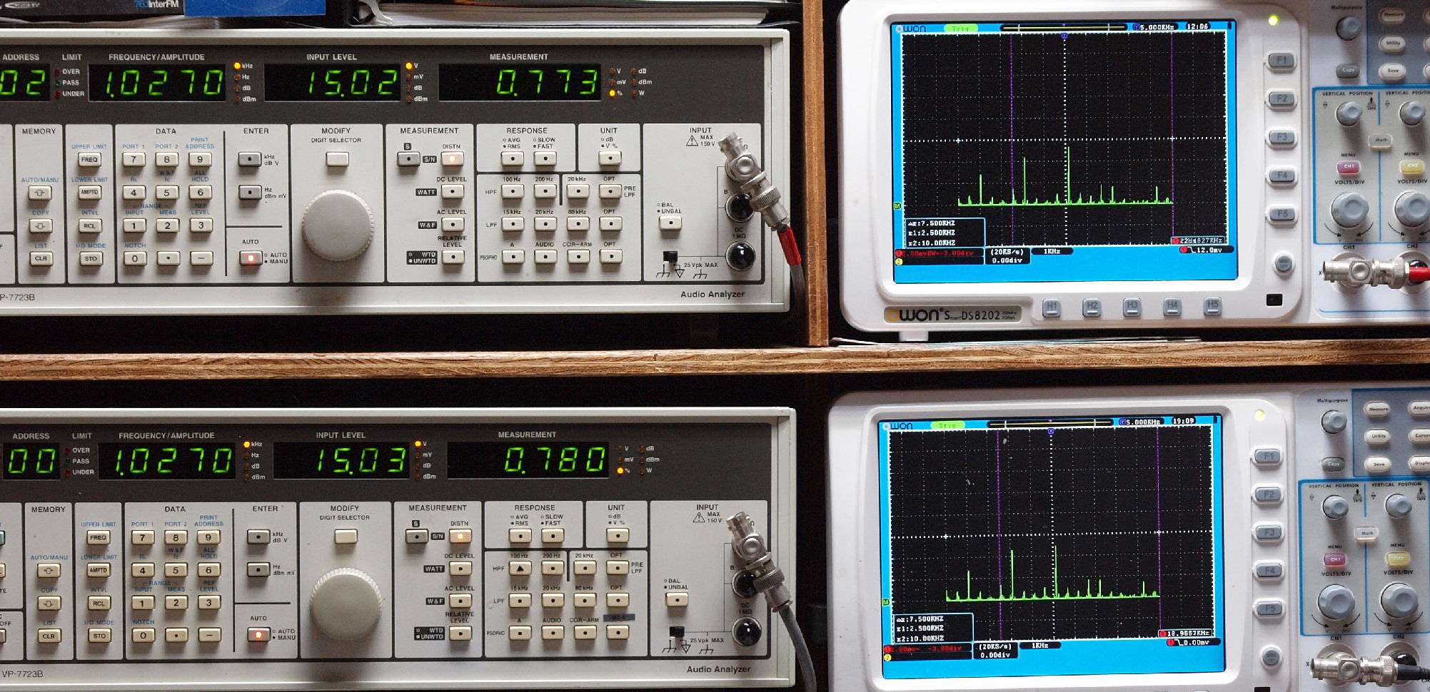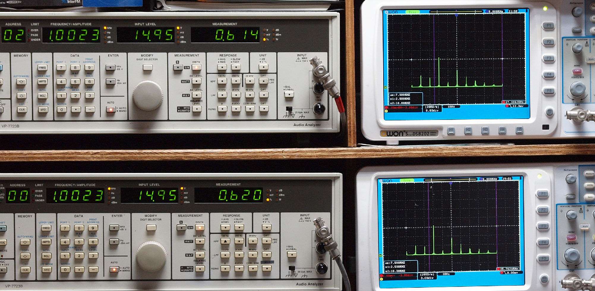 | E. 測定・調整 E1. 出力・歪み率測定・調整 「見方」。 上段中 右側SP出力を「Audio Analyzer Panasonic VP−7723B」により測定。 表示LED、 左端=メモリーNo、 中左=周波数測定、 中右=出力電圧測定、 右端=歪み率測定。 上段右端 VP−7723Bの基本波除去出力を「owon SDS8202(200MHZ)」で「FFT分析」表示。 下段中 左側SP出力を「Audio Analyzer Panasonic VP−7723B」により測定。 表示LED、 左端=メモリーNo、 中左=周波数測定、 中右=出力電圧測定、 右端=歪み率測定。 下段右端 VP−7723Bの基本波除去出力を「owon SDS6062(200MHZ)」で「FFT分析」表示。 下段左端 オーディオ発振器 VP−7201A より50Hz〜100kHzの信号を出し(歪み率=約0.003%)、ATT+分配器を通し、AMPに入力。 よって、ダイアル設定出力レベルより低くなります。測定機器の仕様や整備の様子はこちら、「VP−7723B」「VP−7201A」。 FFT画面の見方はこちら。 |