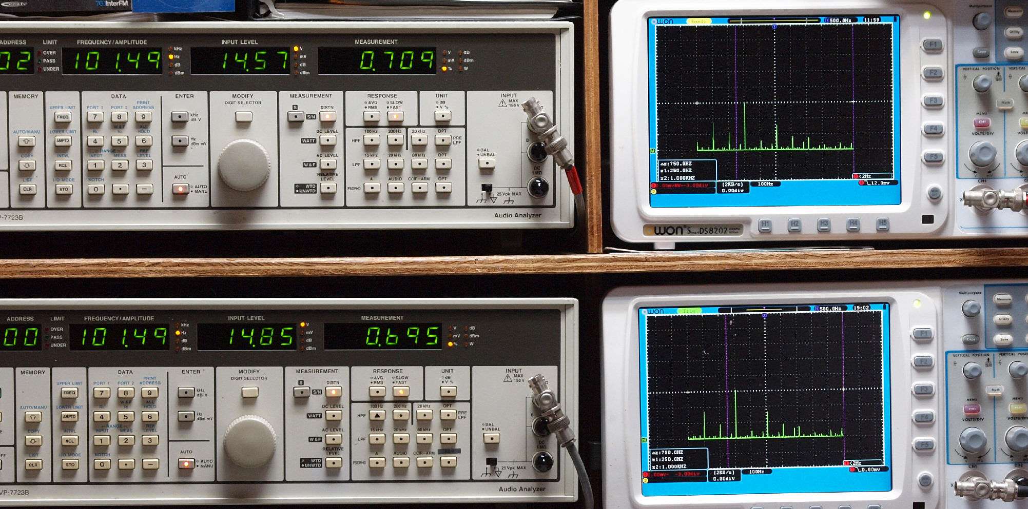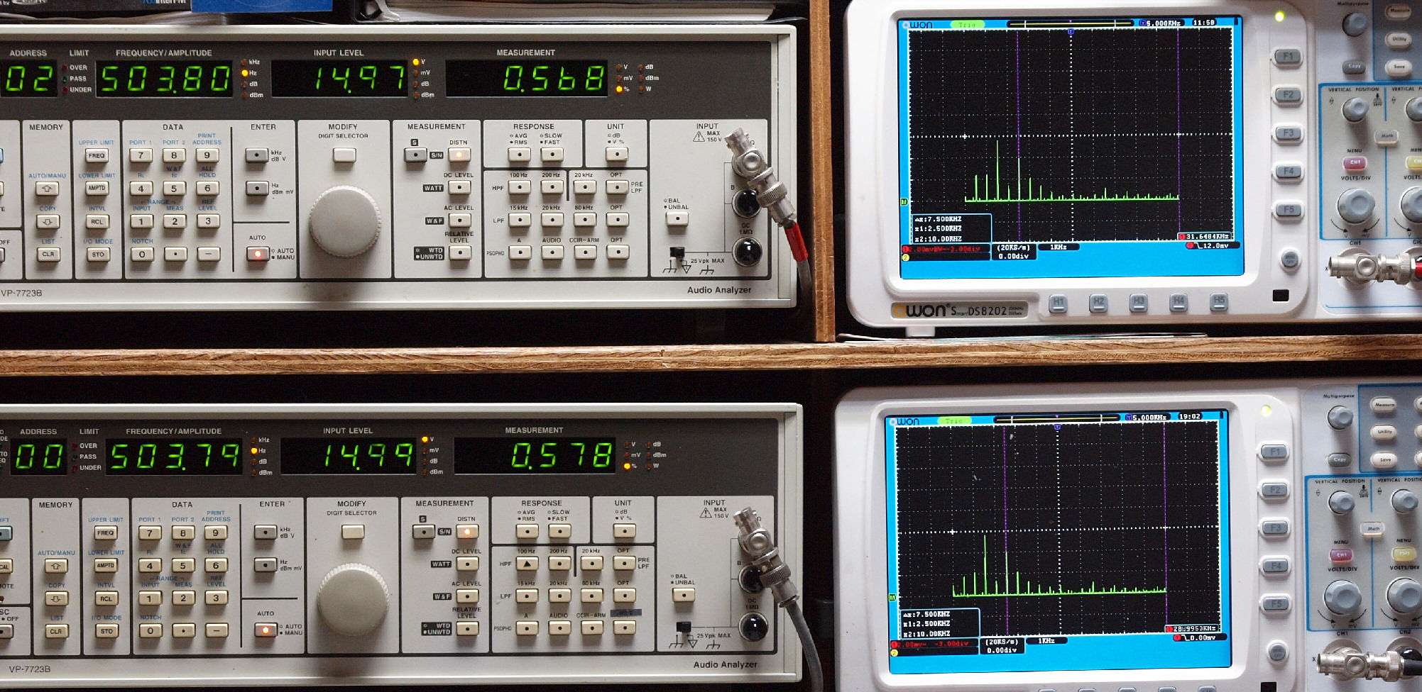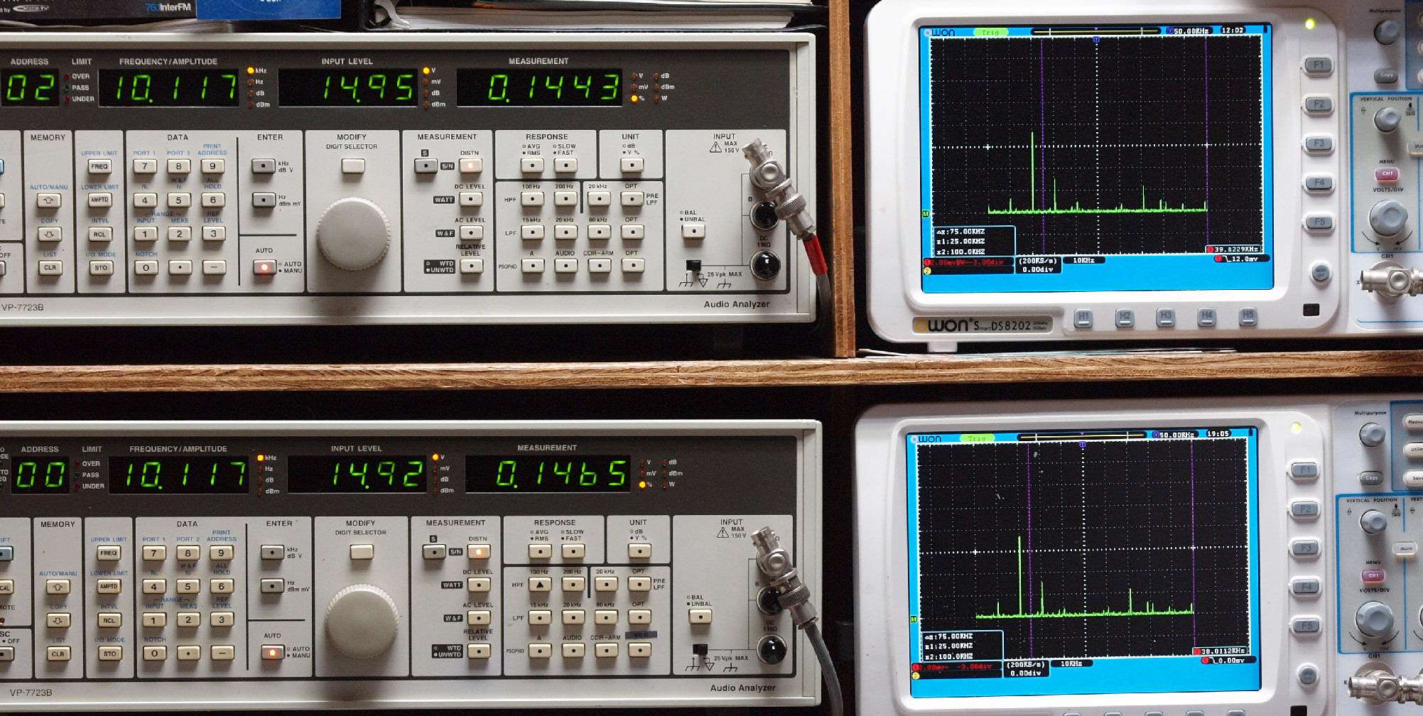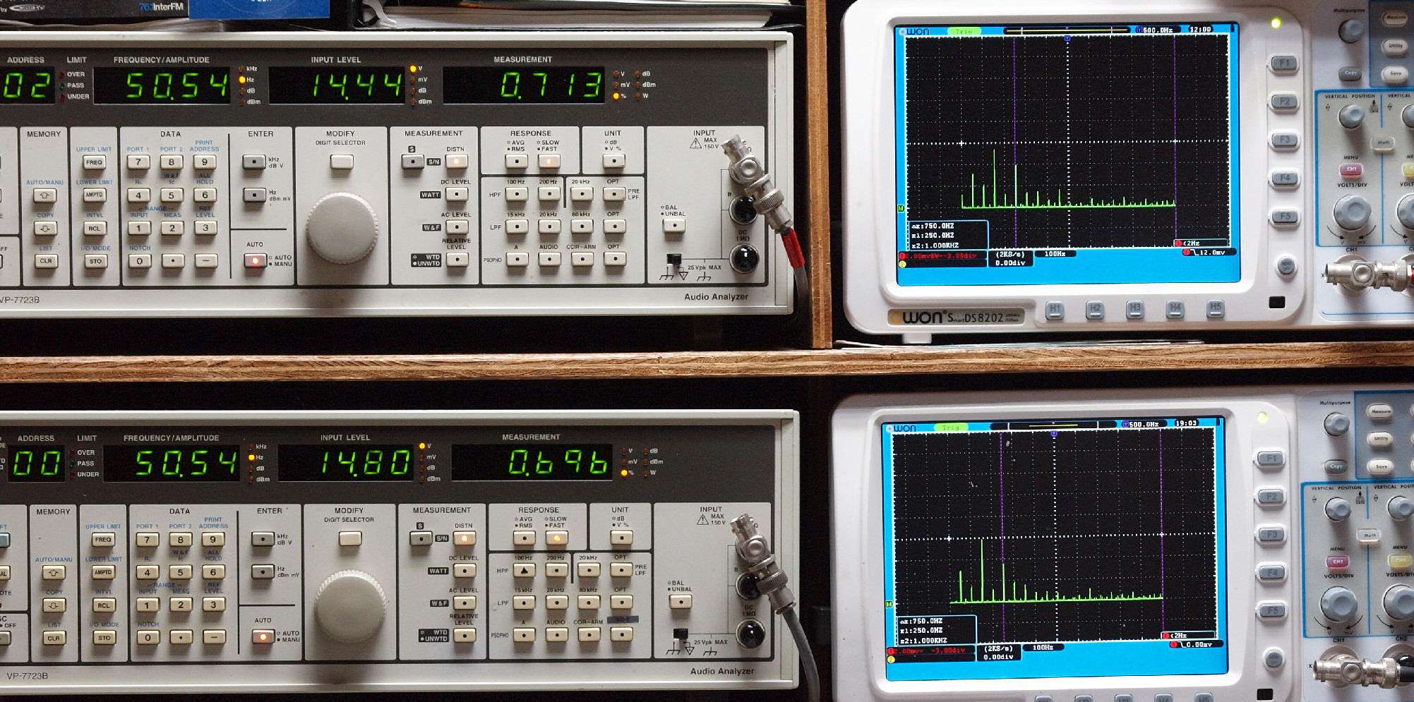 | E. 測定・調整 E1. 出力・歪み率測定・調整 「見方」。 上段中 右側SP出力を「Audio Analyzer Panasonic VP−7723B」により測定。 表示LED、 左端=メモリーNo、 中左=周波数測定、 中右=出力電圧測定、 右端=歪み率測定。 上段右端 VP−7723Bの基本波除去出力を「owon SDS8202(200MHZ)」で「FFT分析」表示。 下段中 左側SP出力を「Audio Analyzer Panasonic VP−7723B」により測定。 表示LED、 左端=メモリーNo、 中左=周波数測定、 中右=出力電圧測定、 右端=歪み率測定。 下段右端 VP−7723Bの基本波除去出力を「owon SDS6062(200MHZ)」で「FFT分析」表示。 下段左端 オーディオ発振器 VP−7201A より50Hz〜100kHzの信号を出し(歪み率=約0.003%)、ATT+分配器を通し、AMPに入力。 よって、ダイアル設定出力レベルより低くなります。測定機器の仕様や整備の様子はこちら、「VP−7723B」「VP−7201A」。 FFT画面の見方はこちら。 |