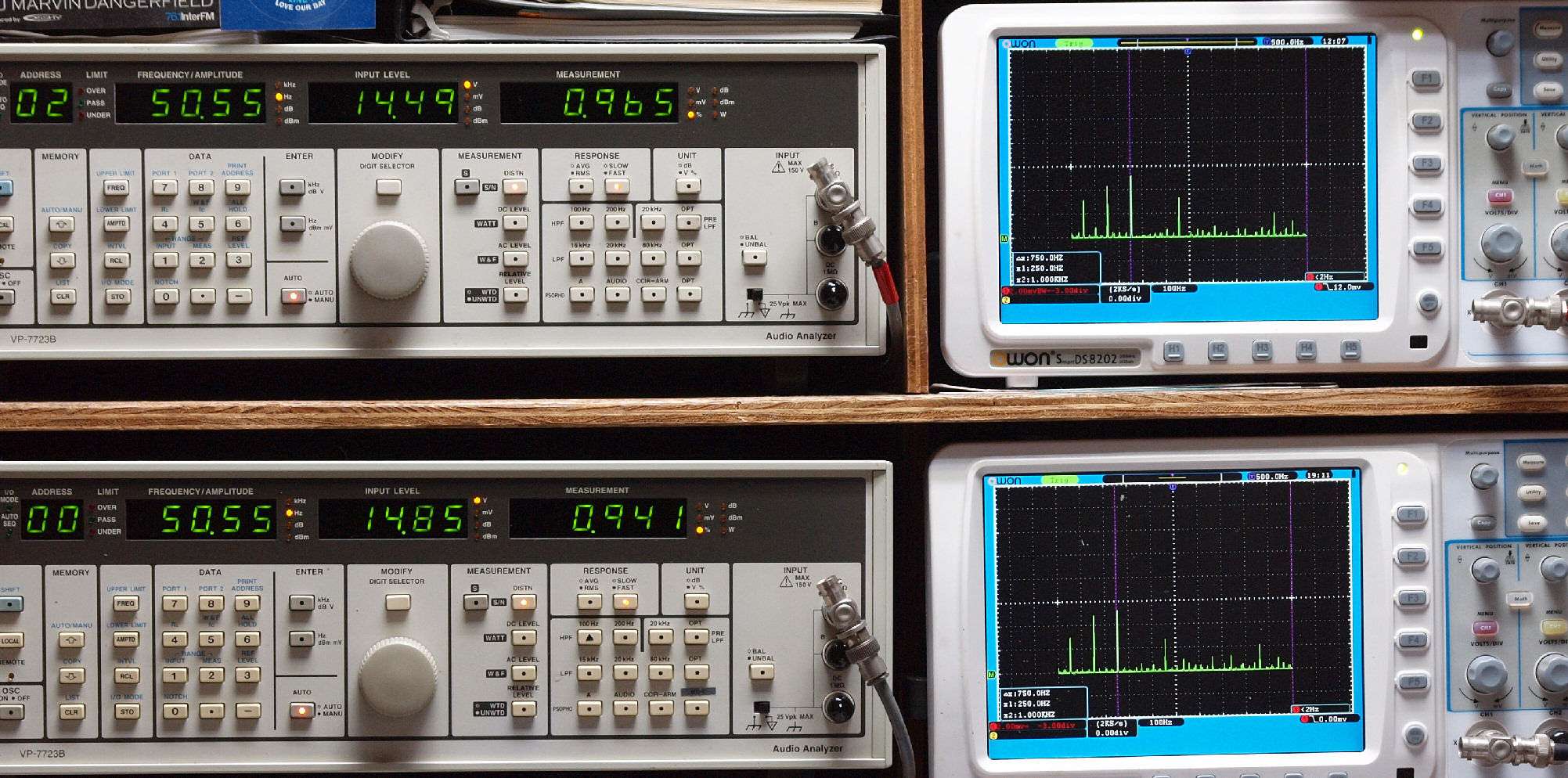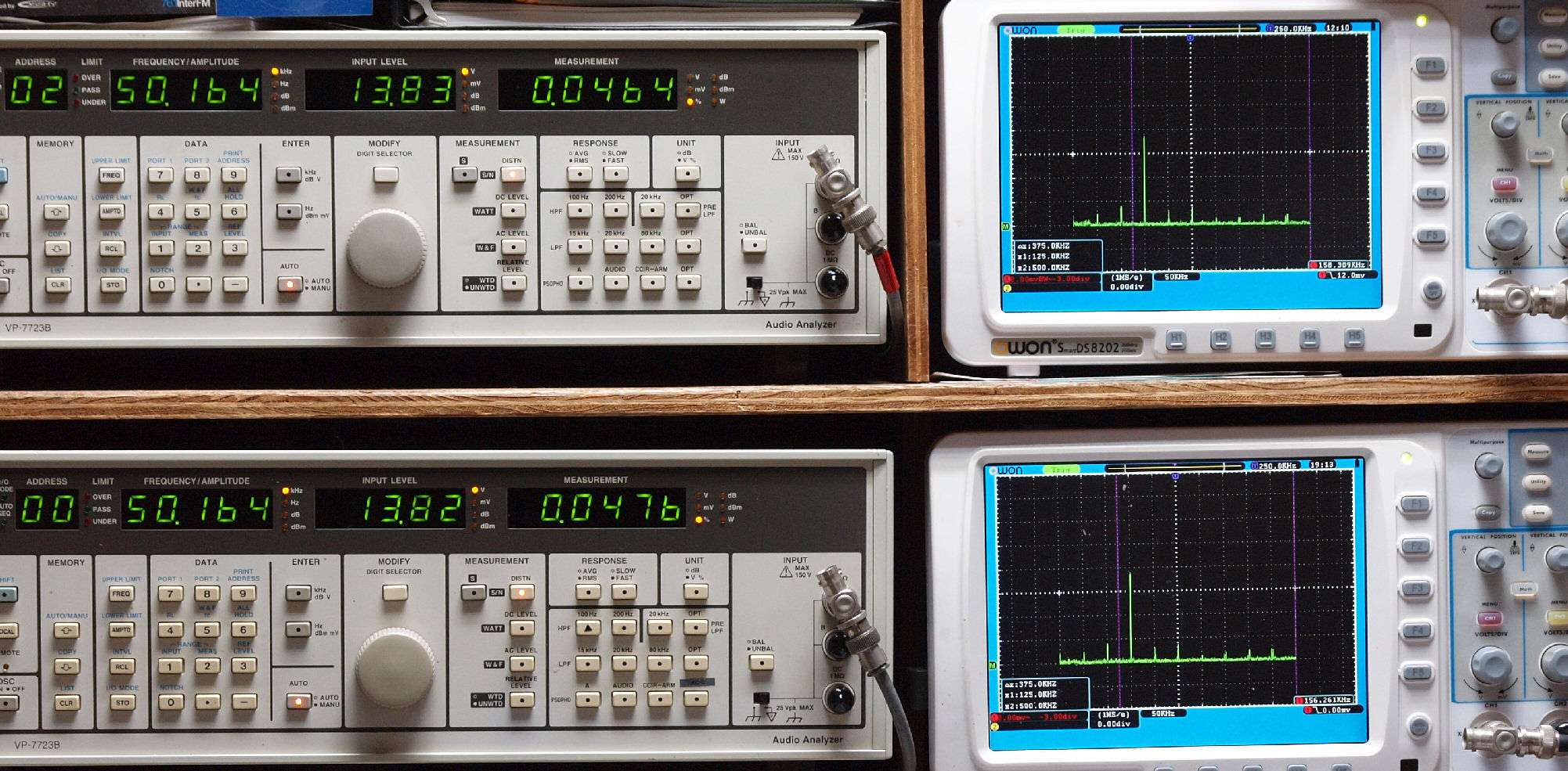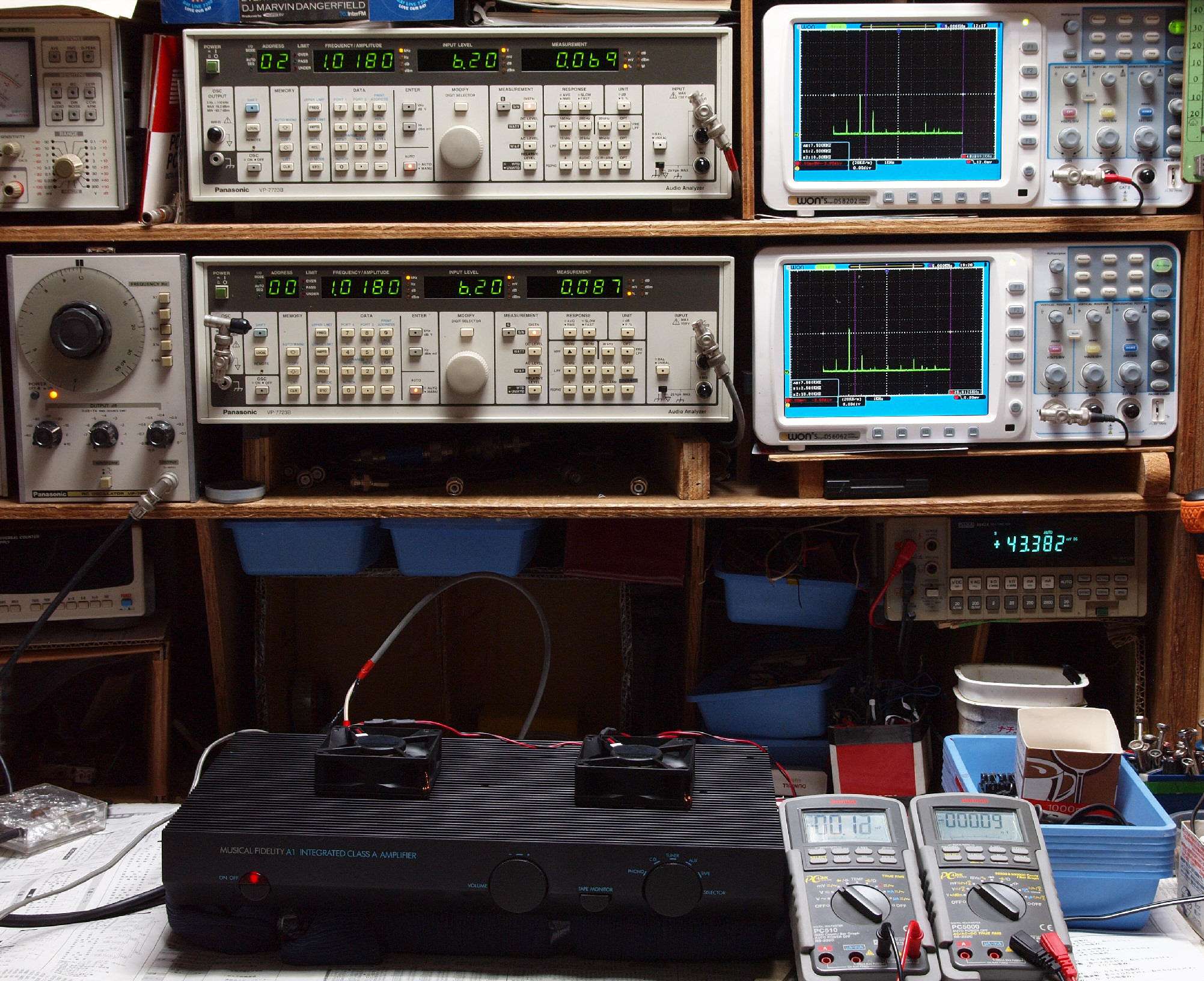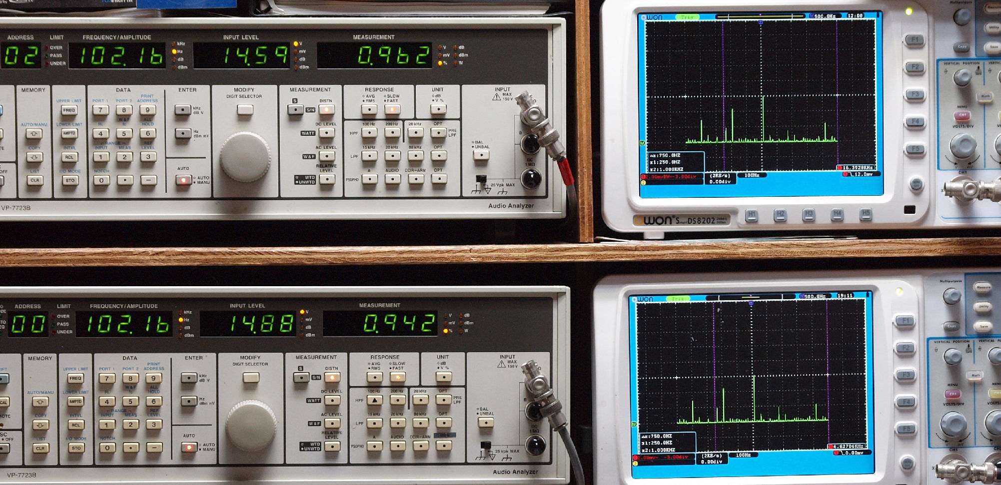| E. 測定・調整 E1. 出力・歪み率測定・調整 「見方」。 上段中 右側SP出力を「Audio Analyzer Panasonic VP−7723B」により測定。 表示LED、 左端=メモリーNo、 中左=周波数測定、 中右=出力電圧測定、 右端=歪み率測定。 上段右端 VP−7723Bの基本波除去出力を「owon SDS8202(200MHZ)」で「FFT分析」表示。 下段中 左側SP出力を「Audio Analyzer Panasonic VP−7723B」により測定。 表示LED、 左端=メモリーNo、 中左=周波数測定、 中右=出力電圧測定、 右端=歪み率測定。 下段右端 VP−7723Bの基本波除去出力を「owon SDS6062(200MHZ)」で「FFT分析」表示。 下段左端 オーディオ発振器 VP−7201A より50Hz〜100kHzの信号を出し(歪み率=約0.003%)、ATT+分配器を通し、AMPに入力。 よって、ダイアル設定出力レベルより低くなります。測定機器の仕様や整備の様子はこちら、「VP−7723B」「VP−7201A」。 FFT画面の見方はこちら。 |