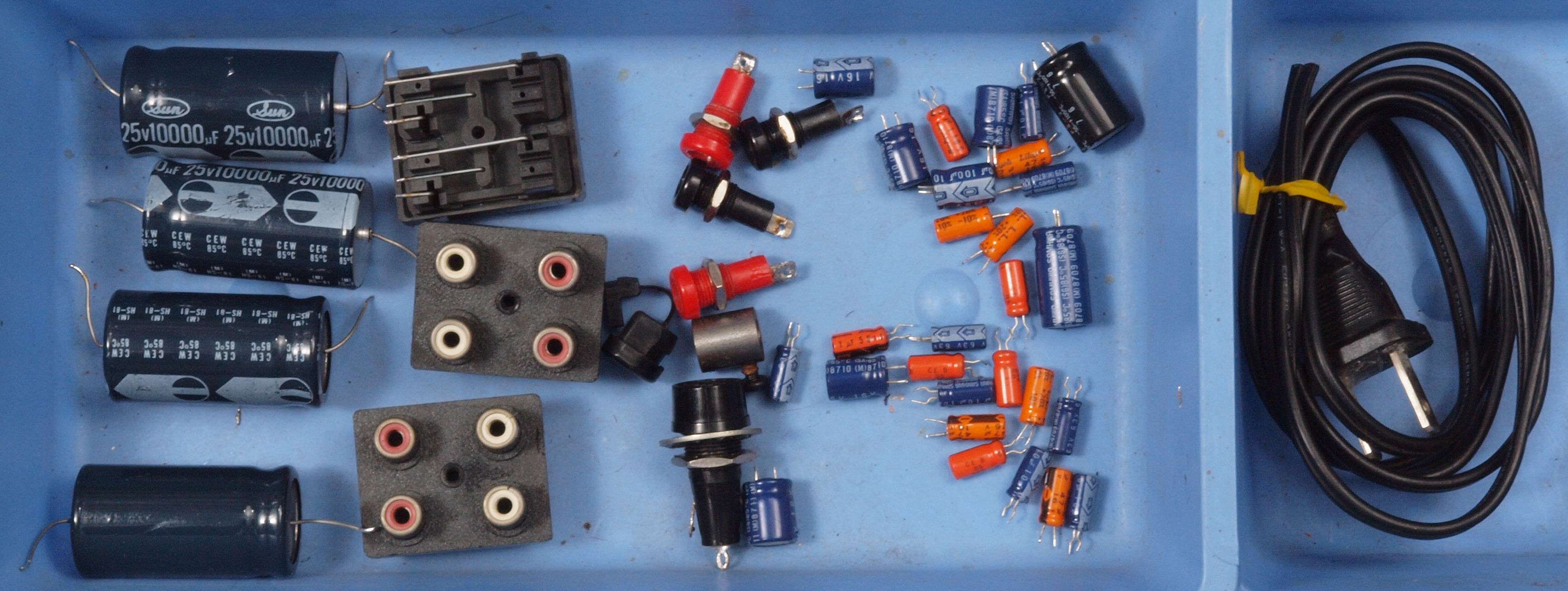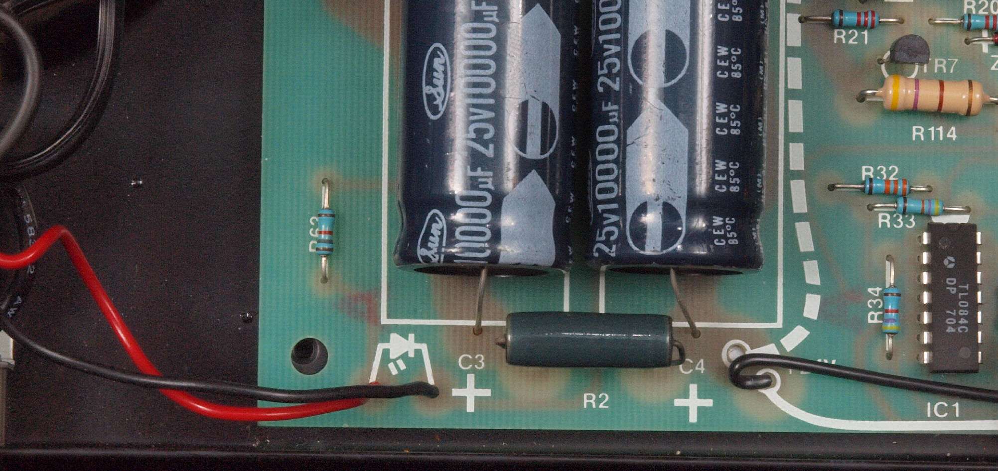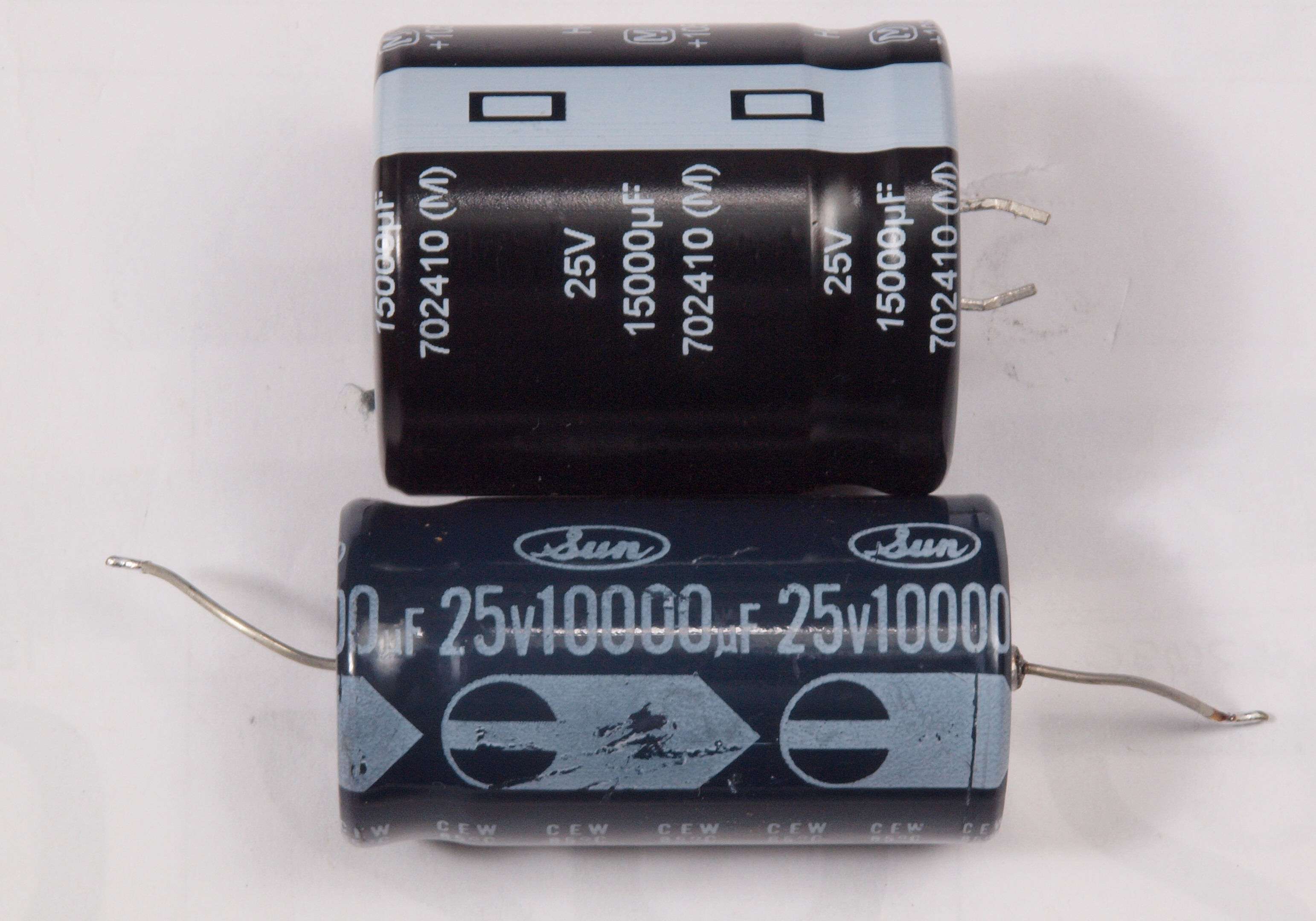 | CD2. 交換部品。 電源ブロック電解コンデンサー、 上=交換する15000μ/25V、下=付いていた物10000μ/25V。 | ||||||||||||||||||||