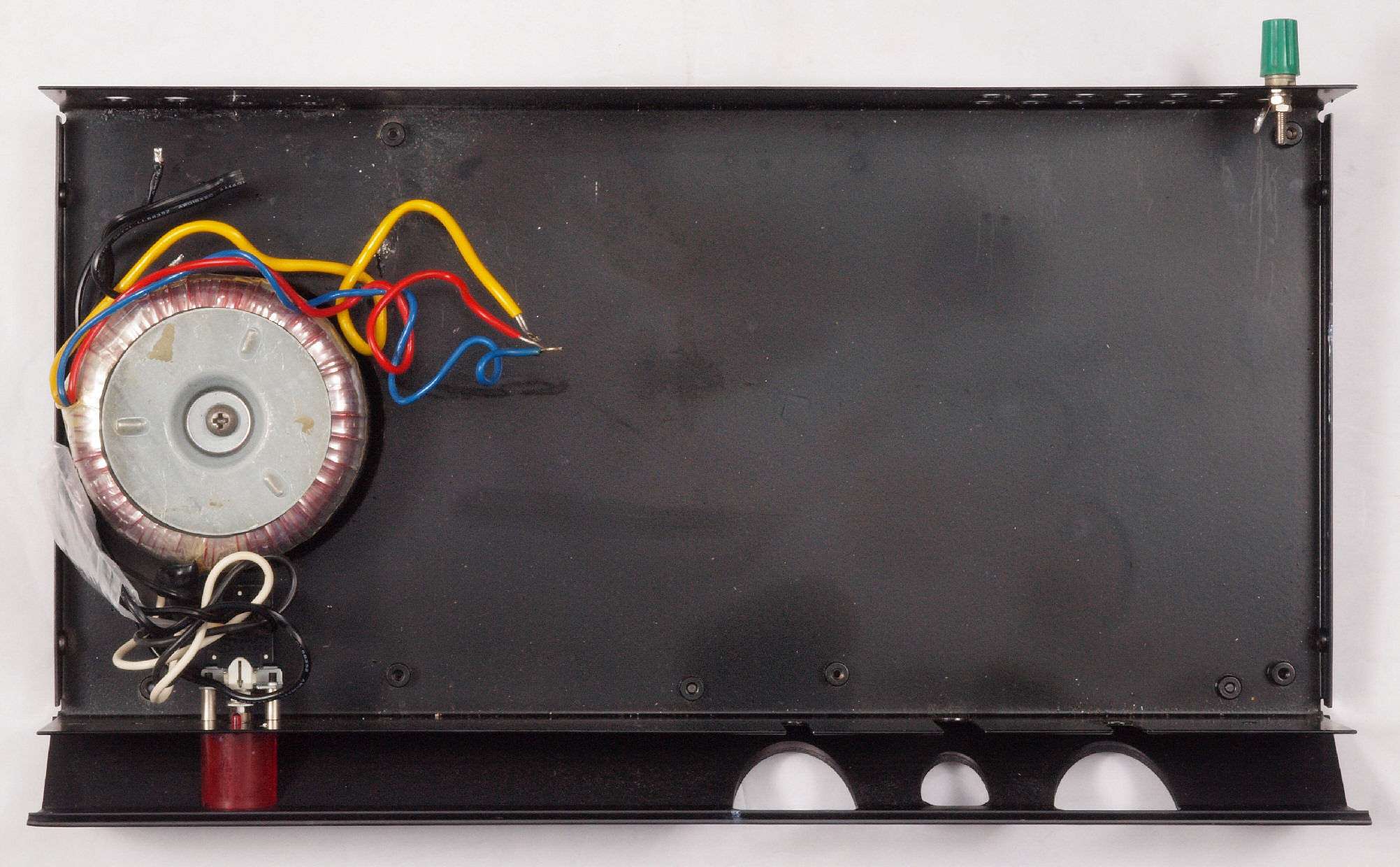| C.修理状況 C10. 修理中 基板等を取り外したシャーシ。 後パネル加工があるので、トランスや電源SWも外す。 |