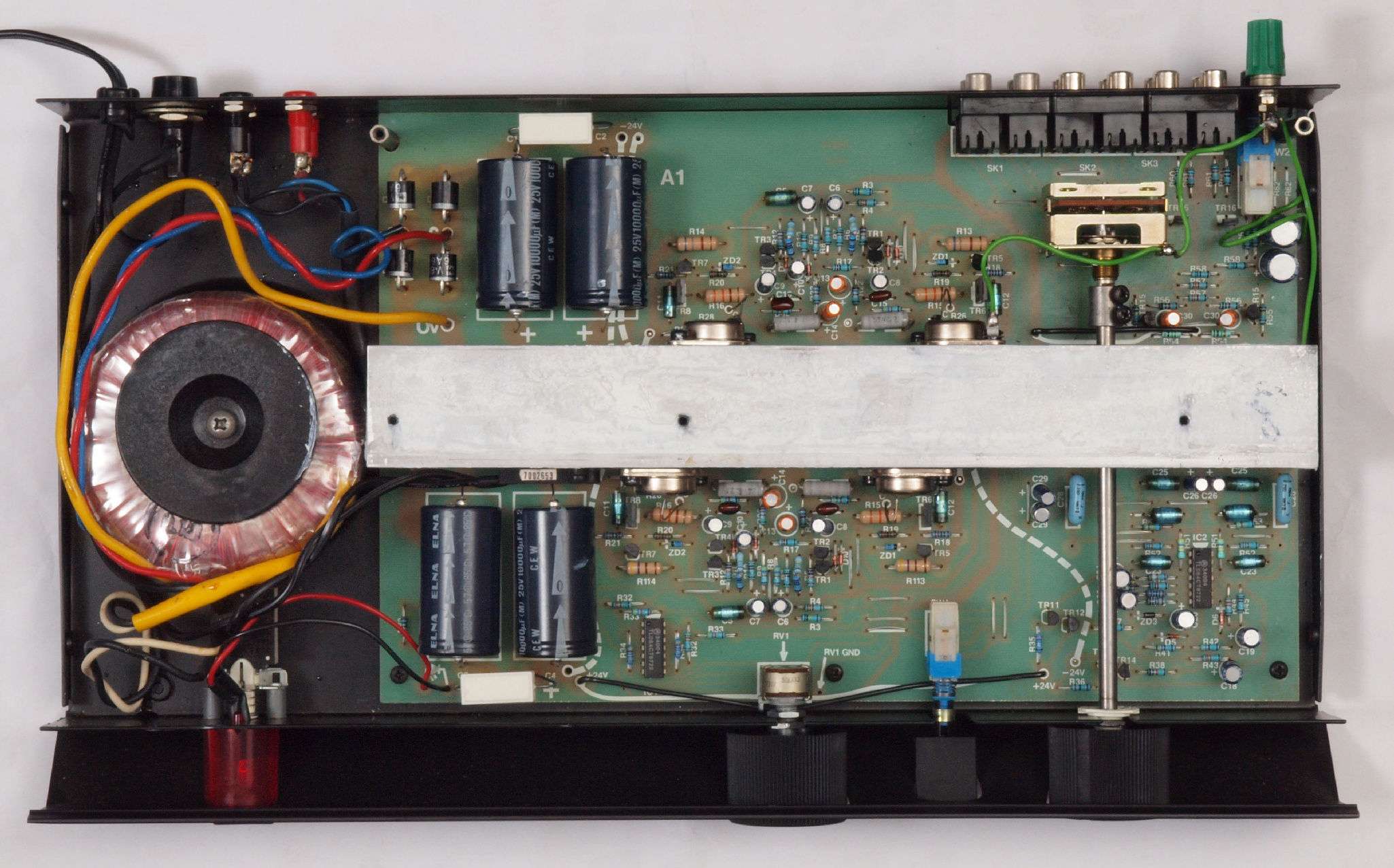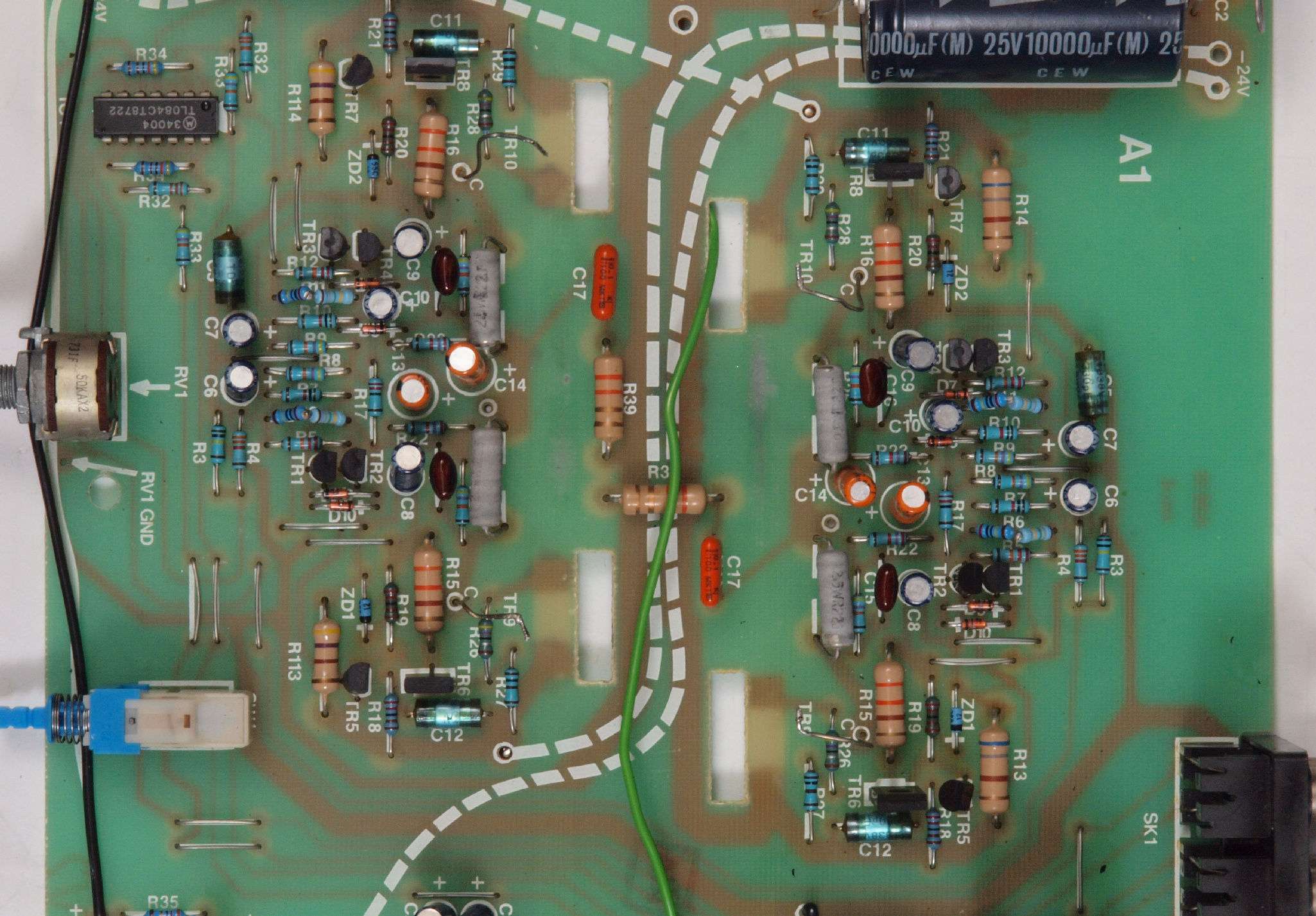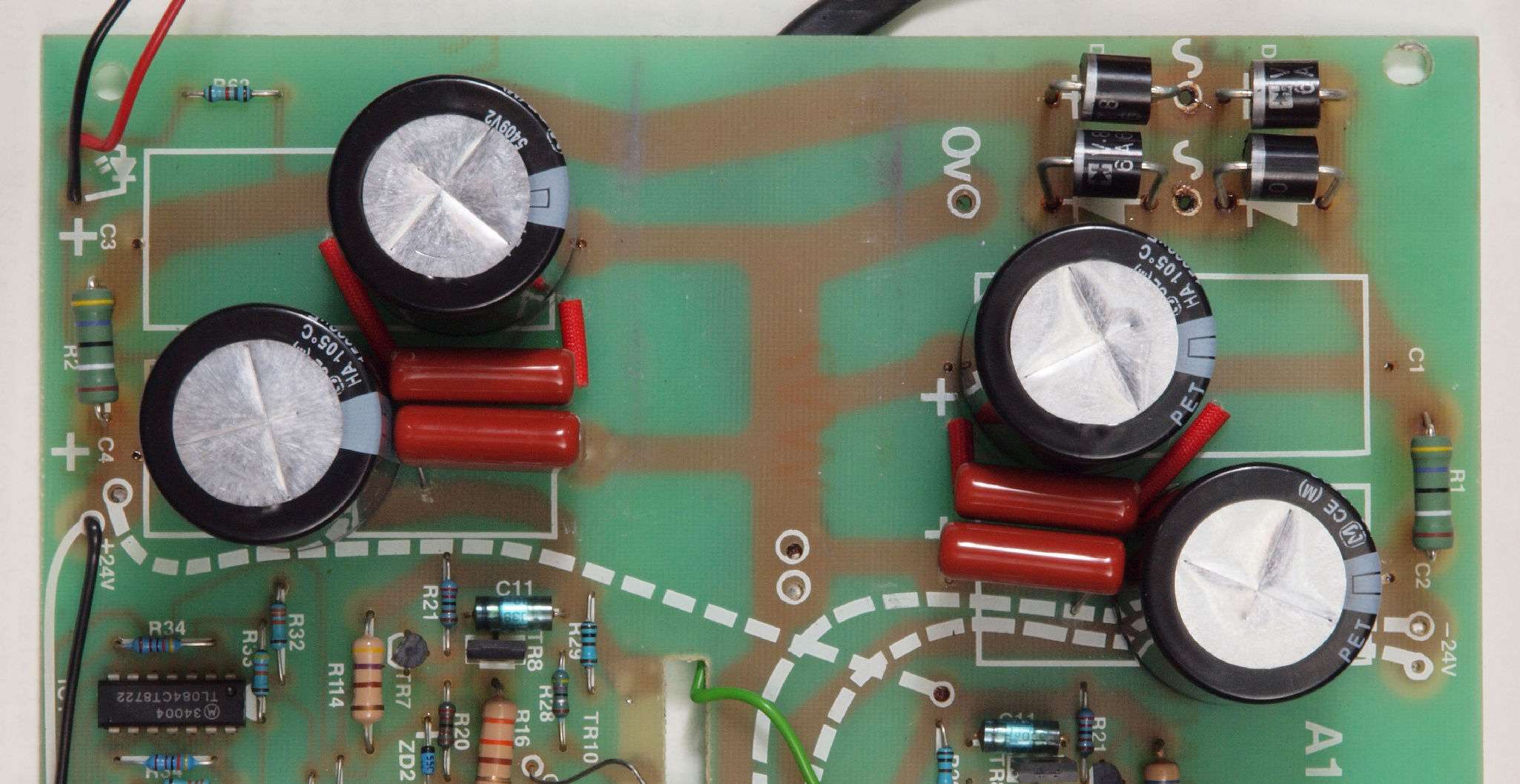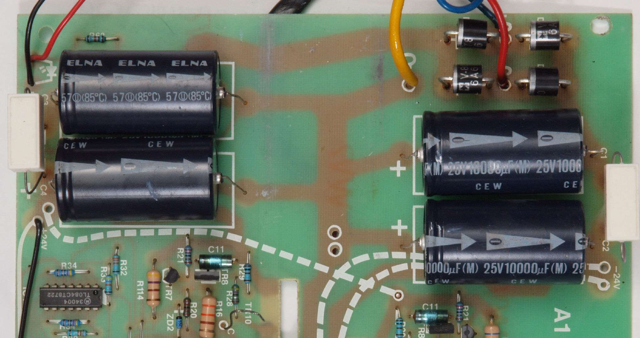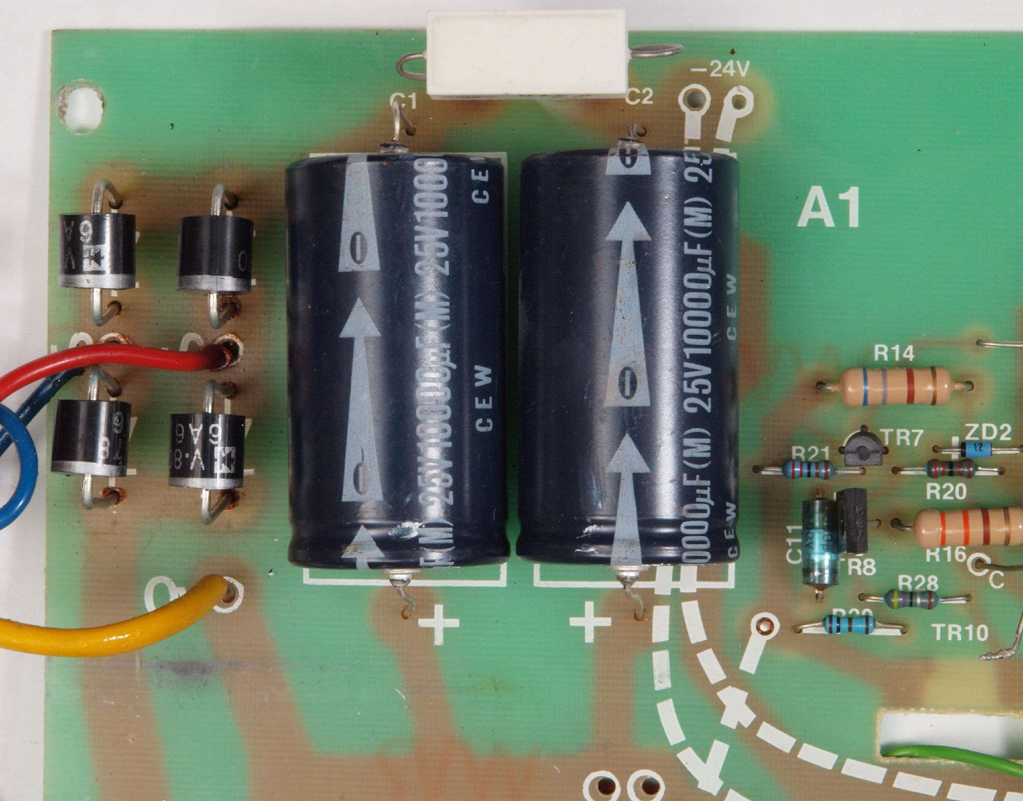 C82. 修理後 −側電源基板。 電解コンデンサーは10000μから15000μへ増量交換。