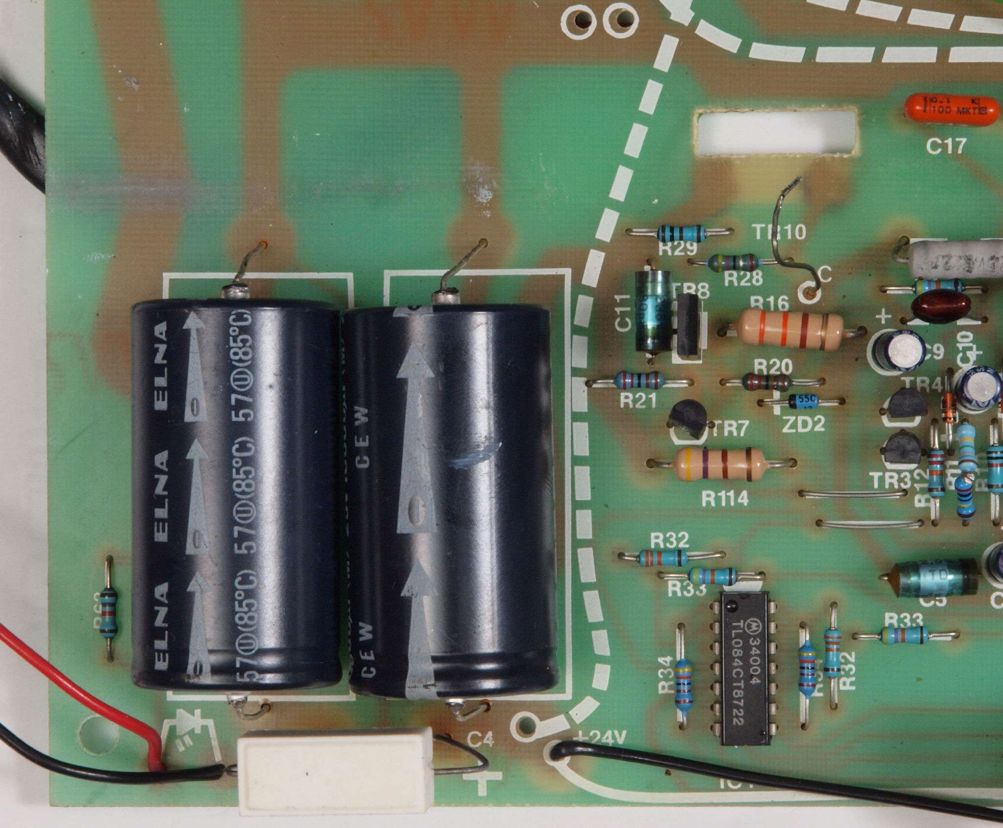 C72. 修理後 電源基板。 電解コンデンサー4個交換、フイルムコンデンサー4個追加。