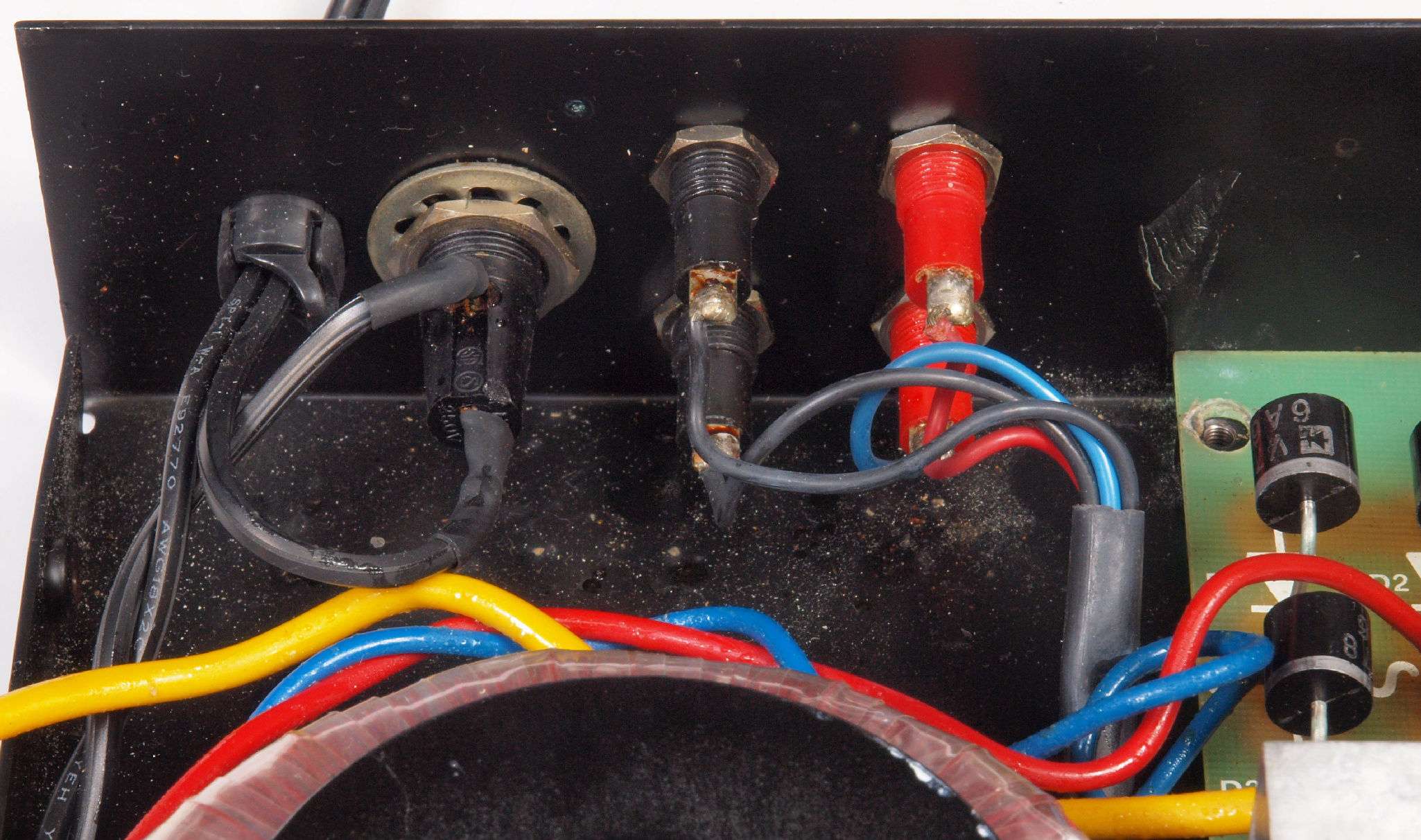 CB3. 修理前 入出力RCA端子裏。 RCA端子ブロックにヒビが有る。