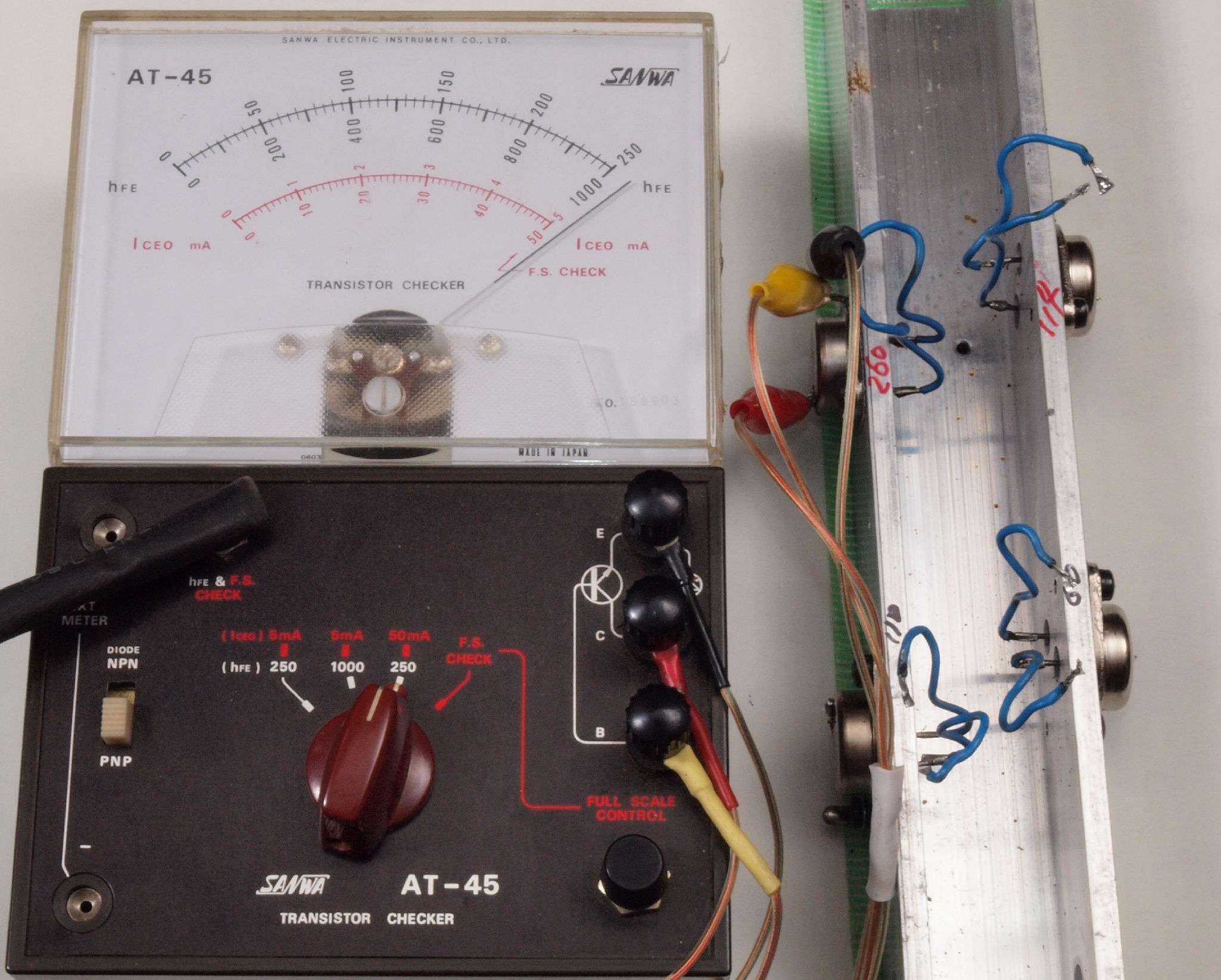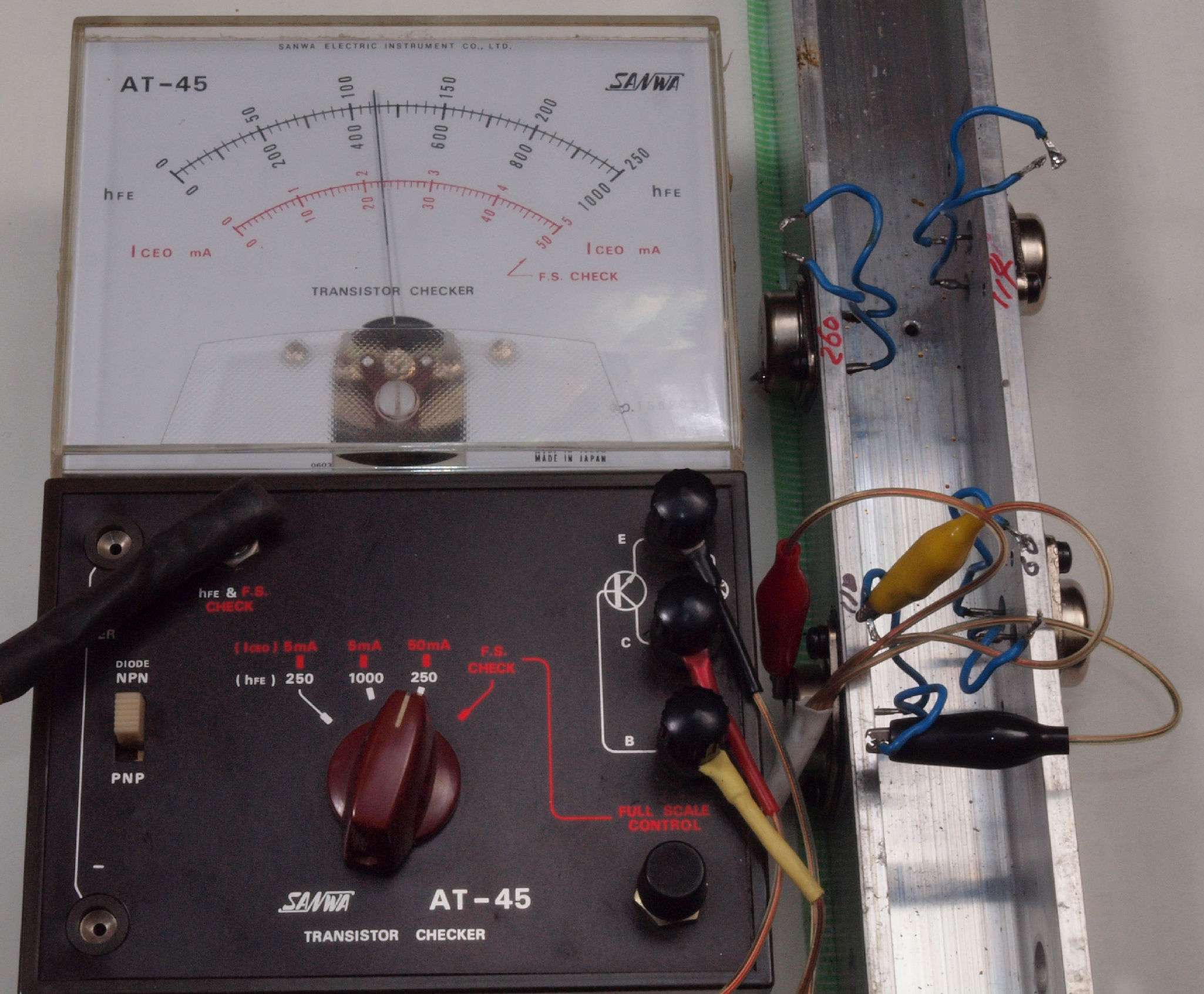 T4. 修理中 R側2SA終段TR(トランジスター)測定、hfe=115