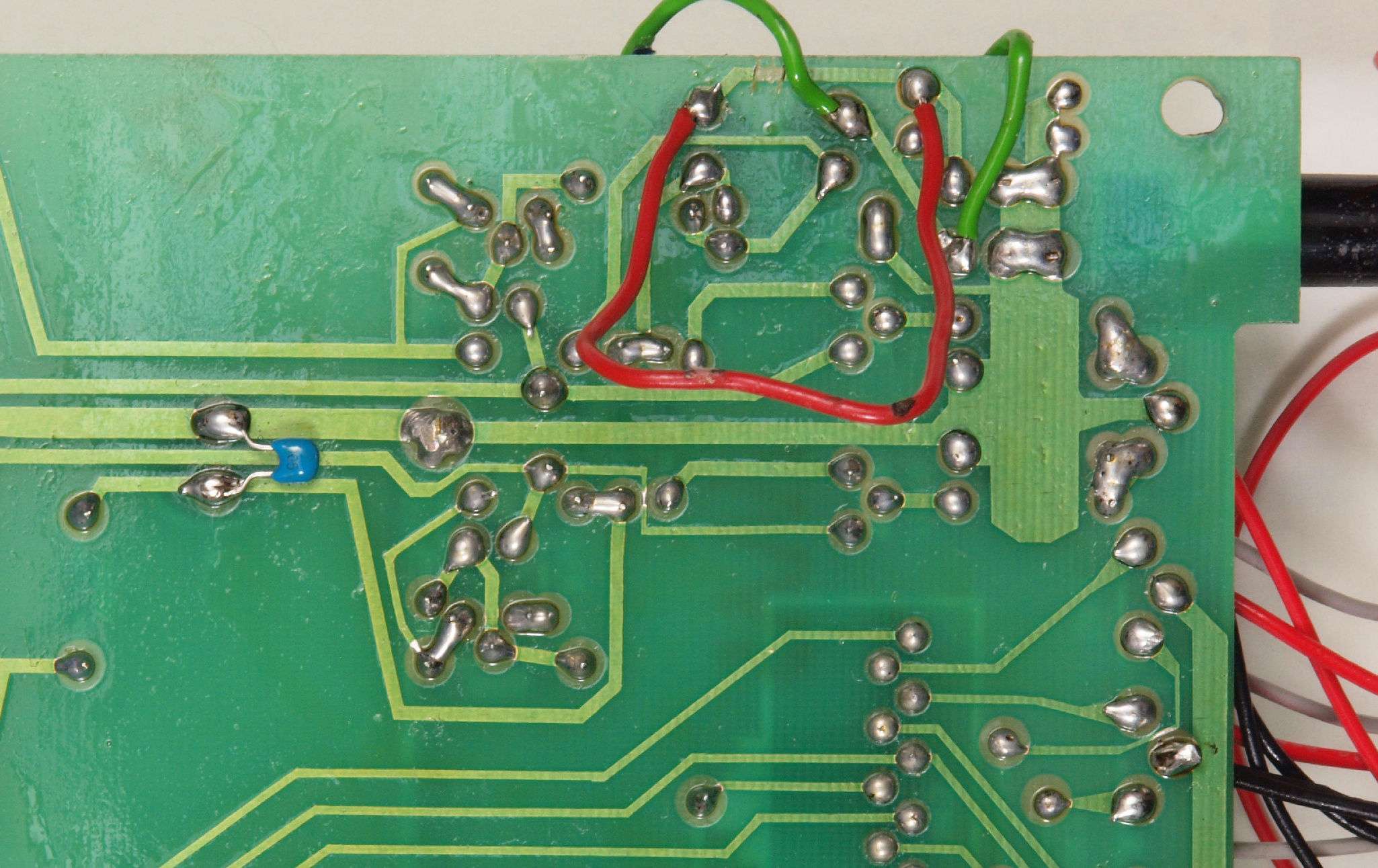 C64. 修理(半田補正)後  MC基板裏、 半田を全部やり直す。 フイルムコンデンサー1個追加。
