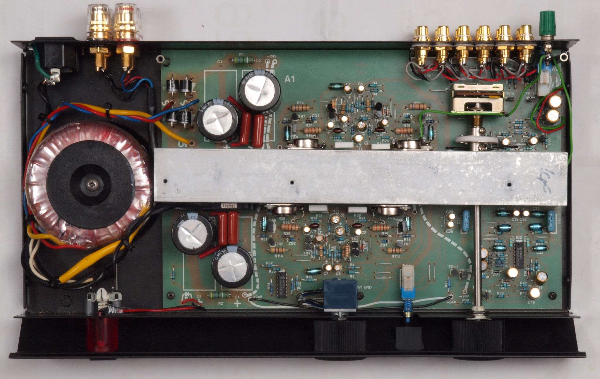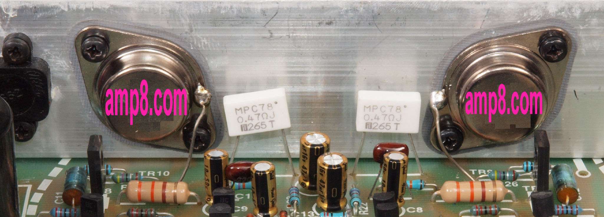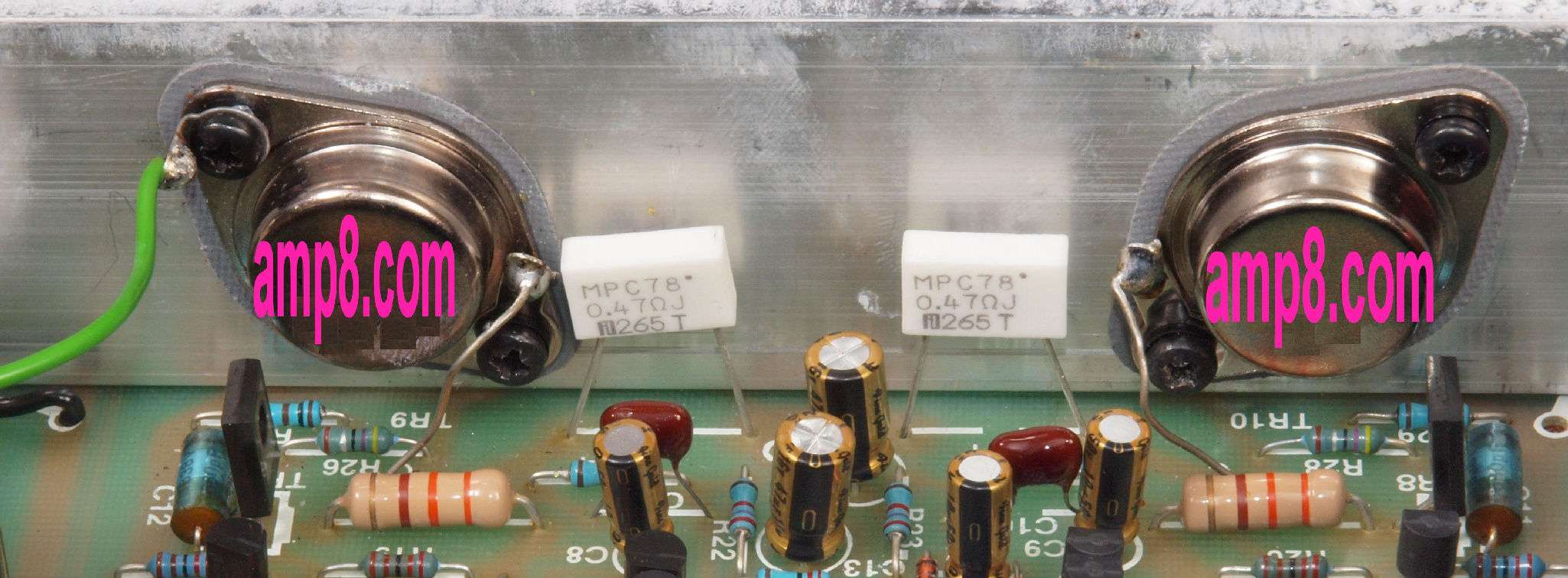 A71. 終段TR(トランジスター)のエミッター抵抗(低歪タイプ)は測定して選別使用。福島双羽電機(株)製。