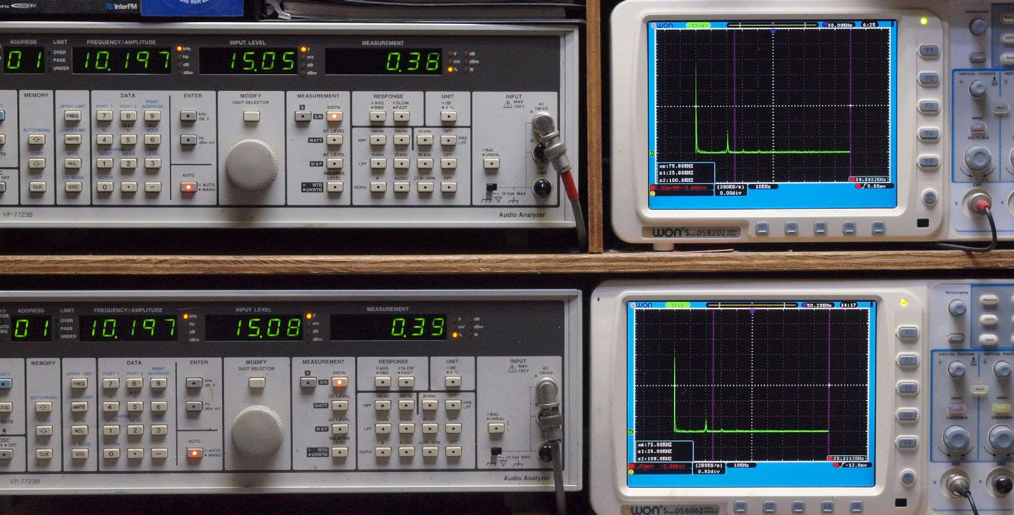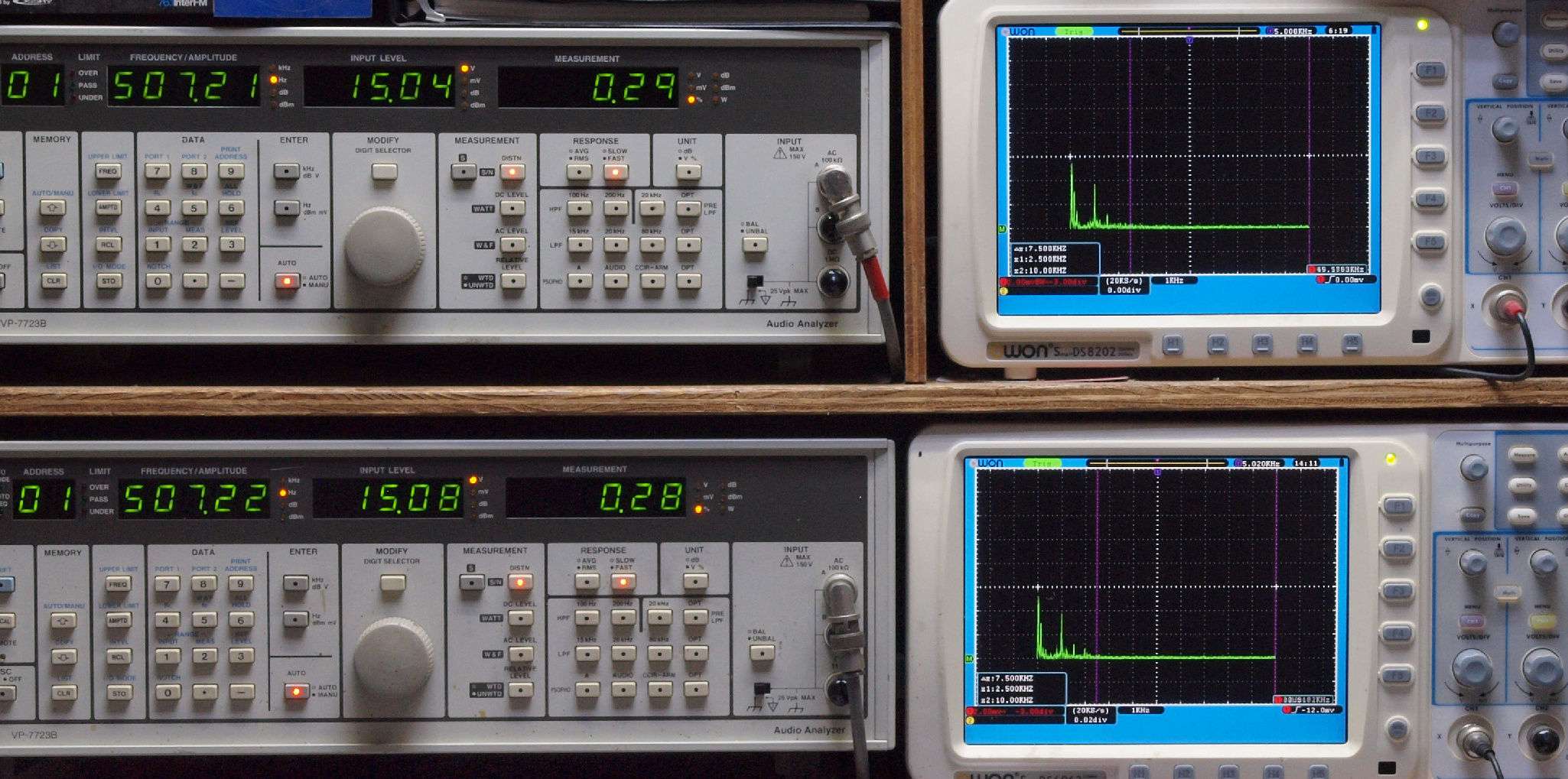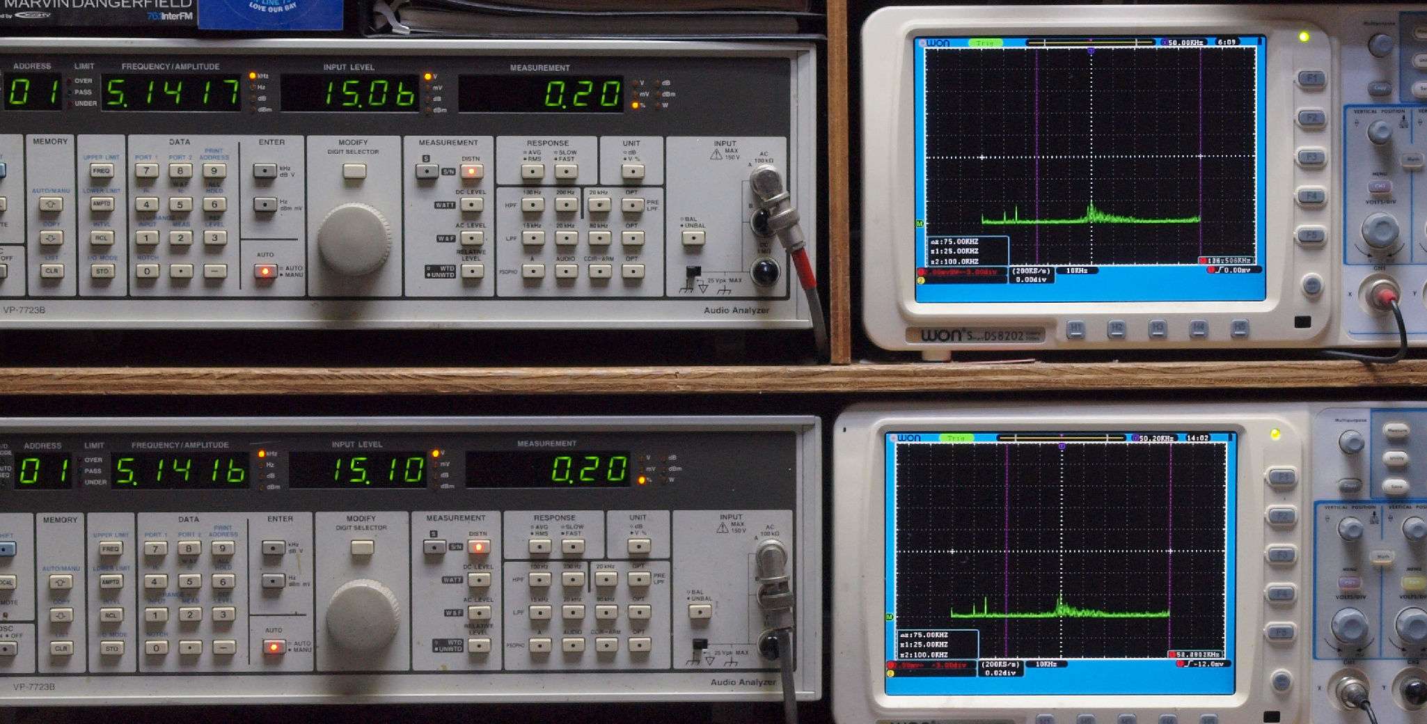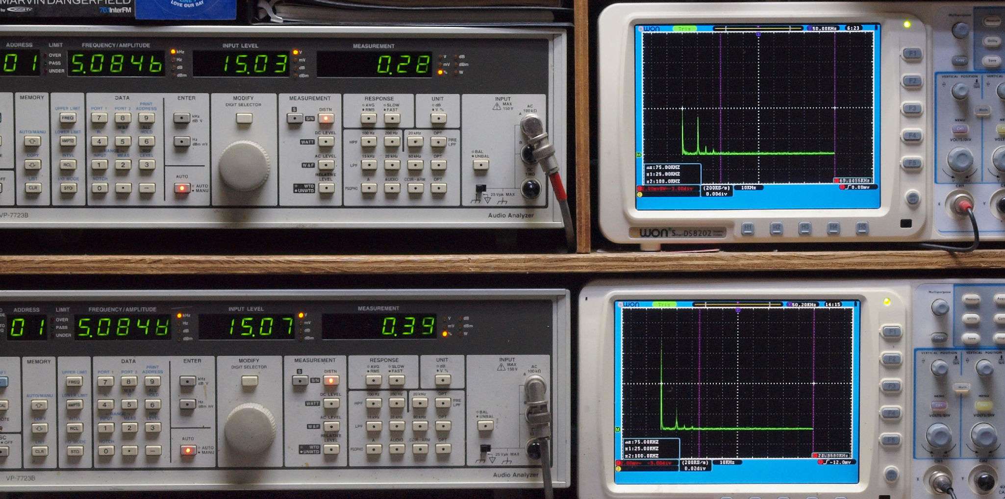 上段右端 VP−7723Bの基本波除去出力を「owon SDS8202(200MHZ)」で「FFT分析」表示。